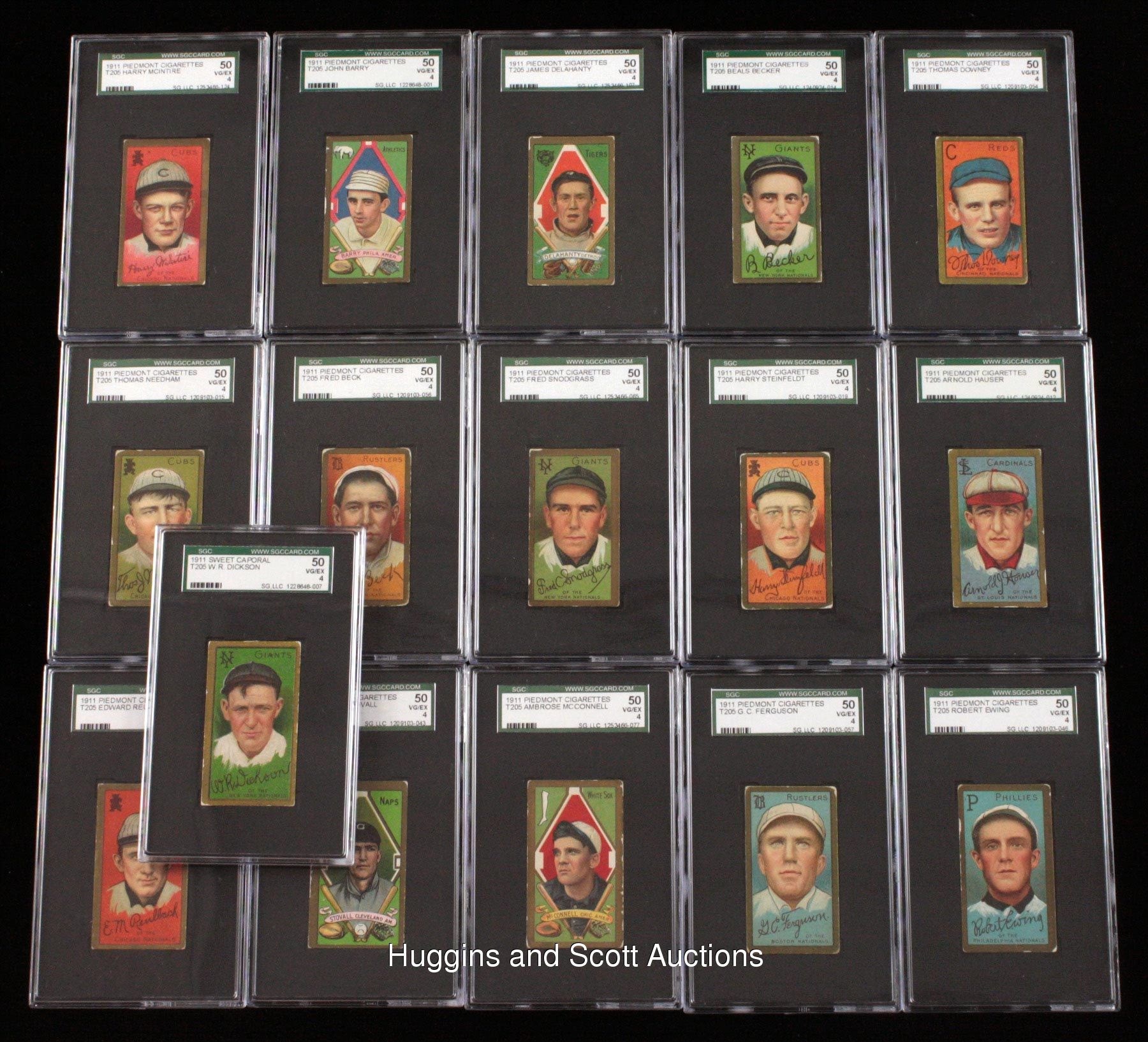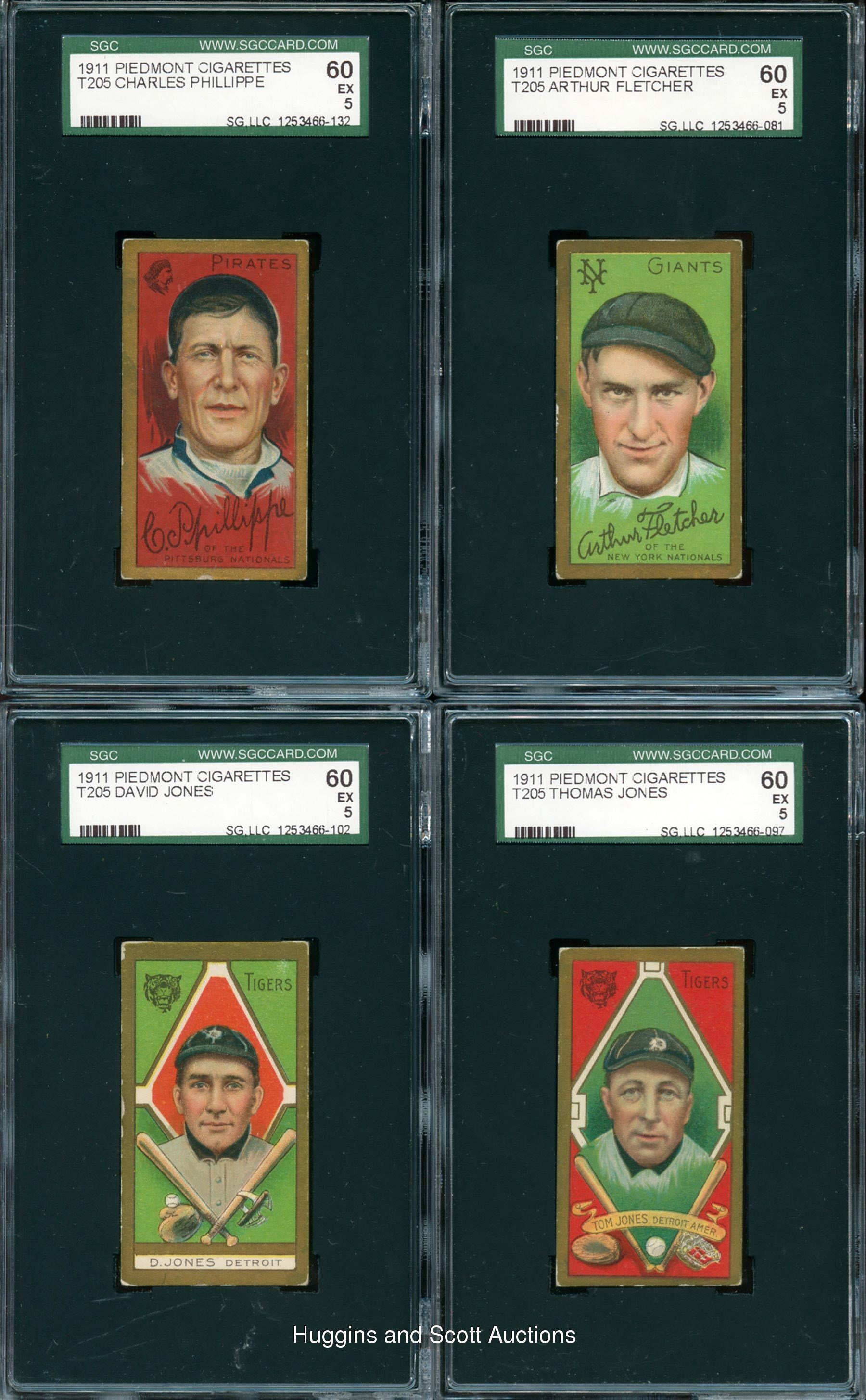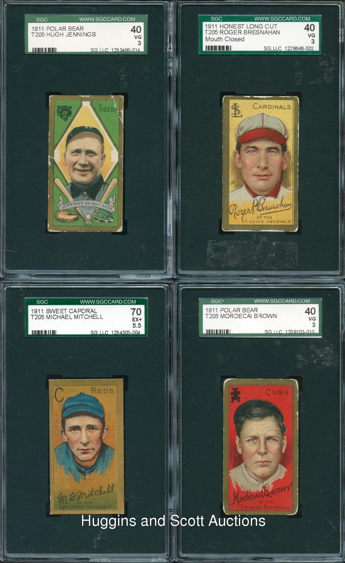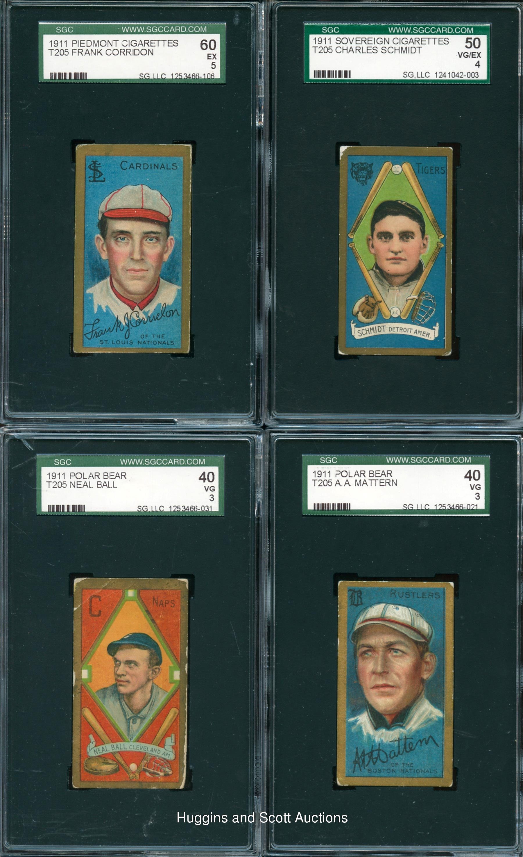 Featured is a sizable group of (42) 1911 T205 Gold Border SGC graded cards with a quartet of Hall of Famers. Unless noted, each of these ornate singles displays a common advertising back. Included are SGC 70: Mitchell; SGC 60: (8 cards) with Corridon, Fletcher, D. Jones, T. Jones, Krause, O’Leary, Phillippe, Sharpe (Polar Bear); SGC 50: (19 cards) with Barry, Beck, Becker, Delahanty, Dickson, Downey, Ewing, Ferguson, Hauser, Kroh, LaPorte, McConnell, McIntire, Needham, Reulbach, Schmidt (Sovereign), Snodgrass, Steinfeldt, Stovall; SGC 40: (14 cards) with Ball (Polar Bear), Bresnahan (Mouth Closed, Honest Long Cut), M. Brown (Polar Bear), Corridon, Downey, Fromme, Jennings (Polar Bear), D. Jones, Mattern (Polar Bear), McGraw, Needham, Schulte, Steinfeldt and Titus.