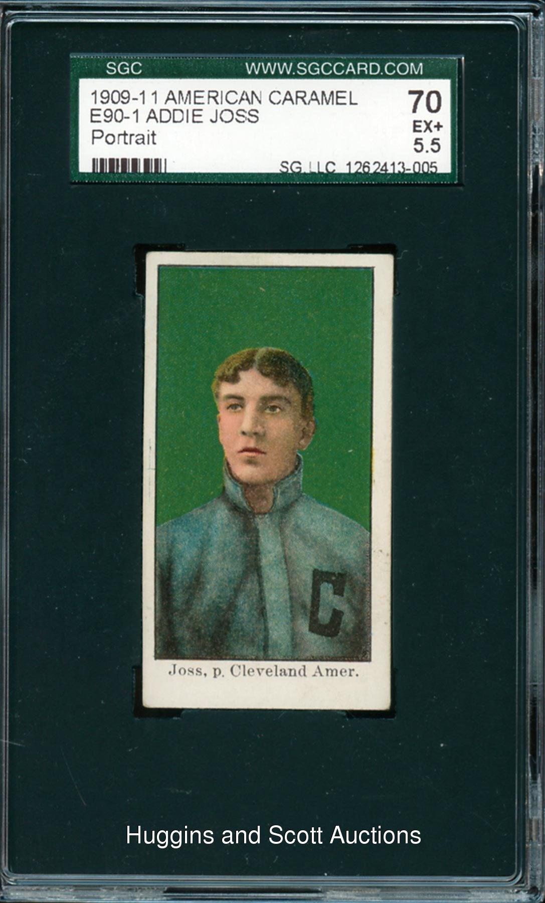 Graded 70 EX+ 5.5 by SGC. Featured is a captivating 1909-11 E90-1 American Caramel Addie Joss portrait. Of the 89 copies reported to the third-party service, this rendering of the Cleveland ace is the lone resident at the assigned tier with only one better. The ill-fated Joss emerges from a Kelly green backdrop with well-defined corners and a relatively clean reverse.