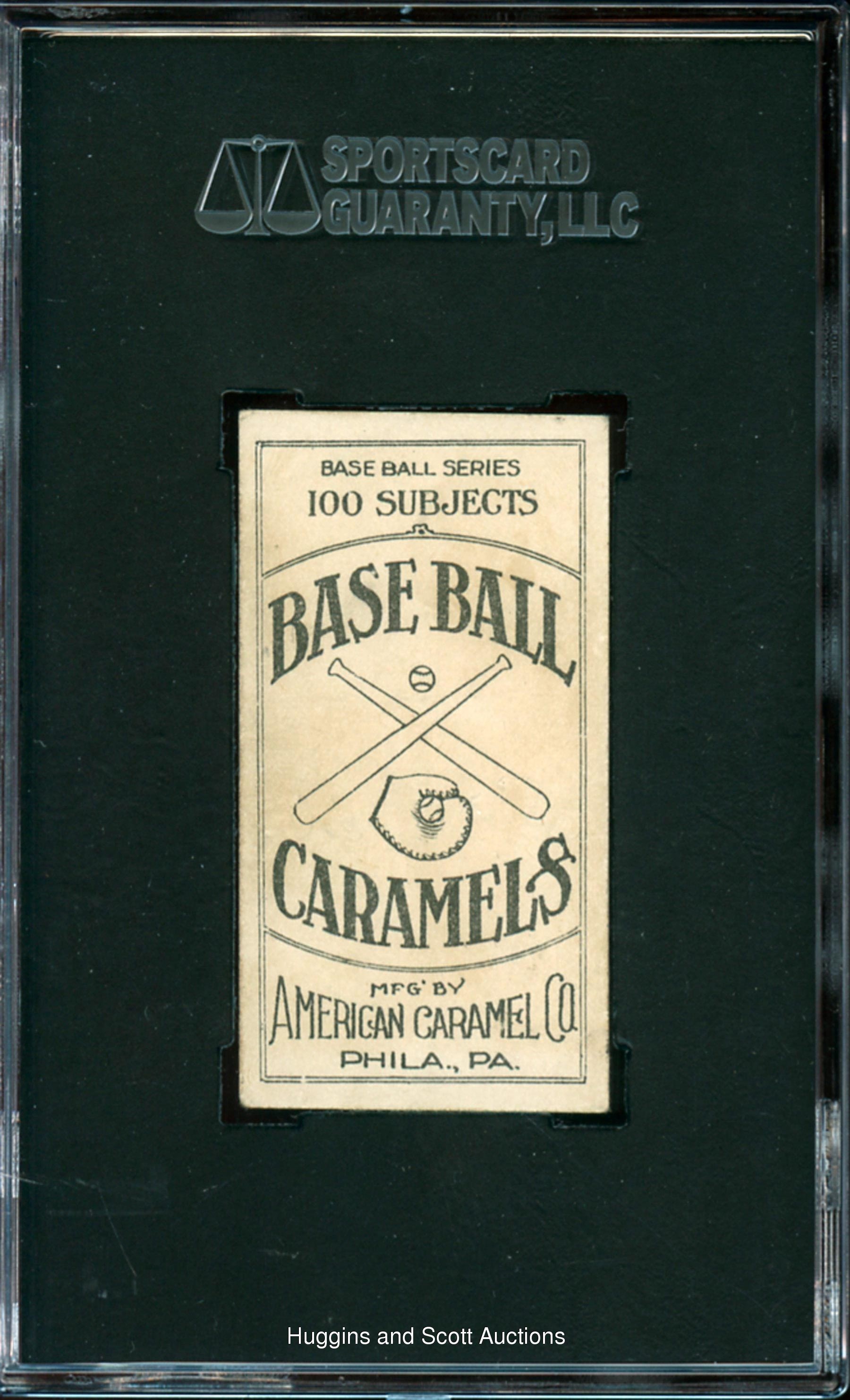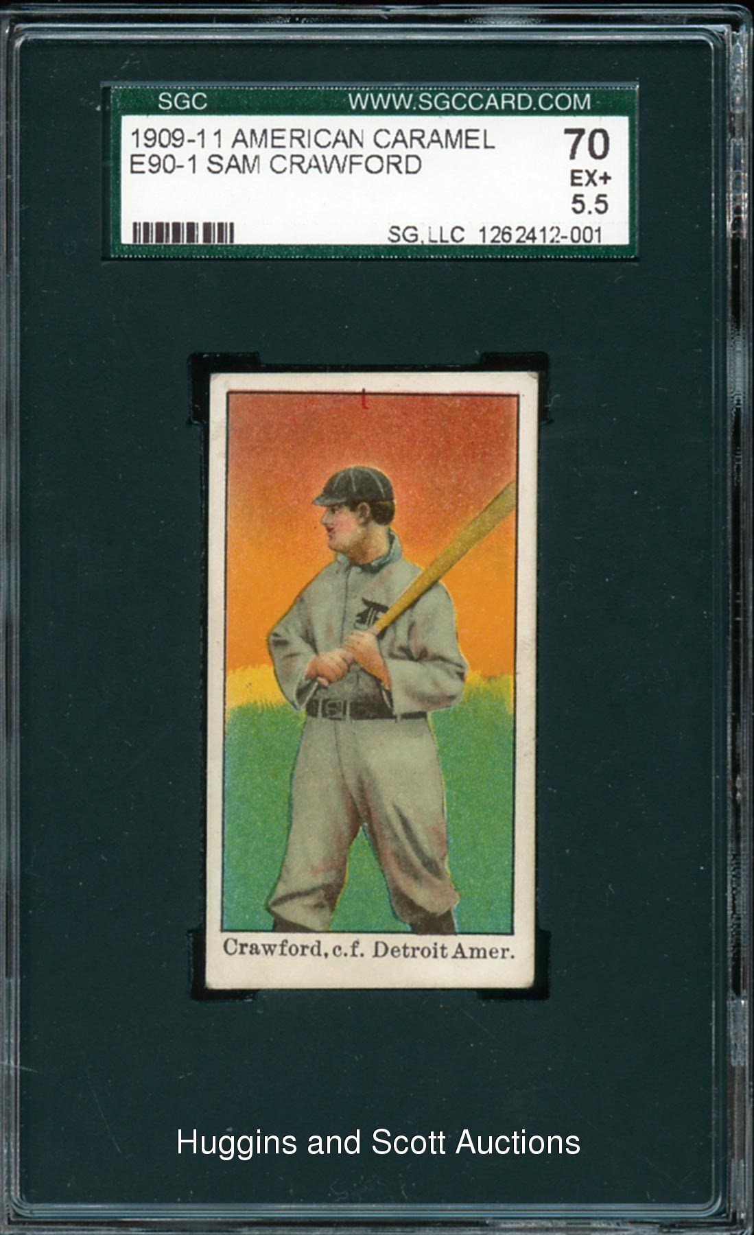 Graded 70 EX+ 5.5 by SGC. Offered is a 1909-11 E90-1 American Caramel Sam Crawford. The Wahoo, Nebraska native is brilliantly captured against a tri-color dusk backdrop as he bats. Despite slightly touched corners and edges along with a diamond cut, this Crawford still resides in the upper eighty-ninth percentile of all similar copies judged.