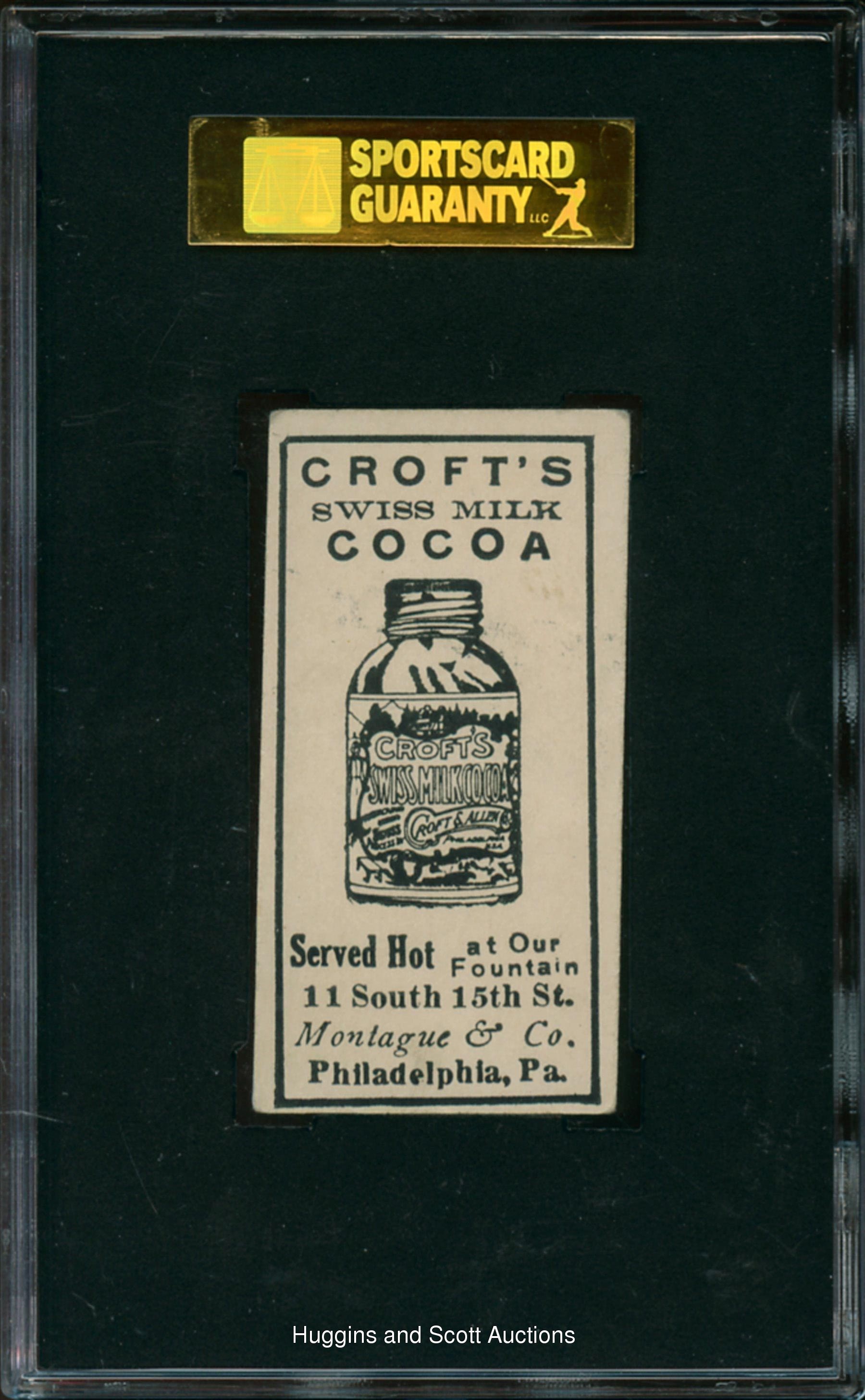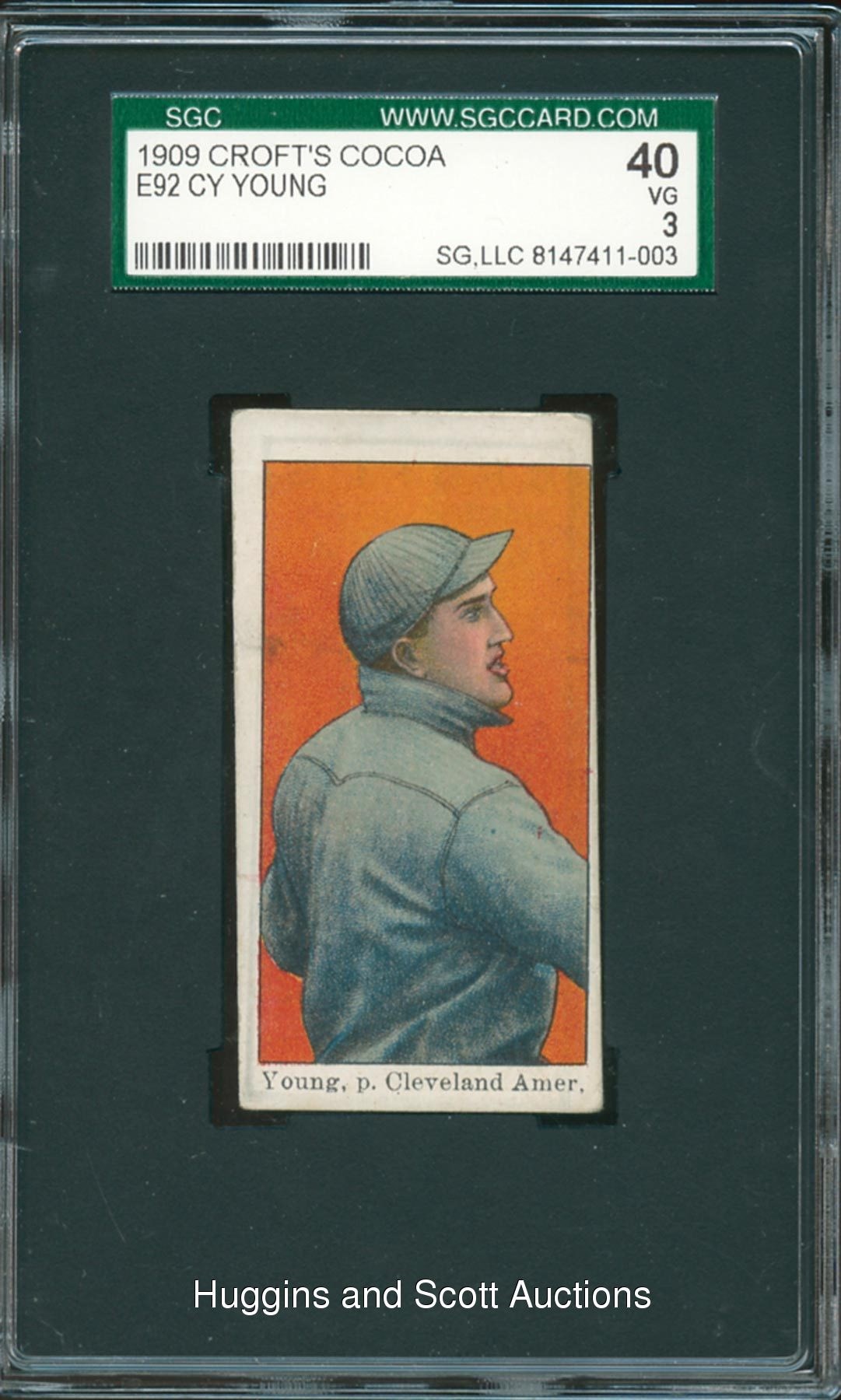 Graded 40 VG 3 by SGC. Featured is a delicate 1909 E92 Croft’s Cocoa Cy Young. The obverse of this Hall of Fame Type card displays askew centering associated with the issue. The reverse is problem-free and exhibits the advertising illustration for the soda concoction with remarkable clarity. The hurler emerges from a piercing orange backdrop that is free of any creases or obstructions.