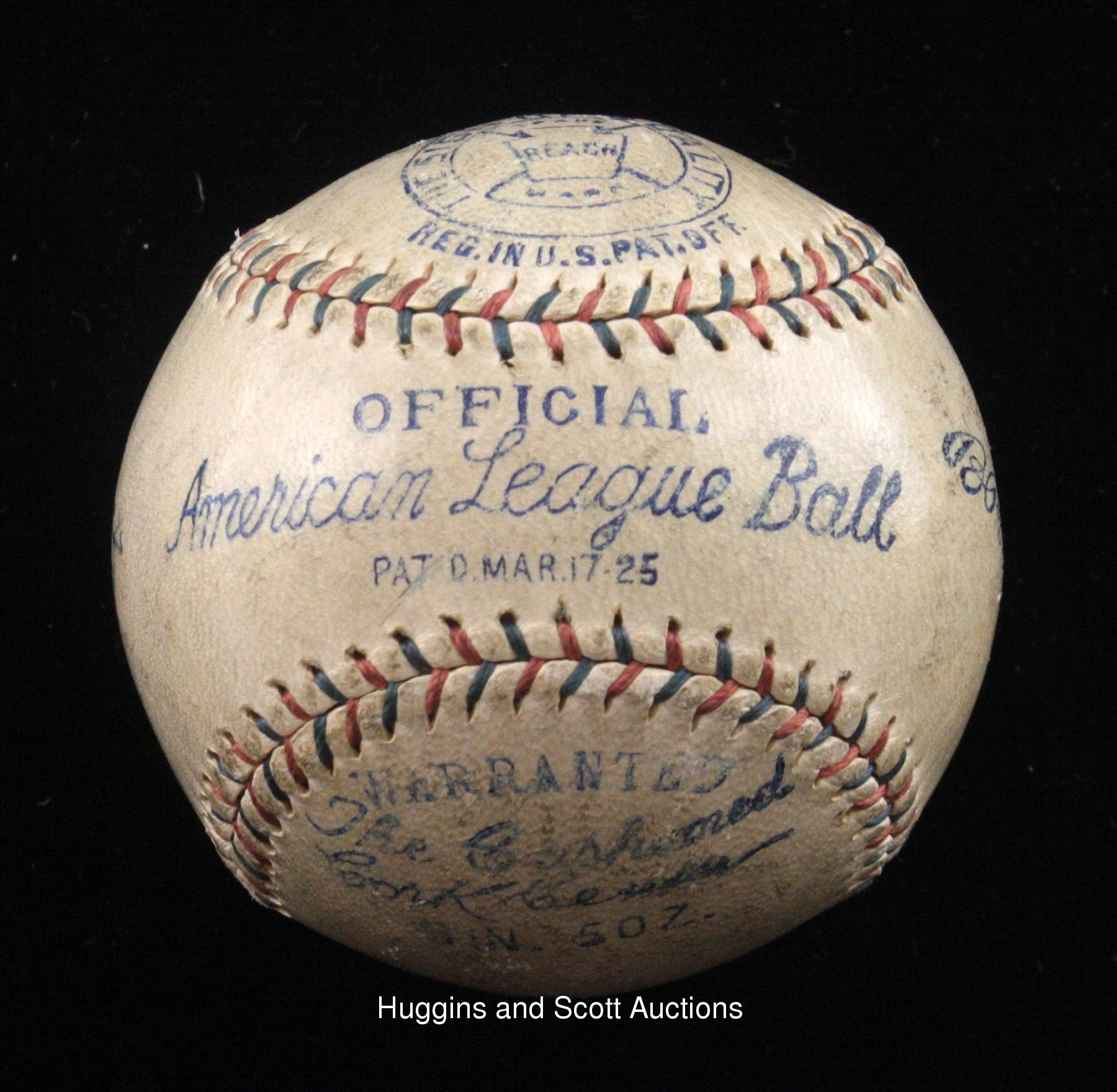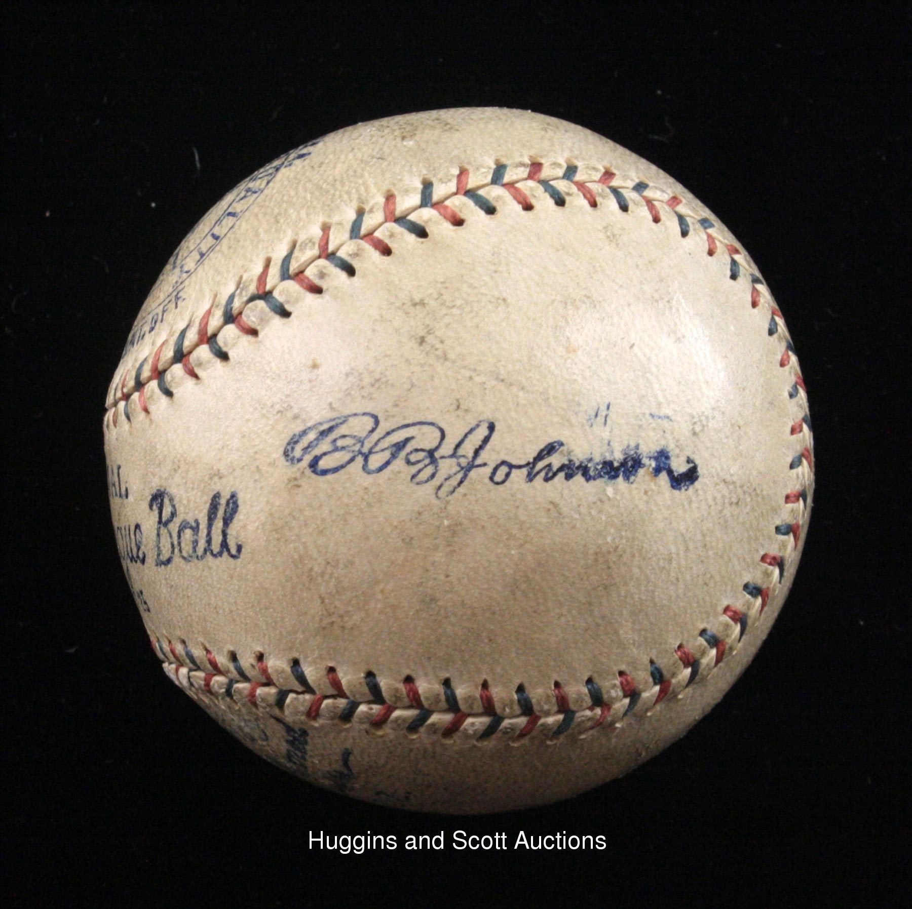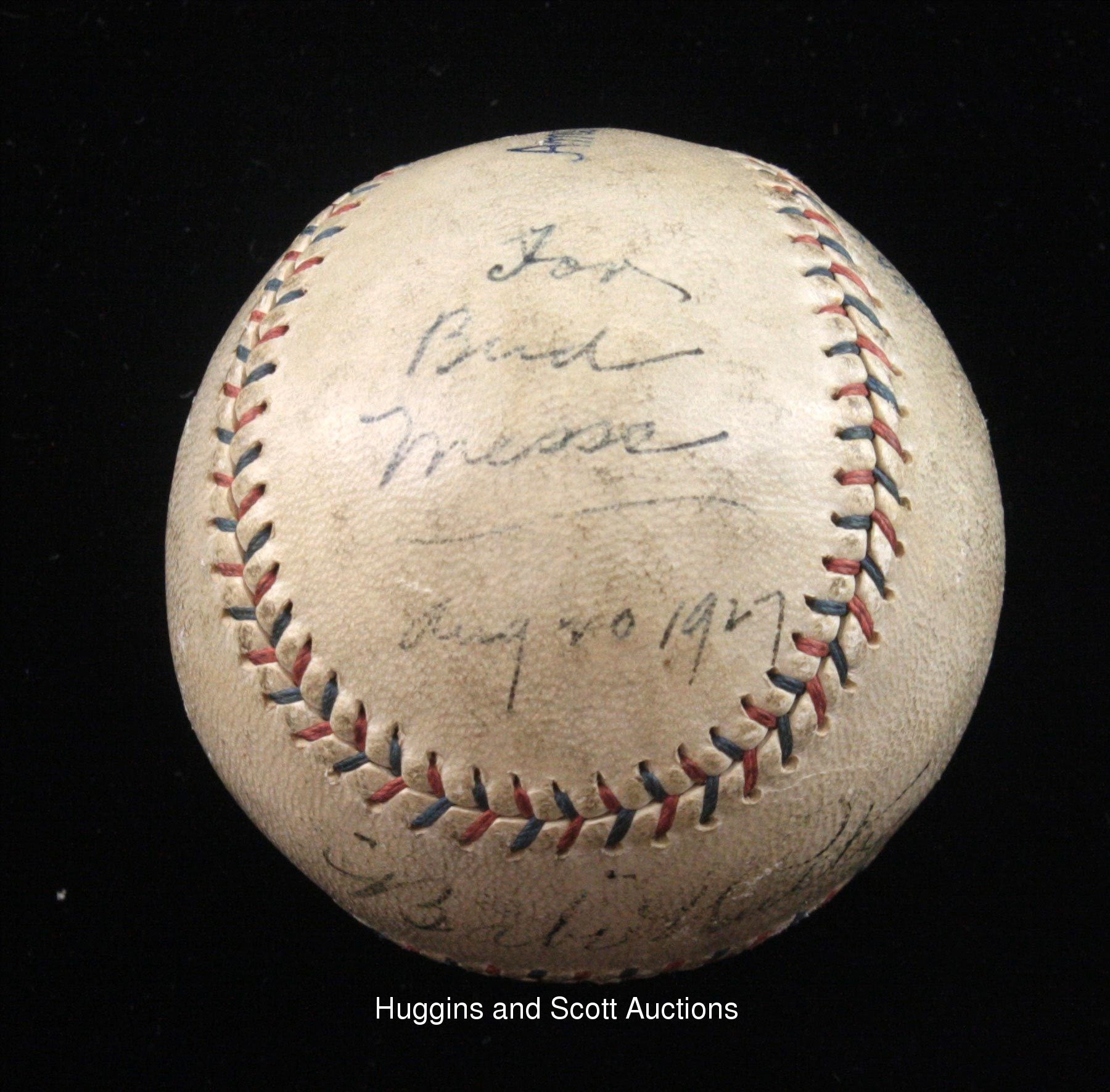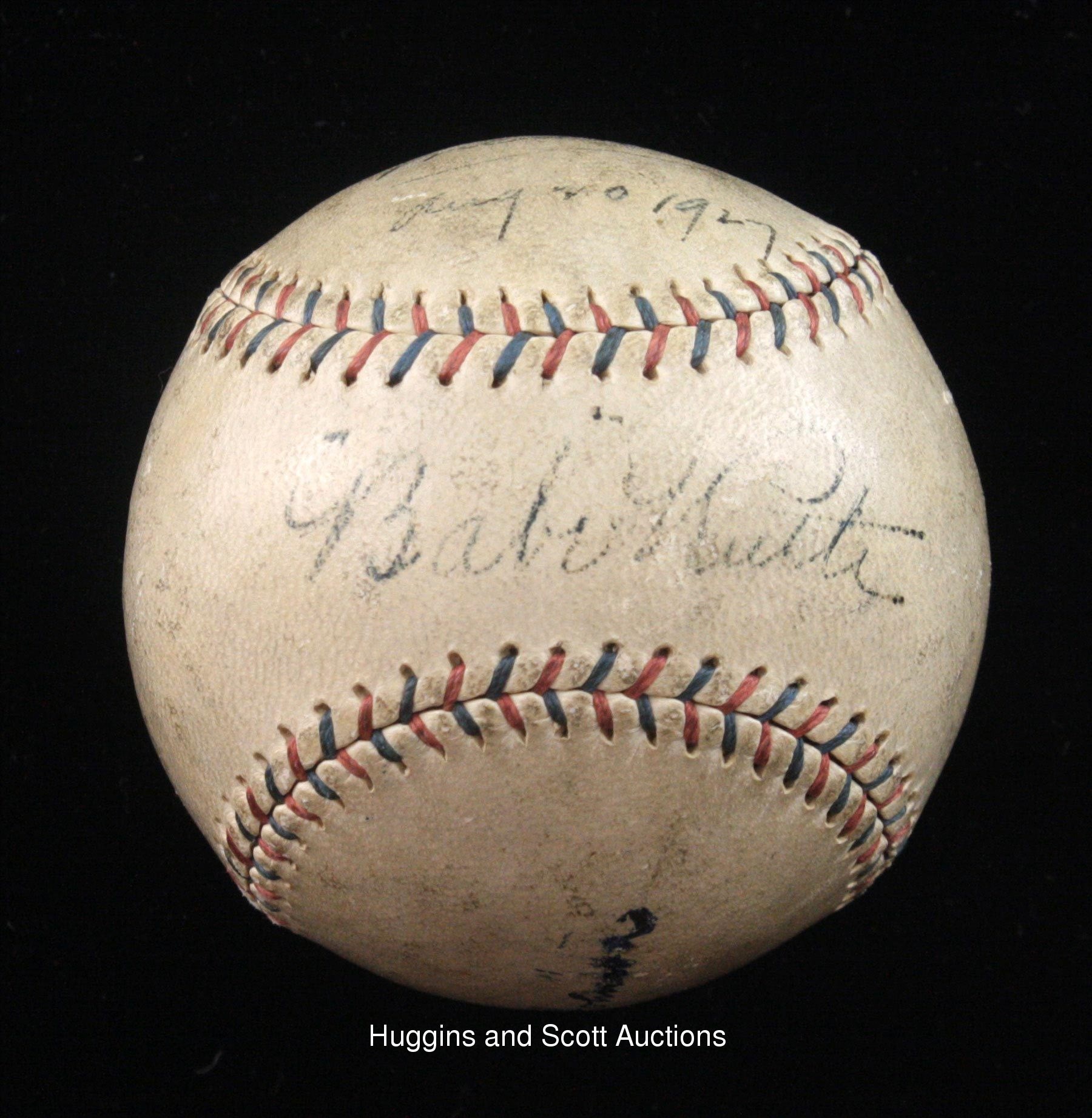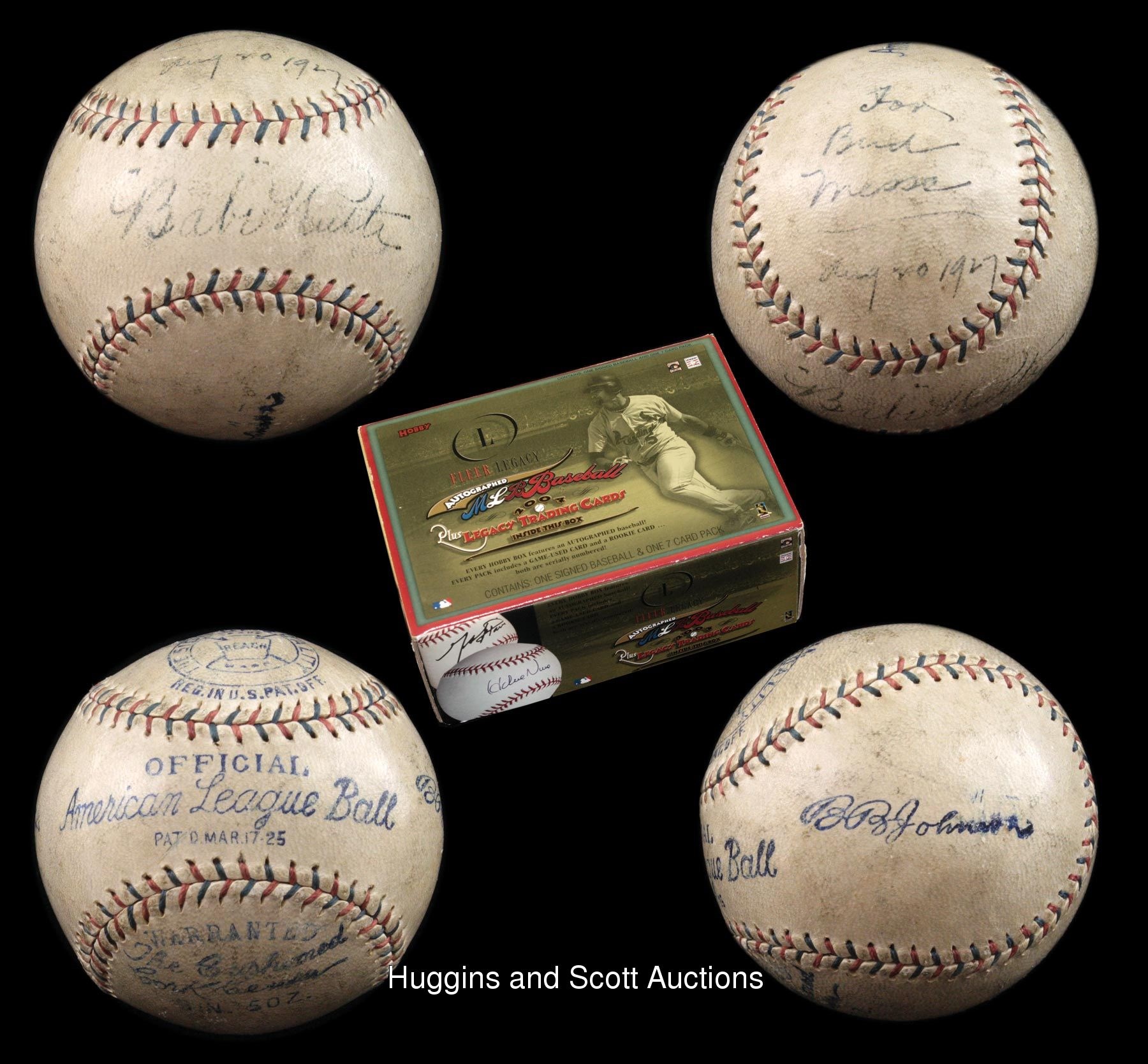 As the most fearsome slugger on Murderers’ Row, George Herman Babe Ruth embarked on a scathing reign of terror on American League pitching staffs in 1927. The Baltimore-bred icon batted .356, clubbing an unprecedented 60 home runs and achieving a breathtaking 1.258 OPS. So dominant was “The Bambino” in 1927, the southpaw belted four more home runs than any other American League team. Upon eclipsing his own 1921 record, the charismatic Ruth proudly exclaimed "Sixty, count 'em, sixty! Let's see some son-of-a-bitch match that!" Despite the braggadocio, Ruth was always eager to please his adoring young fans. Inscribed “For Bud Messe-August 20 1927” (not in Ruth’s hand), the offered Babe Ruth (d.1948) single-signed baseball is a cornerstone collectible. The blue-and-red-stitched OAL Johnson sphere presents (“6-7”) with uniform aging and bold, blue trademark stampings (slight bleeding on Johnson's surname). The precisely placed 2-1/2” black steel-tip fountain pen endorsement displays mild age-induced fading but still registers a (“6-7”) signature quality. On the attributed date, Ruth sent an unfortunate Jake Miller pitch into the bleachers for his 39th round tripper of the season. Interestingly, the “greatest team ever” assembled was swept at Cleveland en route to a season-long four game losing streak. This historic orb was “pulled” from the 2004 Fleer Legacy product, serving as the “grand prize” for the high-end series that featured one signed baseball along with seven additional cards per hobby box. It is difficult to envision the euphoria that the collector who pulled this sphere experienced (original box that ball came in is included). In an industry where provenance plays such a preeminent role, this benchmark piece is truly “second to none.” Full photo LOA from JSA.