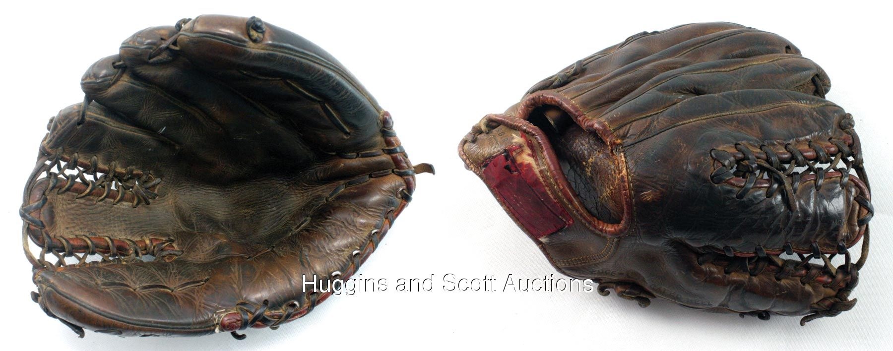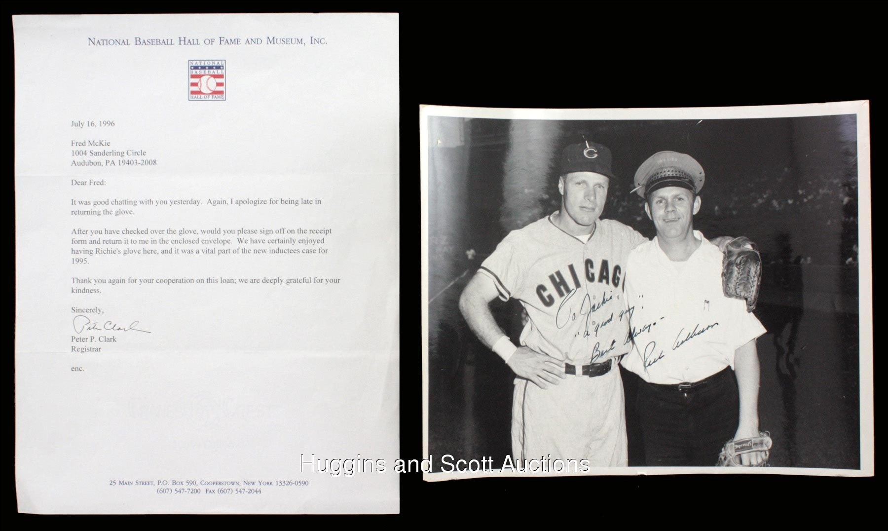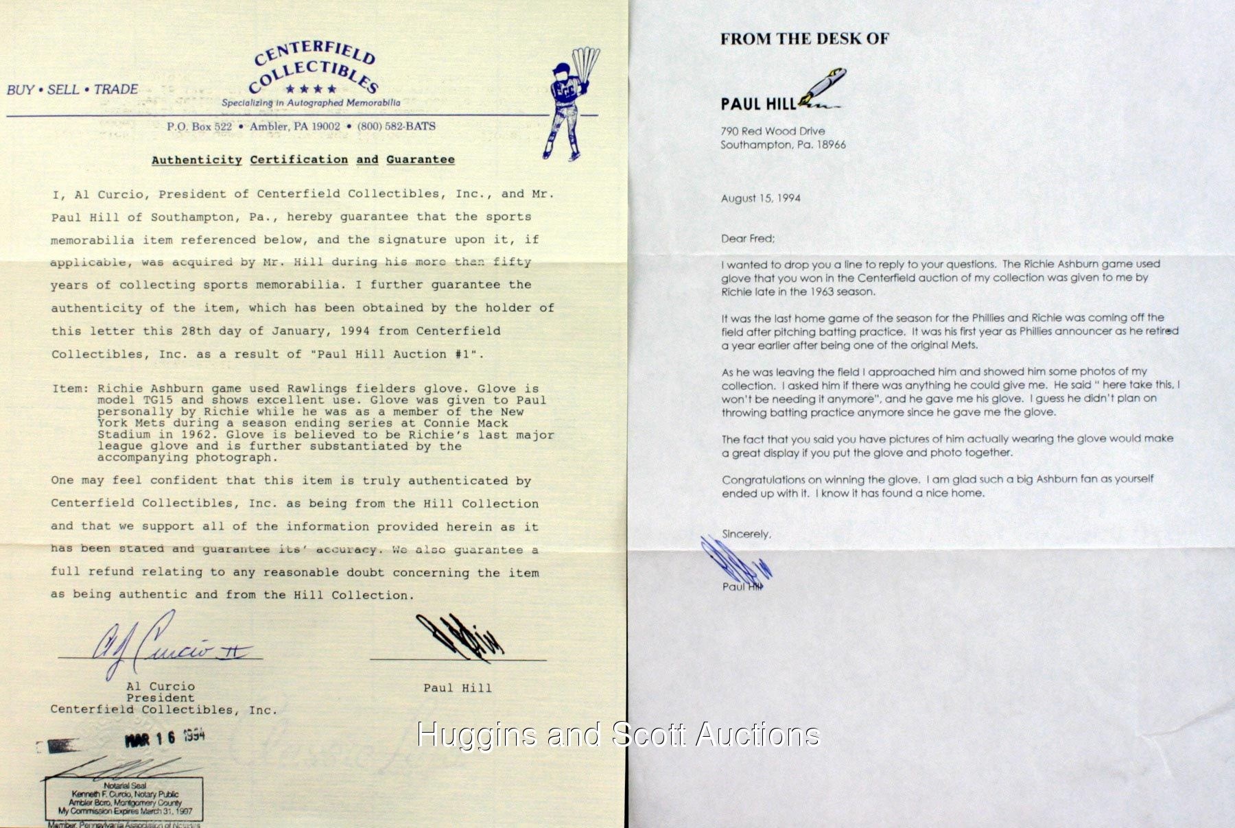 Richie Ashburn is considered one of the best defensive outfielders of the 1950s as well as one of the best leadoff hitters of all-time. Offered is a genuine rarity for collectors, a 1962 Richie Ashburn game-used Rawlings baseball glove. To describe this magnificent piece as museum quality is an understatement because it has already been on display at the highest level – this glove was in the 1995 Hall of Fame Induction display for over a year between 1995 and 1996. It is hard to imagine how Ashburn used such a small glove to shag so many fly balls, but this Rawlings TG15 model glove is the real deal. Heavy use is present, as is a vintage replacement of the leather straps from Ashburn's playing days. Most game-used gloves are often re-threaded by the players or equipment managers to tighten the pocket after years of wear. The artifact comes with solid provenance including a letter from the Baseball Hall of Fame (returning the glove to the man who loaned it for display), (2) photographs of Ashburn wearing the glove during his playing days (one with the Cubs and one with the Mets), (2) 4x6 photographs of the glove on display at the Hall of Fame, a notarized letter from an auction house that first sold the piece and a letter from renowned collector Paul Hill describing how he first obtained the relic (see our website for further details from this letter). Unlike game-used bats, dozens of which are used within a single-season, gloves are treasured by the men who wear them and usually used for many years. This is an incredible opportunity to obtain a rarity in the collector’s world, a Hall of Famer’s game-used glove with clear provenance. The letter from Paul Hill discusses how he met Richie Ashburn in late 1963. Ashburn was throwing batting practice for the Phillies (he was working for the club as an announcer) after he had retired in 1962. A young Paul Hill asked Ashburn for something for his collection and Ashburn handed him the glove. The full letter is scanned below and you can read it in its entirety.Richie Ashburn owns six of the top ten seasons with the most putouts by an outfielder in Major League history and most likely used this glove during some of these seasons.