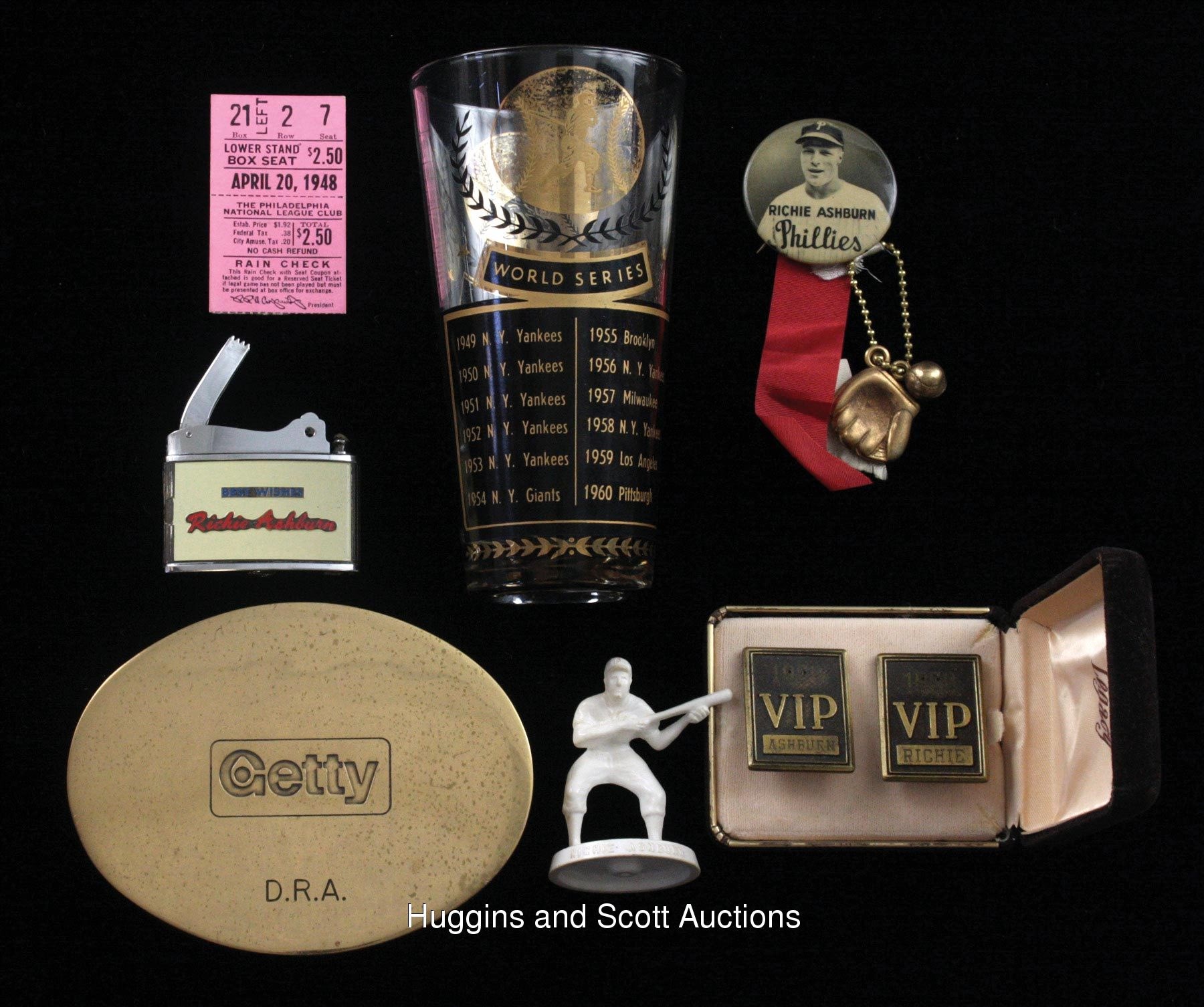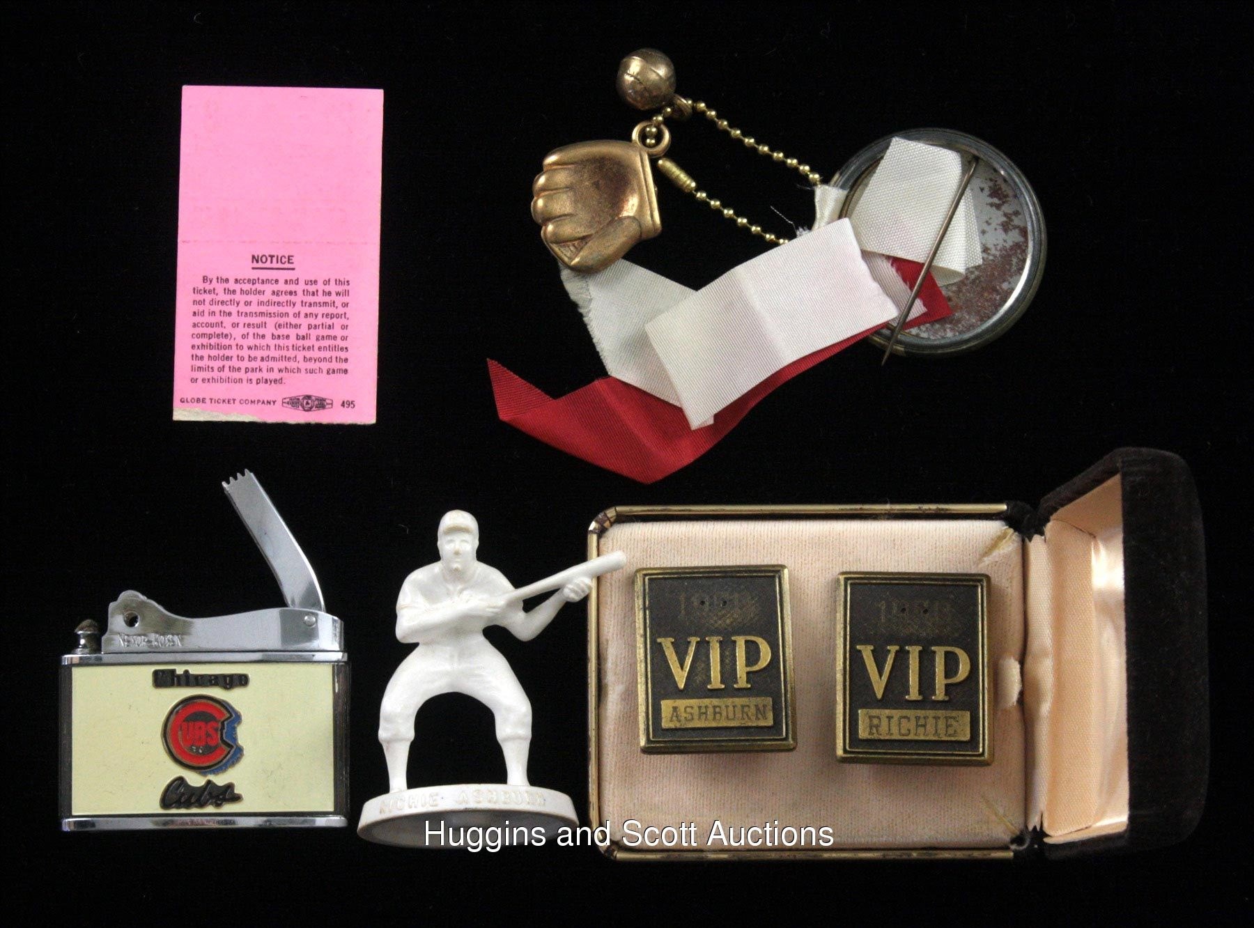 Presented are seven Richie Ashburn collectibles that are either scarce or unique. The items are 1.) ticket stub from Ashburn’s debut, April 20, 1948 (also Ashburn’s first hit); 2.1950s PM10 pin with ribbon and charm (NM); 3.) 1995 Robert Gould statue (EX); 4.) brass cufflinks with “Richie” on one and “Ashburn” on the other and 1950 VIP on both (VG-EX); 5.) 1960 Batting Champions glass (EX-MT, no chips); 6.) 5” oval jewelry box from Getty with Ashburn’s initials engraved on the cover (from the Ashburn estate); 7.) early 1960 lighter with “Chicago Cubs” on one side and “Best Wishes Richie Ashburn” on the other (NM).