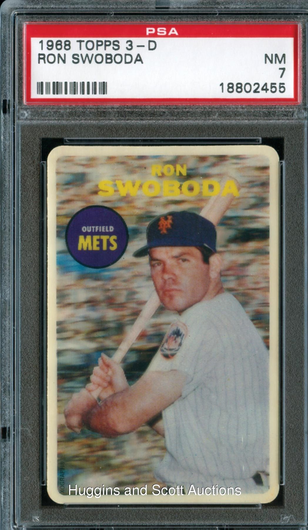 Graded NM 7 by PSA. Featured is a 1968 Topps 3-D Ron Swoboda sample. This challenging New York area issue displays strong corners and edges along with a vibrant color scheme. The blank reverse is clean.