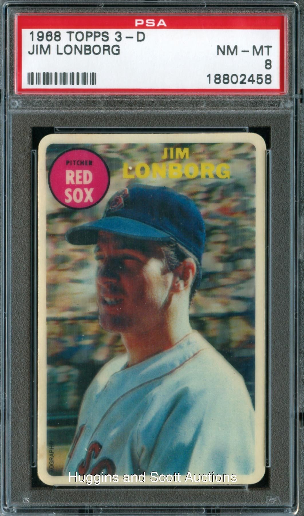 Graded NM-MT 8 by PSA. "Gentleman Jim" Lonborg presides on the offered 1968 Topps 3-D sample. This high-grade rendition of the former ace is properly centered with a problem-free surface and only a hint of discoloration along the bottom left edge.