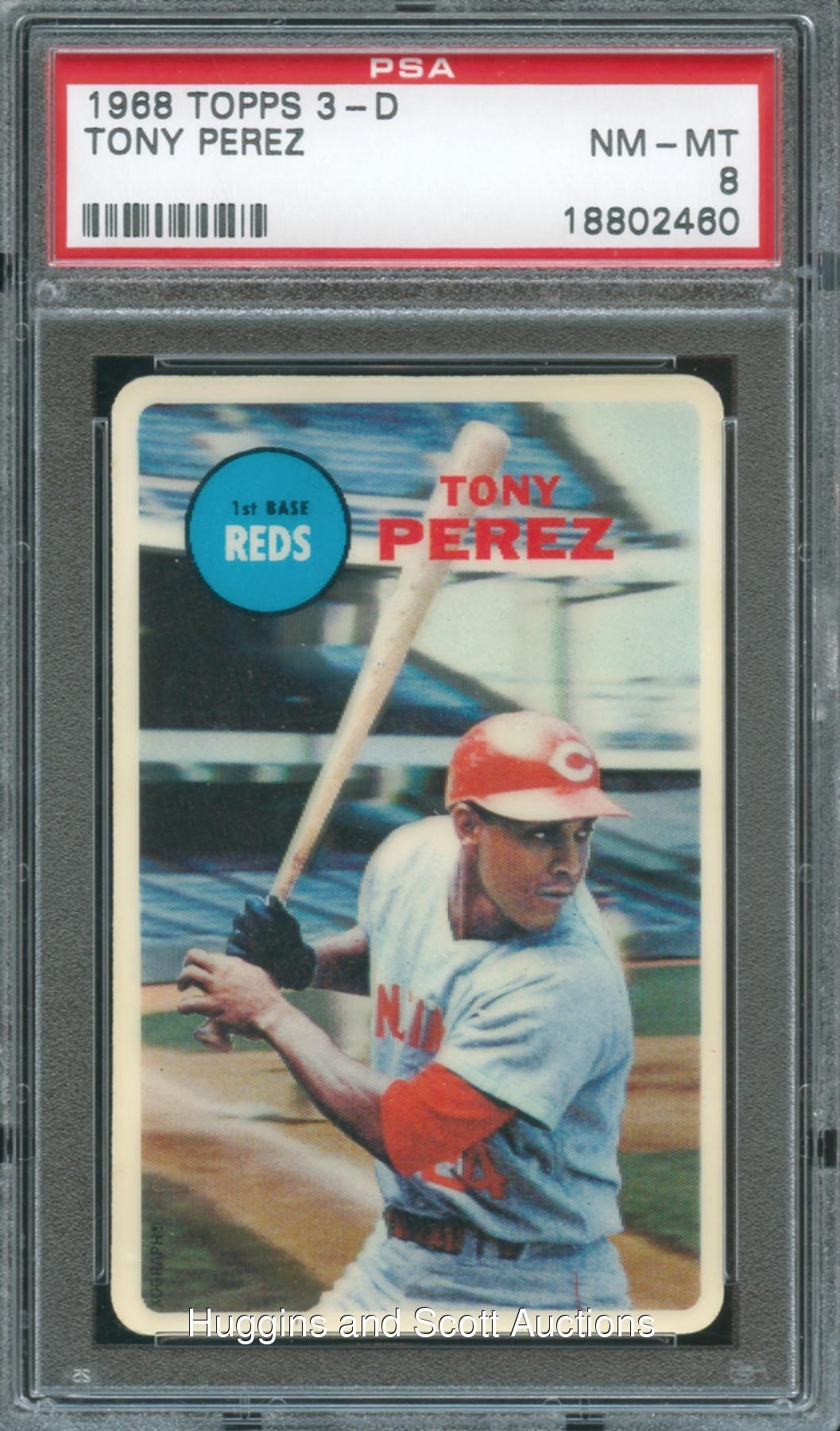 Graded NM-MT 8 by PSA. As one of two Hall of Famers in the coveted 1968 Topps 3-D edition, the offered Tony Perez is ideal for the Cooperstown specialist. This condition-sensitive XOGRAPH relic is free of any scratches and displays solid corners and a clean, blank reverse.