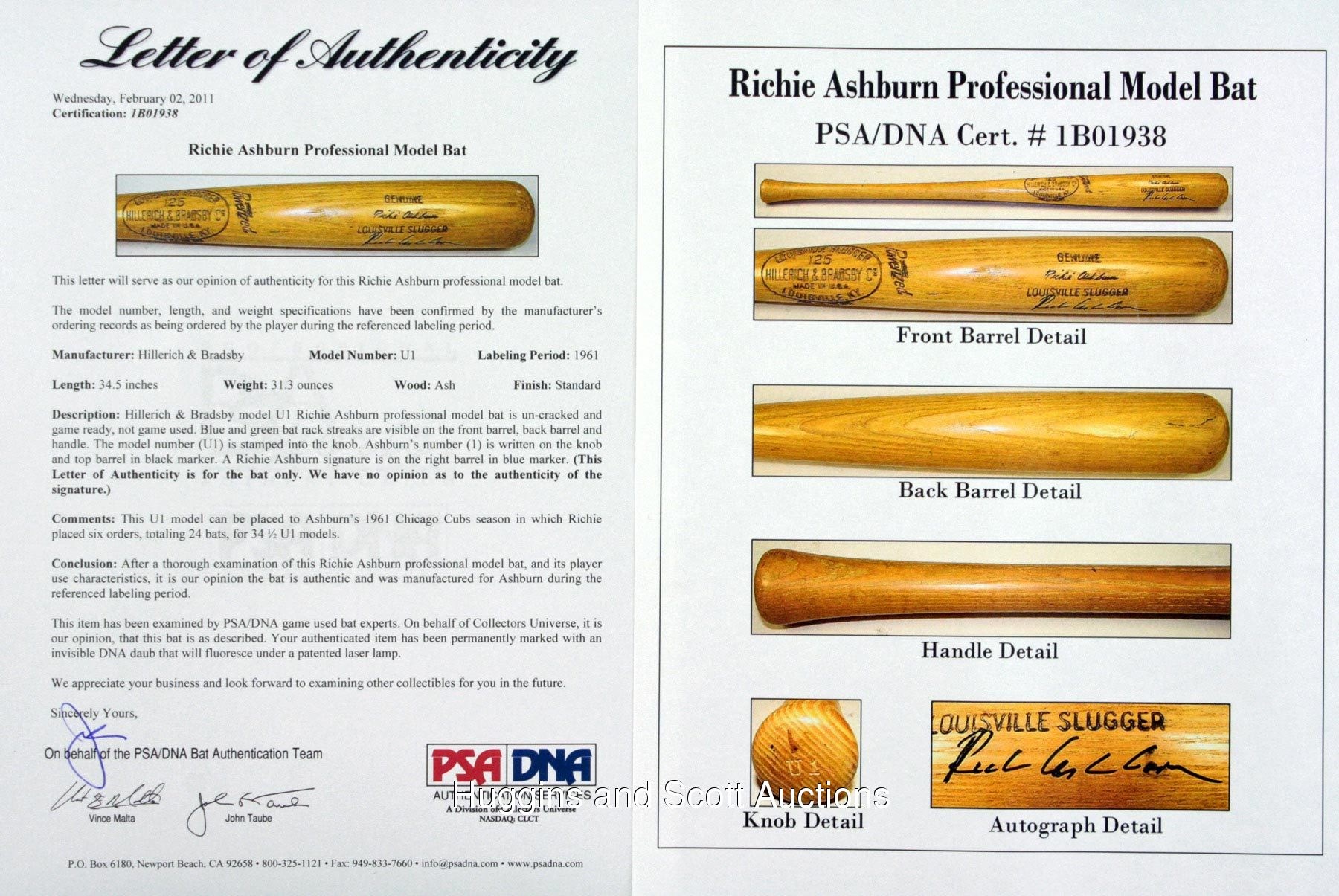 Having topped the Major Leagues with 1,875 hits during the 1950s, Philadelphia Phillies star Richie Ashburn was dealt to Chicago, where he was issued and autographed this game-ready bat. The Hillerich & Bradsby (31.3-oz/34-1/2”) “U1” signature model weapon is signed by Ashburn in black marker (“8” strength) just below the barrel stampings. The uncracked ash shows no game use and has bat-rack streaks throughout and a flare knob. The bat can be placed to Ashburn’s 1961 season, during which he placed six orders (totaling 24 bats) for 34-1/2” U1 models. Full photo LOA from John Taube, PSA/DNA (for bat only).PSA/DNA full photo LOA (for bat authenticity only) cert/hologram #1B01938