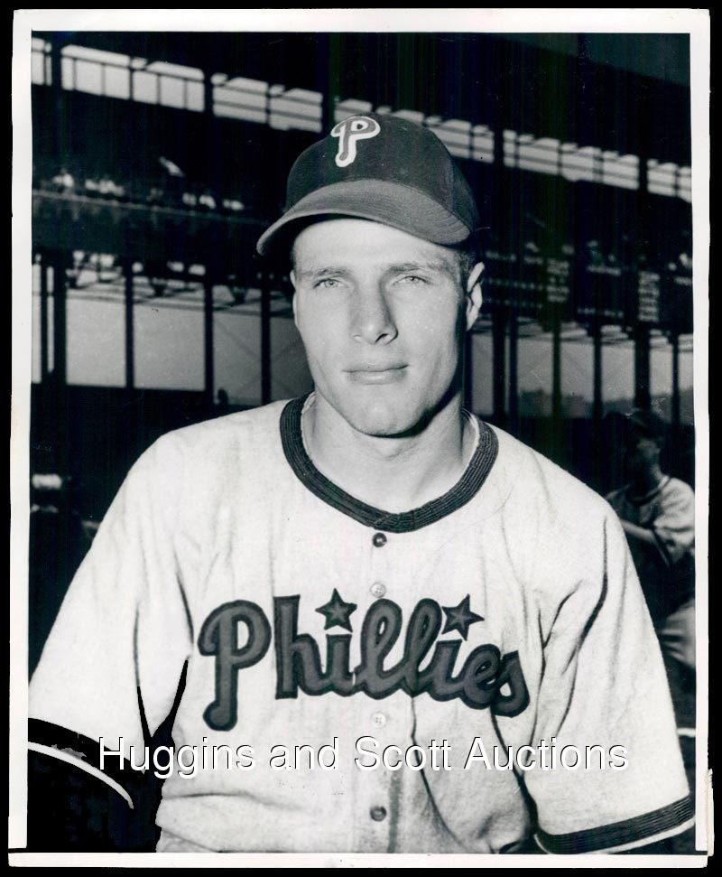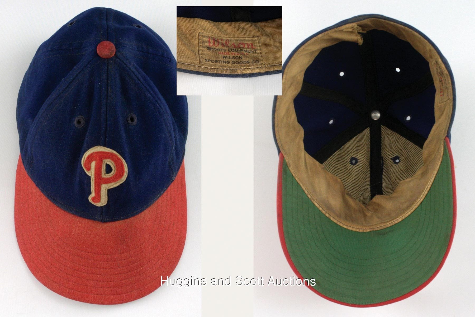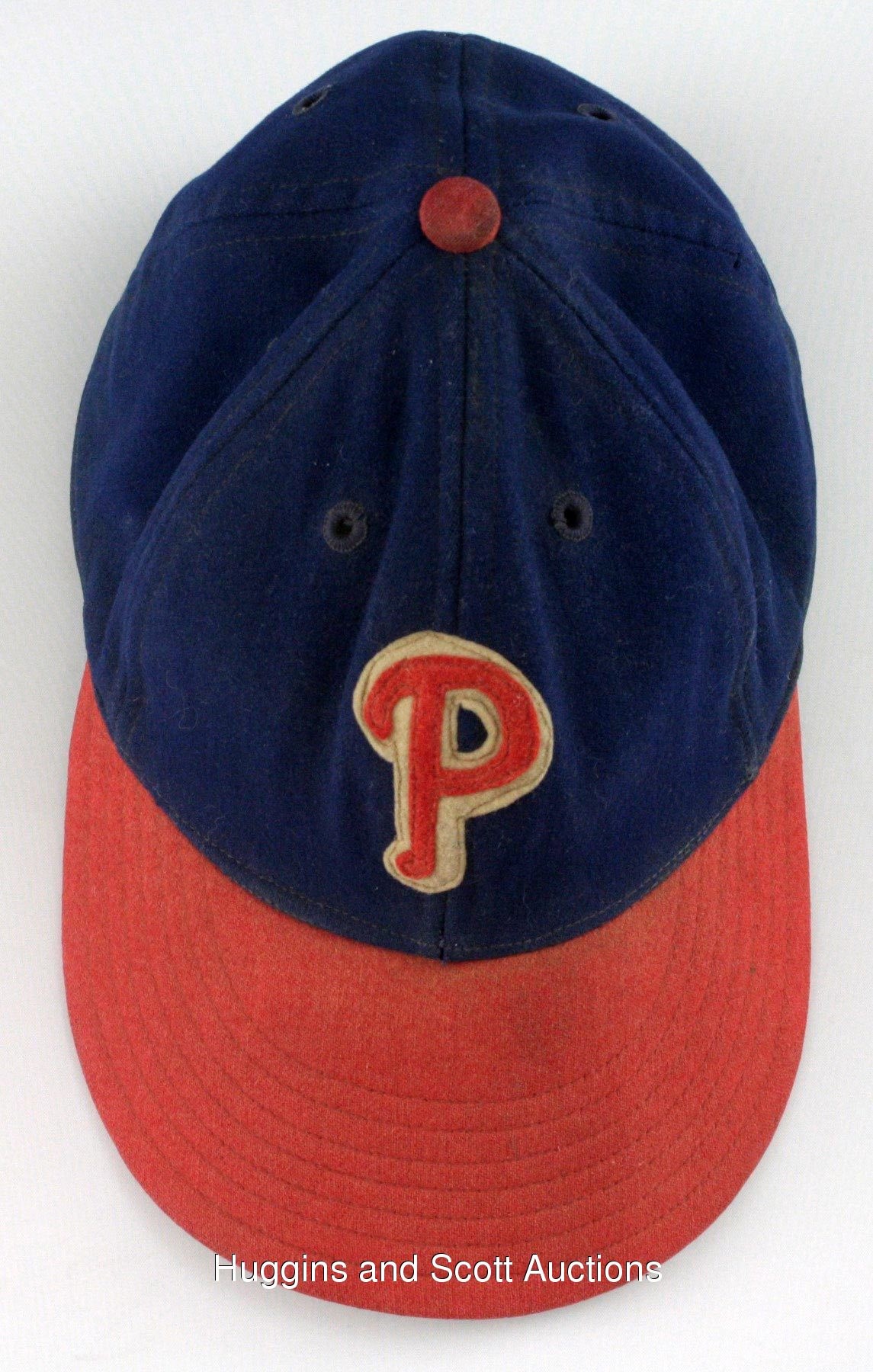 Thrust into the Major League spotlight as a wide-eyed 21-year-old, Hall of Famer Richie Ashburn was none the worse for his sheltered Tilden, Nebraska upbringing. City lights, rustic settings: it made no difference to “Whitey,” as swapped a league-best 32 bases in his 1948 rookie campaign and then eagerly returned to the Midwest for a barnstorming tour. It was on that journey that Ashburn bestowed his 1948 Phillies cap upon a young fan in his hometown. Worn by Ashburn during his rookie campaign, this blue wool accessory features the club’s script-style “P” logo sewn to the front center in red-on-blue felt, a red bill and a red button atop the six-point crown suspension. The interior sweat band is home to a “Wilson” label, and minor separation at the back of the sweatband was likely the site of a since-removed size tag. The item shows heavy wear with color fading throughout, perspiration-induced soiling within and a heavy bend on the bill. Accompanying is an LOA from the cap’s 1948 recipient, who was in a local barbershop when Ashburn walked in with N.L. contemporaries (and barnstorming mates) Rex Barney and Johnny Hopp. The cap’s style, incidentally, was replaced in 1950, the year of the “Whiz Kids.”Also accompanying is a letter from Mitchell & Ness President Peter Capolino to the cap’s recipient, attesting to the cap’s authenticity. Capolino writes (in full):”The purpose of this letter is to confirm that you, in fact, own an original 1948 Philadelphia Phillies cap, manufactured by Wilson Sporting Goods Co. The cap appears to be a size 7, similar to the size that Richie Ashburn wore in his rookie year of 1948. The hat is in excellent condition and is a very rare collectible in the world of baseball.Thank you for giving me the opportunity to inspect the cap.”The black-and-white portrait of Ashburn shown in the images below does not come with the lot; it is for photo identification only.