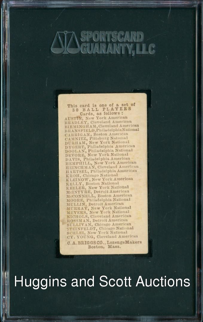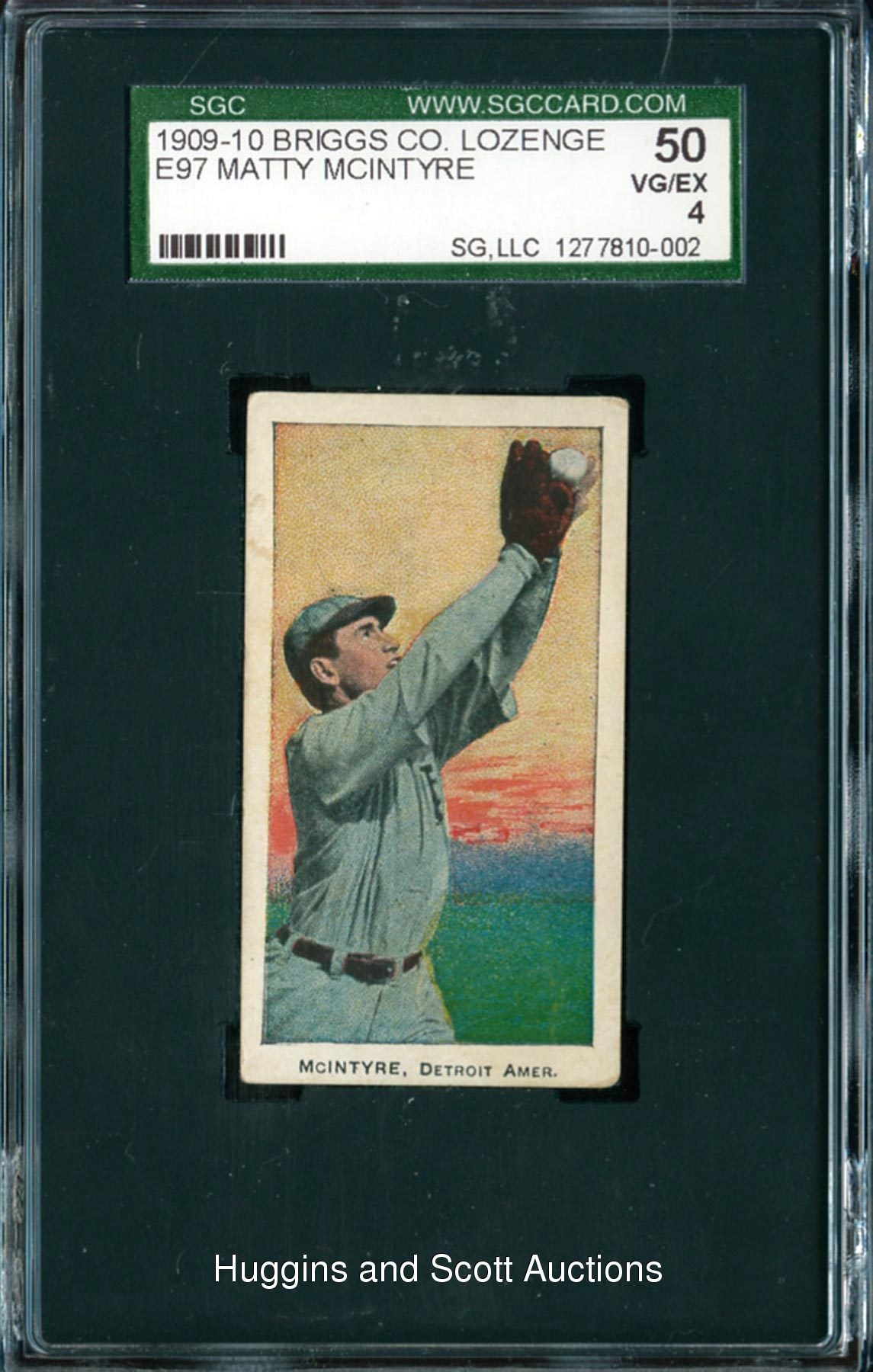 Graded 50 VG-EX 4 by SGC. Offered is a 1909-10 E97 Briggs Lozenge Matty McIntyre example. This difficult Type is crease-free, properly centered and displays even corner wear. The surfaces have sustained moderate toning associated with the issue. One of five at the grading level with two better.