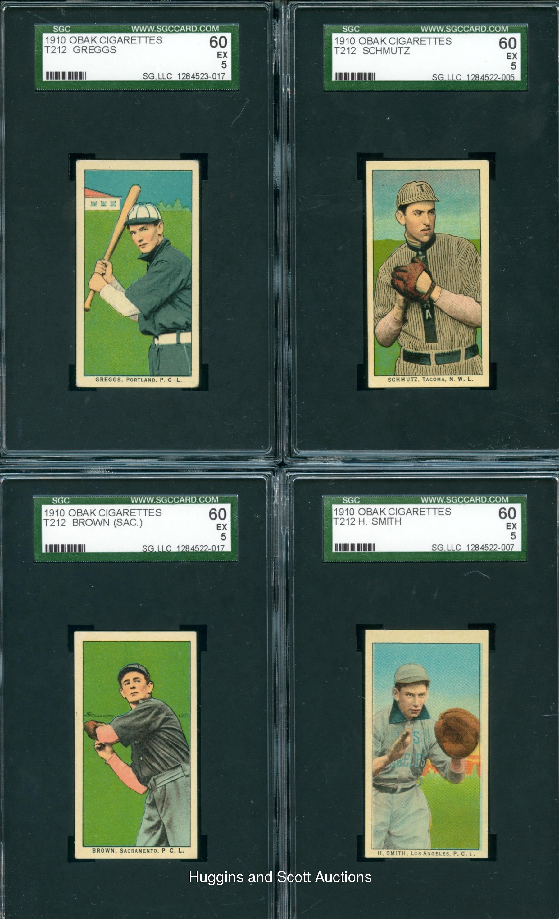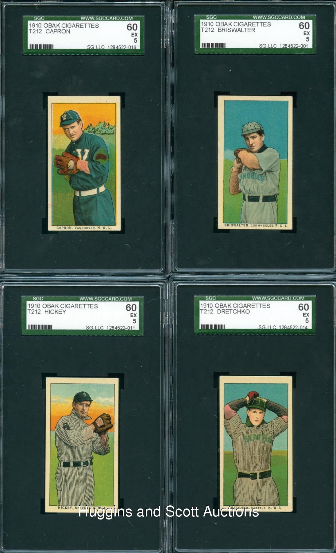 Each graded 60 EX 5 by SGC. These (8) 1910 T212-2 Obak singles present at the peak of their assigned technical grades. Intricate depictions of numerous Pacific Coast League subjects are found throughout including Briswalter, Brown (Sacramento), Capron, Dretchko, Greggs, Hickey, Schmutz and H. Smith. All backs are clean and come from the "175 Subjects" series.