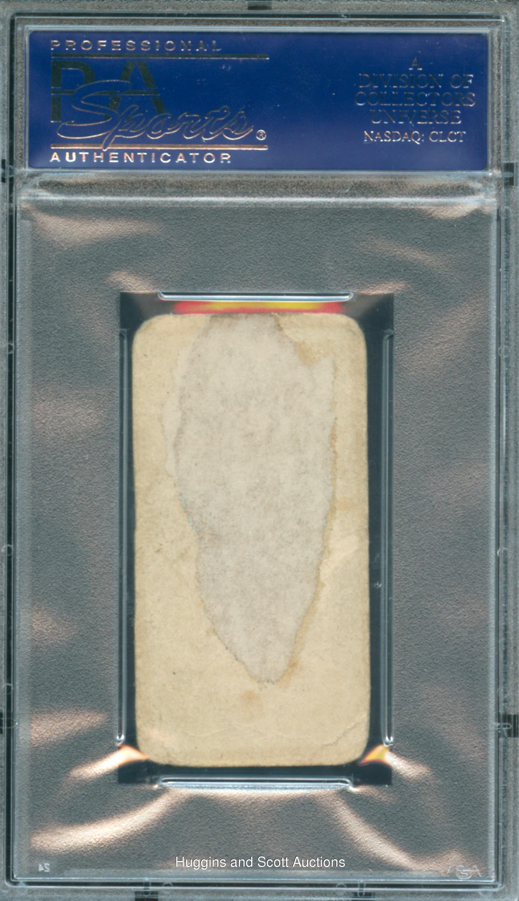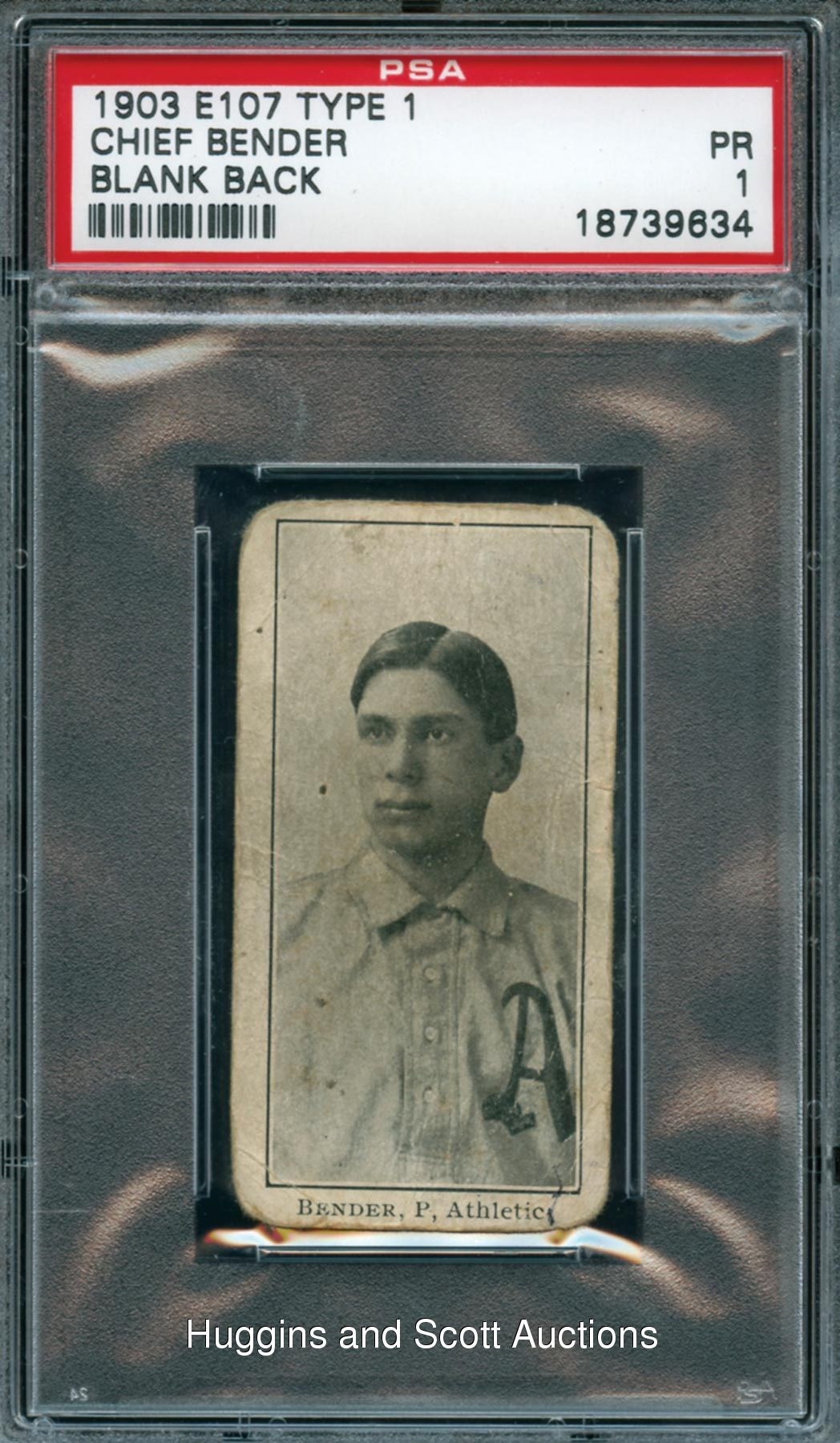Native American Hall of Famer Chief Bender casts a stoic glance on this vintage cardboard rarity. Specifically, this 1903 E107 Type 1 blank-back example is encapsulated and Graded PR 1 by PSA. Offsetting the low-end technical grade, the scarce keepsake contrarily remains so valuable due to its lofty status as the lone specimen graded by the esteemed third party service. While the centering is nice, soft corners and reverse paper loss are consistent with the professional assessment.