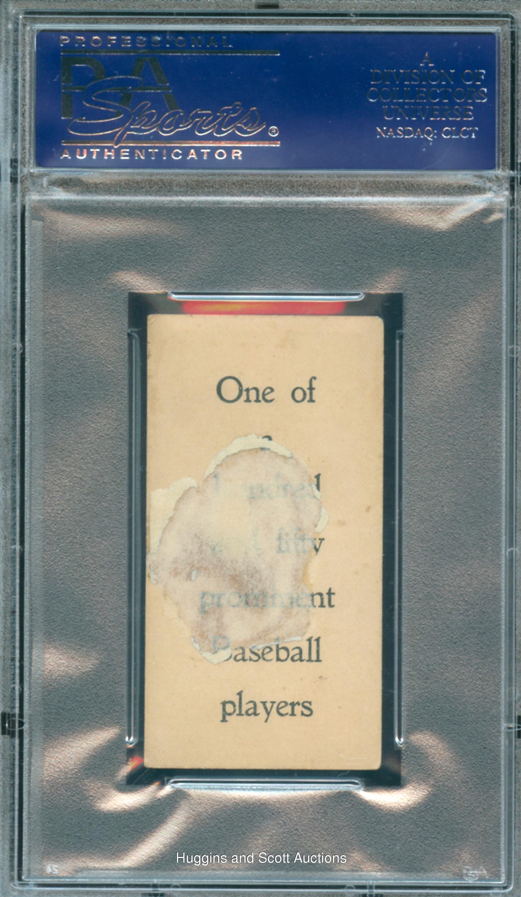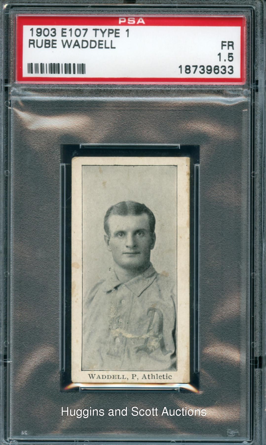 Among the game’s first real gate attractions, Hall of Famer Rube Waddell dabbled, as well, in alligator wrestling, football, rugby, and allegedly “lost count” of how many women he married. Pictured at the onset of his incredible six-year run of pacing the American League in strikeouts, Waddell is the enigmatic subject of this scarce and coveted 1903 E107 Type 1 cardboard treasure. Encapsulated and Graded FR 1.5 by PSA, this is the lone specimen at its tier with only two graded higher by the respected service. Pinpoint centering frames the southpaw’s black-and-white likeness. Rounded left-side corners and mounting remnants/paper loss on the reverse account for the technical assessment.