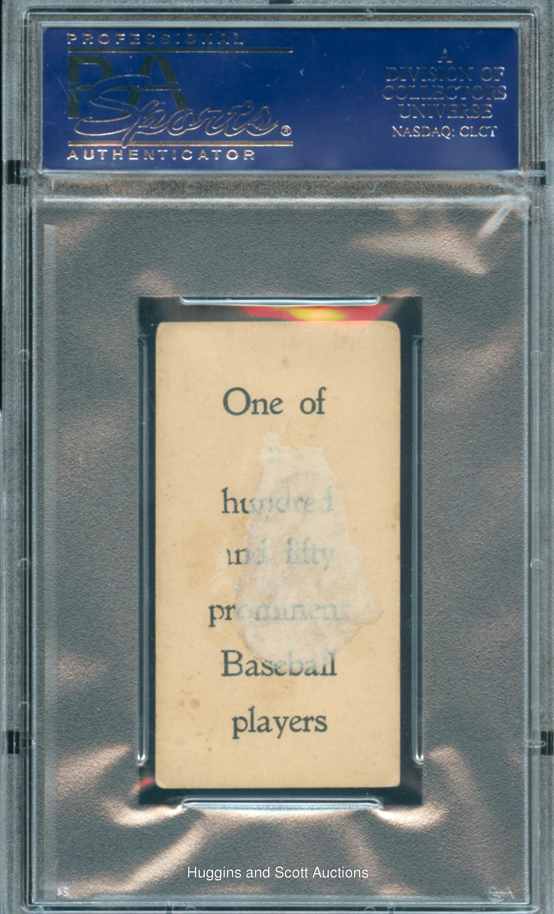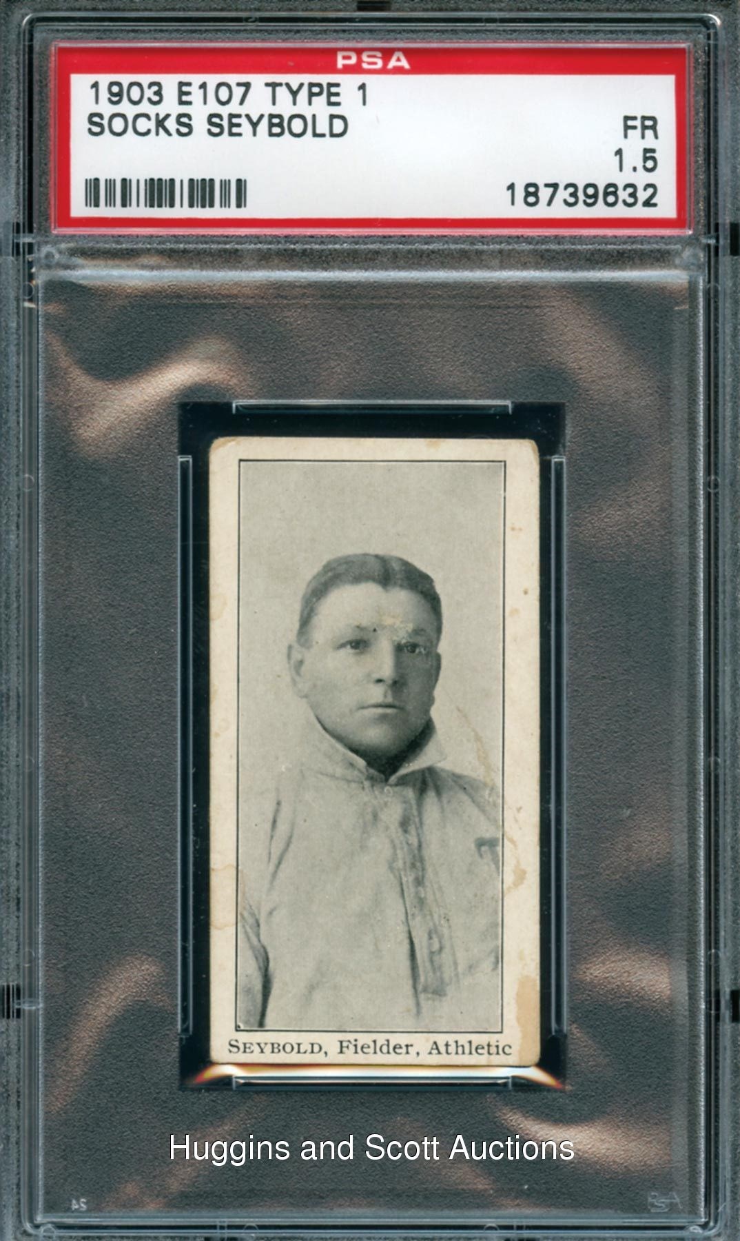 This 1903 E107 Type 1 collectible portrays Socks Seybold as the reigning American League home run champion, as his 16 circuit clouts in 1902 were not to be topped in the Junior Circuit until 1919, when a legend named “Ruth” all but reinvented the home run. Encapsulated and Graded FR 1.5 by PSA, this well-centered rarity in the lone specimen at its tier with only one graded higher. Rounded corners and mounting remnants on the reverse combine to account for the technical assessment.
