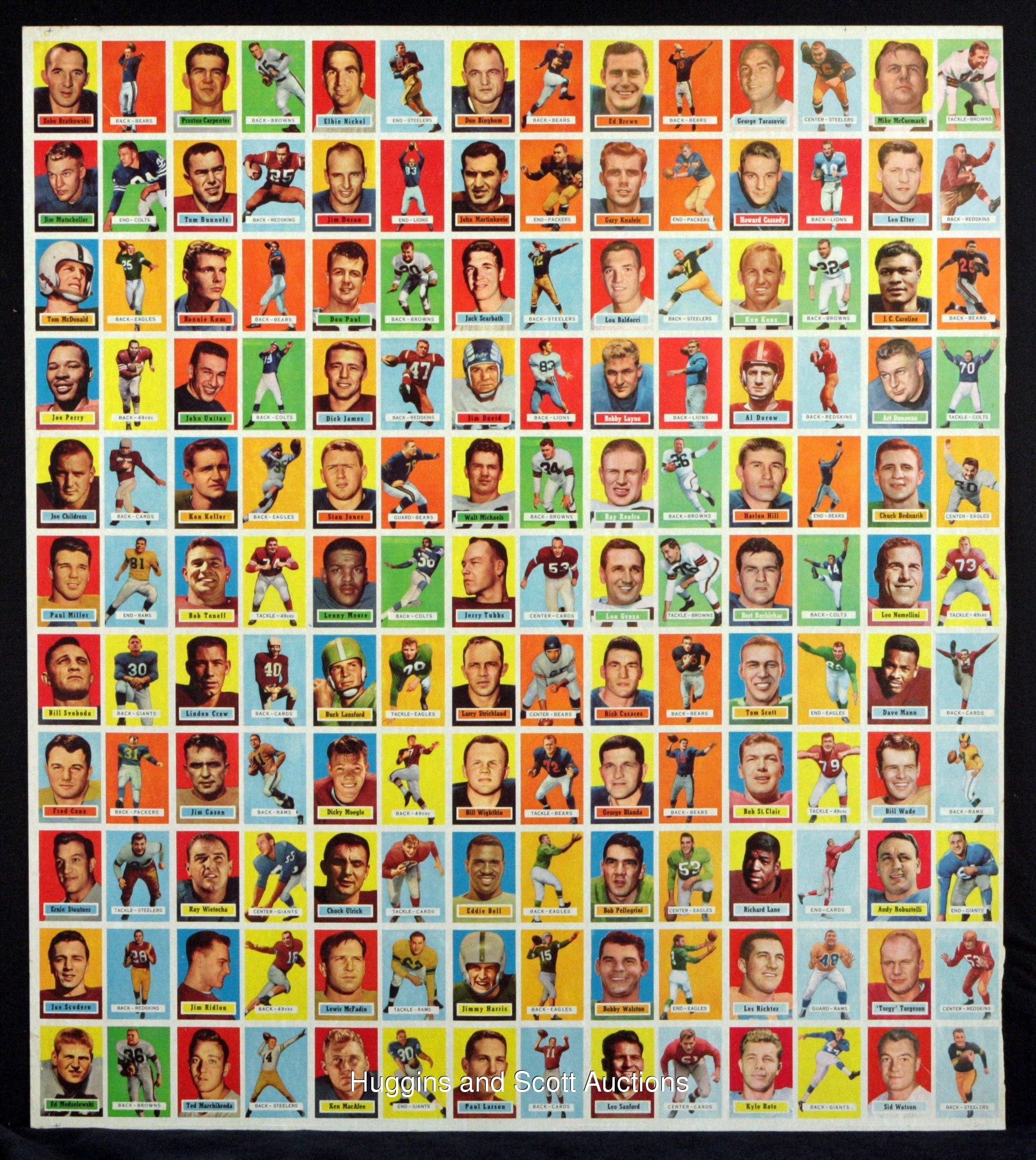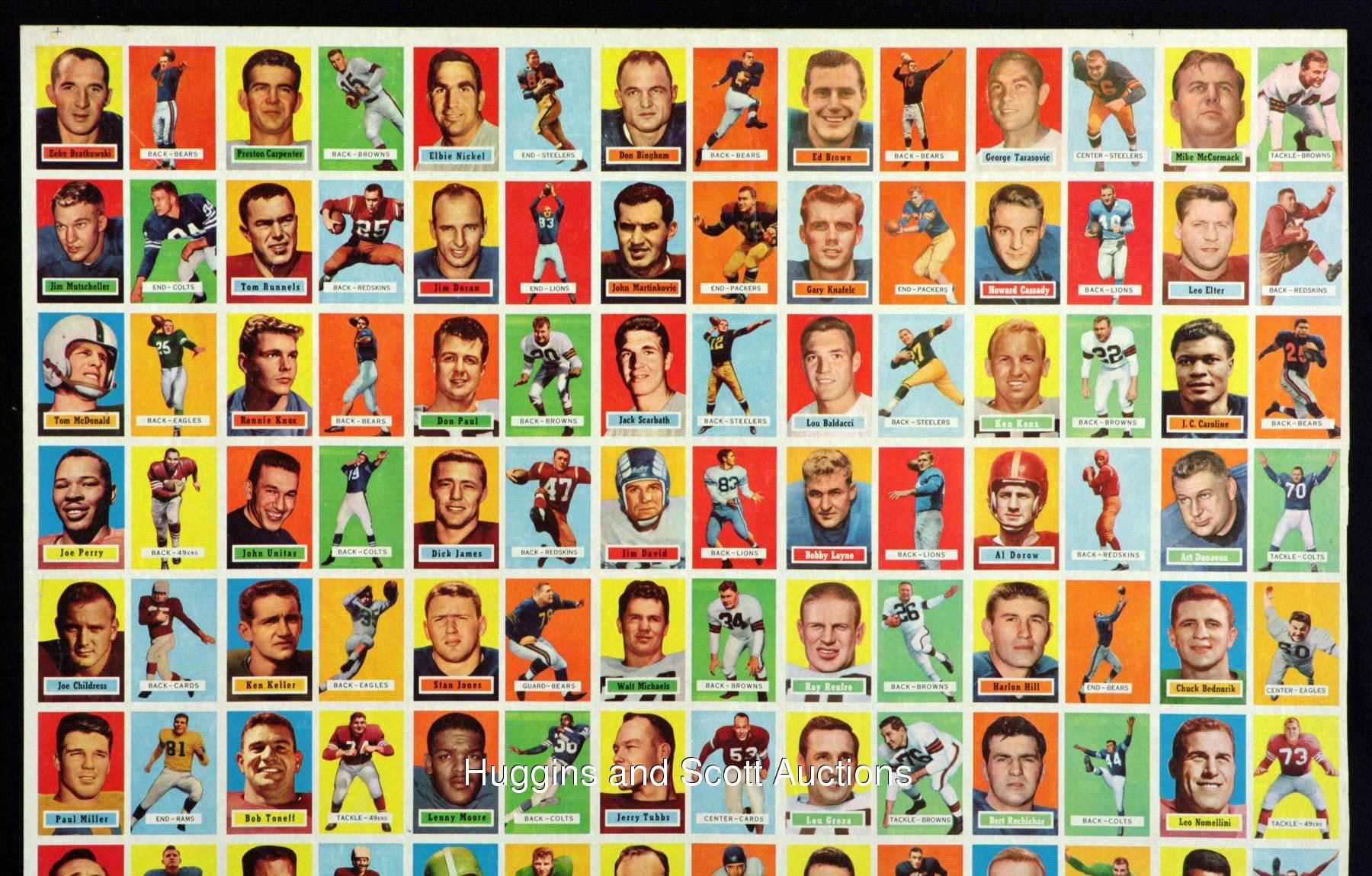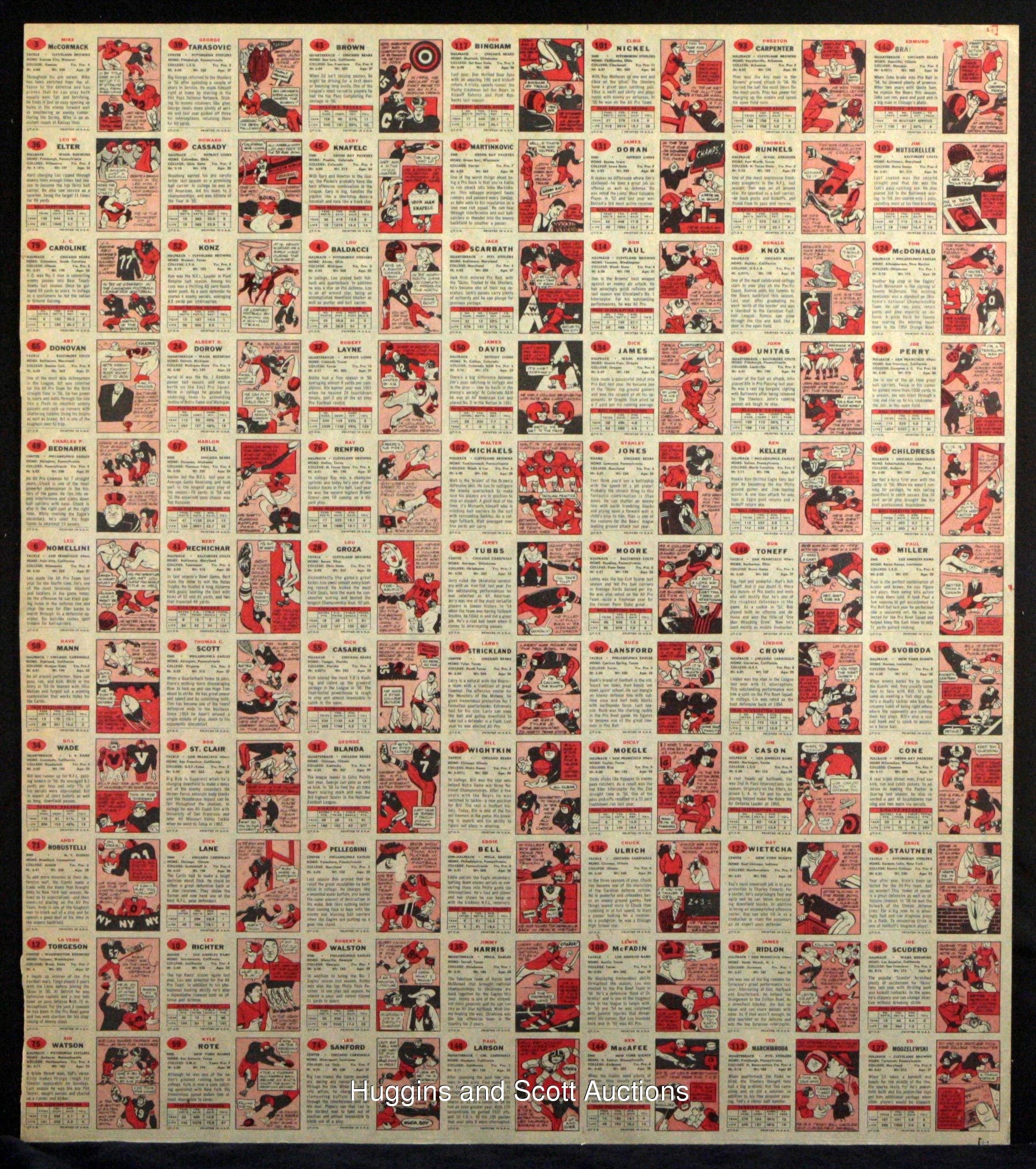 Spared from the printer’s blade is the offered 1957 Topps Football uncut sheet of (77) cards. This higher-grade survivor is headlined by “The Golden Arm” and other Hall of Fame personnel. Comprised of (11) seven-card rows, exactly half of the subjects from this early football issue are represented. Peripheral wear including edge creasing does not significantly impact any of the key players. Additionally, scattered wrinkles and spider creases are largely relegated to only commons and semi-stars. The biographical/cartoon reverse is clean, and the overall sheet exhibits mild bowing. Other than #138 Unitas RC, additional keys include #28 Groza, #31 Blanda, #32 Layne, #49 Bednarik, #65 Donovan, #85 Lane RC, #92 Stautner, #124 McDonald RC, #128 L. Moore and #129 Perry. While uncut sheets from the 1960s-1970s are relatively scarce, such material from the 1950s is almost impossible.
