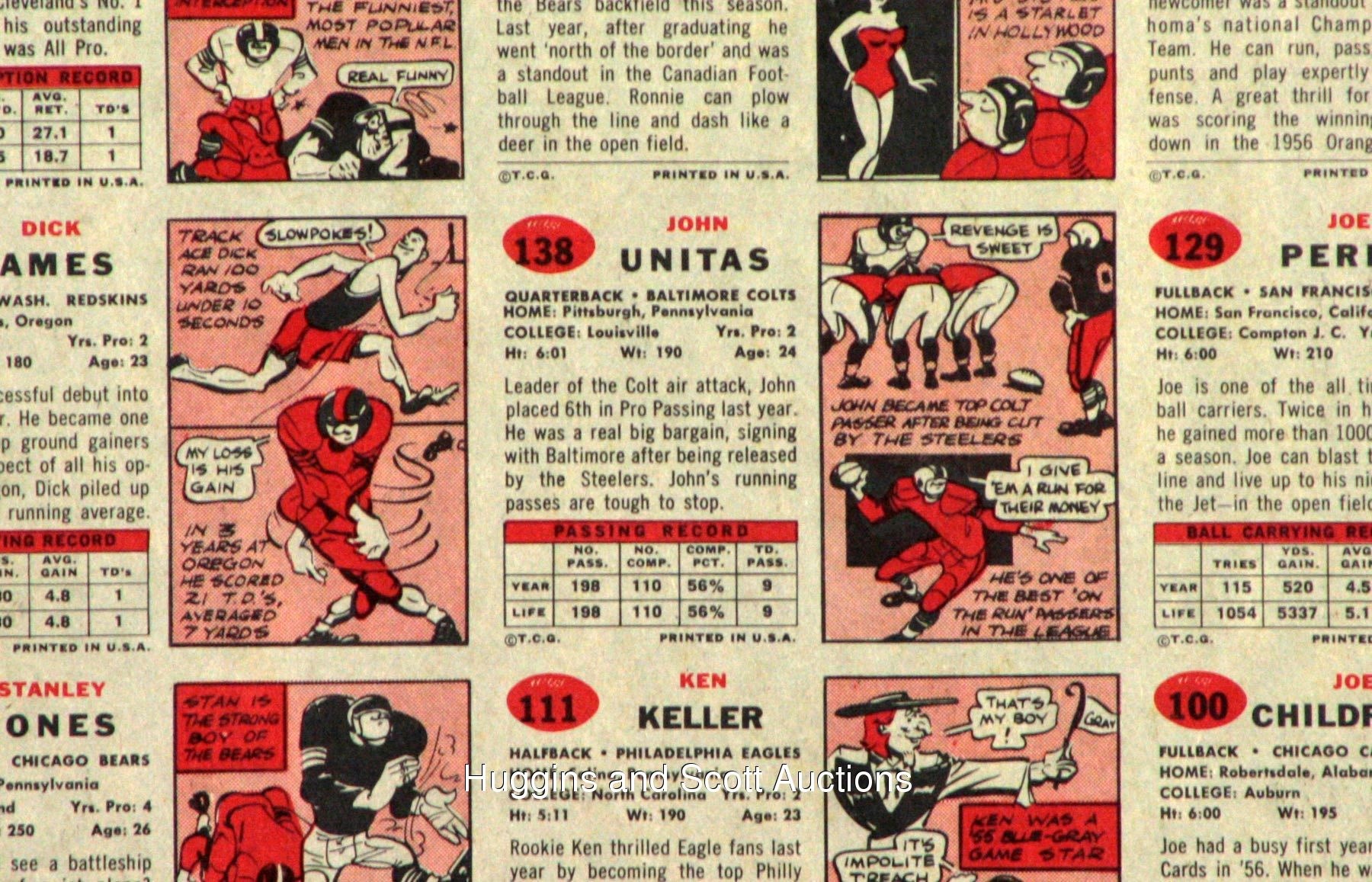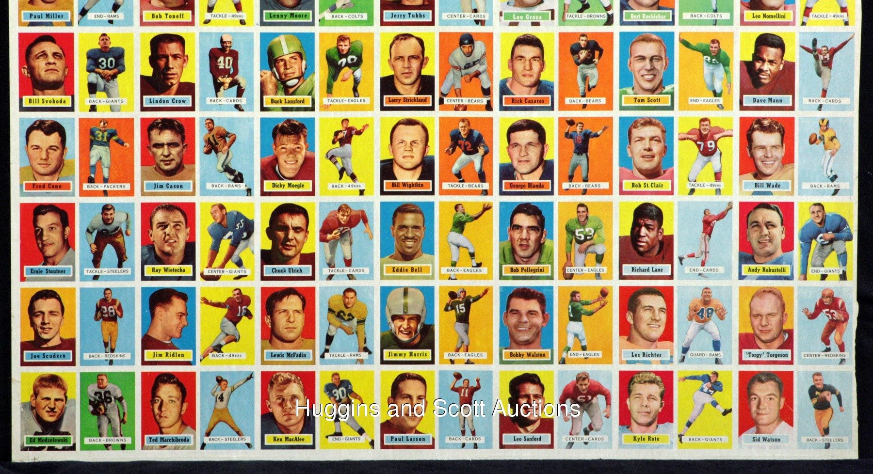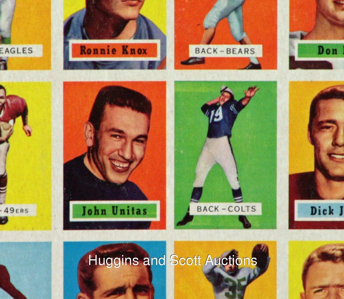Spared from the printer’s blade is the offered 1957 Topps Football uncut sheet of (77) cards. This higher-grade survivor is headlined by “The Golden Arm” and other Hall of Fame personnel. Comprised of (11) seven-card rows, exactly half of the subjects from this early football issue are represented. Peripheral wear including edge creasing does not significantly impact any of the key players. Additionally, scattered wrinkles and spider creases are largely relegated to only commons and semi-stars. The biographical/cartoon reverse is clean, and the overall sheet exhibits mild bowing. Other than #138 Unitas RC, additional keys include #28 Groza, #31 Blanda, #32 Layne, #49 Bednarik, #65 Donovan, #85 Lane RC, #92 Stautner, #124 McDonald RC, #128 L. Moore and #129 Perry. While uncut sheets from the 1960s-1970s are relatively scarce, such material from the 1950s is almost impossible.