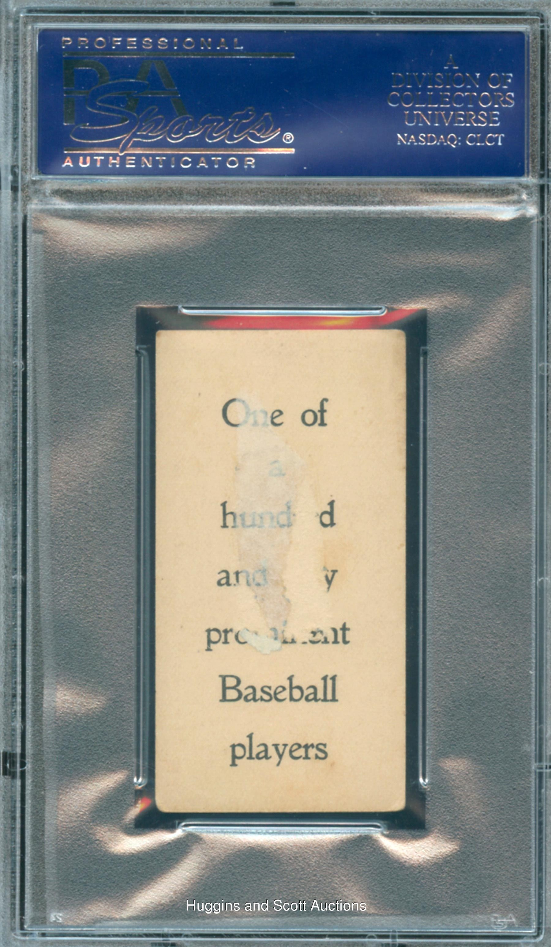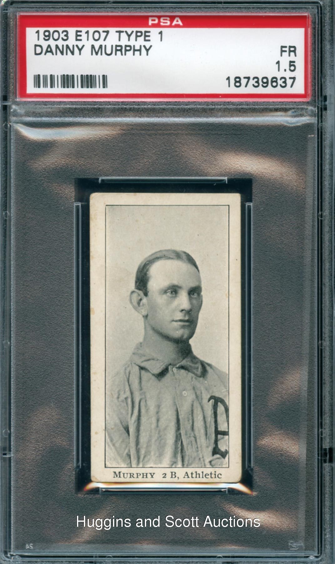 The author of an auspicious American League debut that saw him go 6-for-6 with an inside-the-park home run off of Cy Young, local hero Danny Murphy of Philadelphia Athletics fame is the handsome subject on this rare 1903 E107 Type 1 collectible. Encapsulated and Graded FR 1.5 by PSA, the cardboard prize is the lone example at its tier with only one graded higher. Soft lower corners and paper loss/mounting remnants on the reverse are consistent with the technical grade.