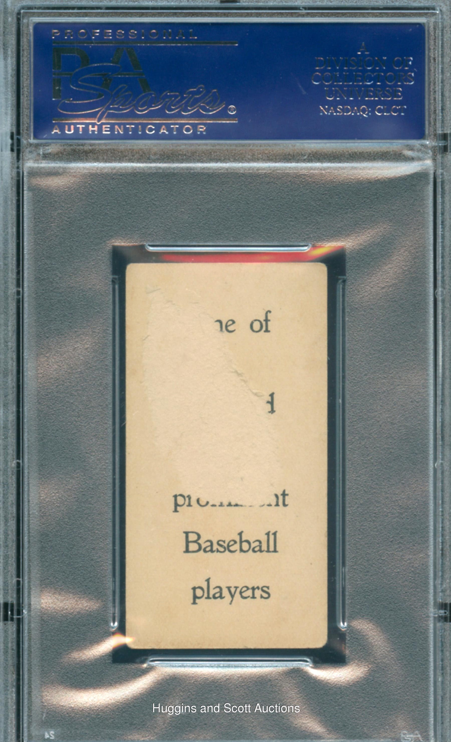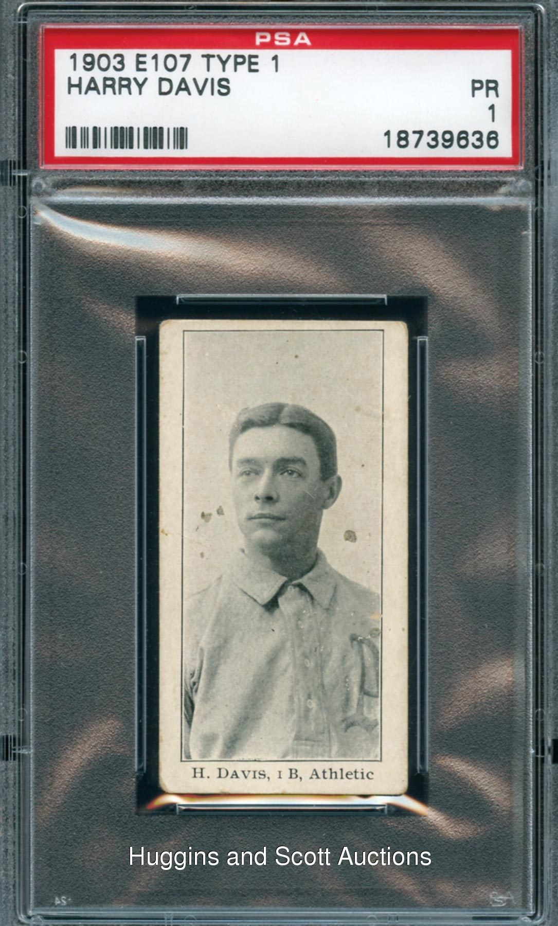 A principal on Connie Mack’s first Athletics dynasty, former 1st baseman Harry Davis was depicted on this scarce 1903 E107 Type 1 collectible just before he embarked on his four-year run of leading the American League in home runs, making him the first-ever player to log a home run feat of that length. Encapsulated and Graded PR 1 by PSA, this particular example is the lone specimen at its tier with only one graded higher by the trusted third party service. Rounded corners and reverse paper loss account for the technical assessment.