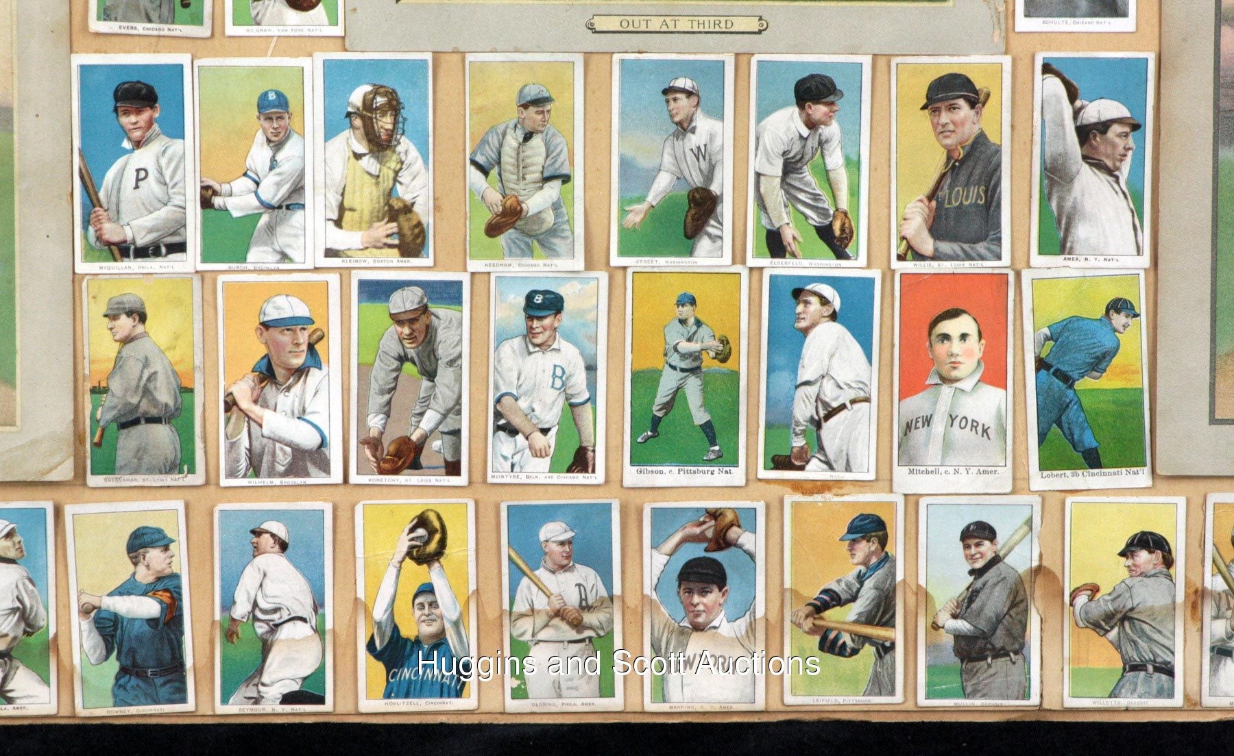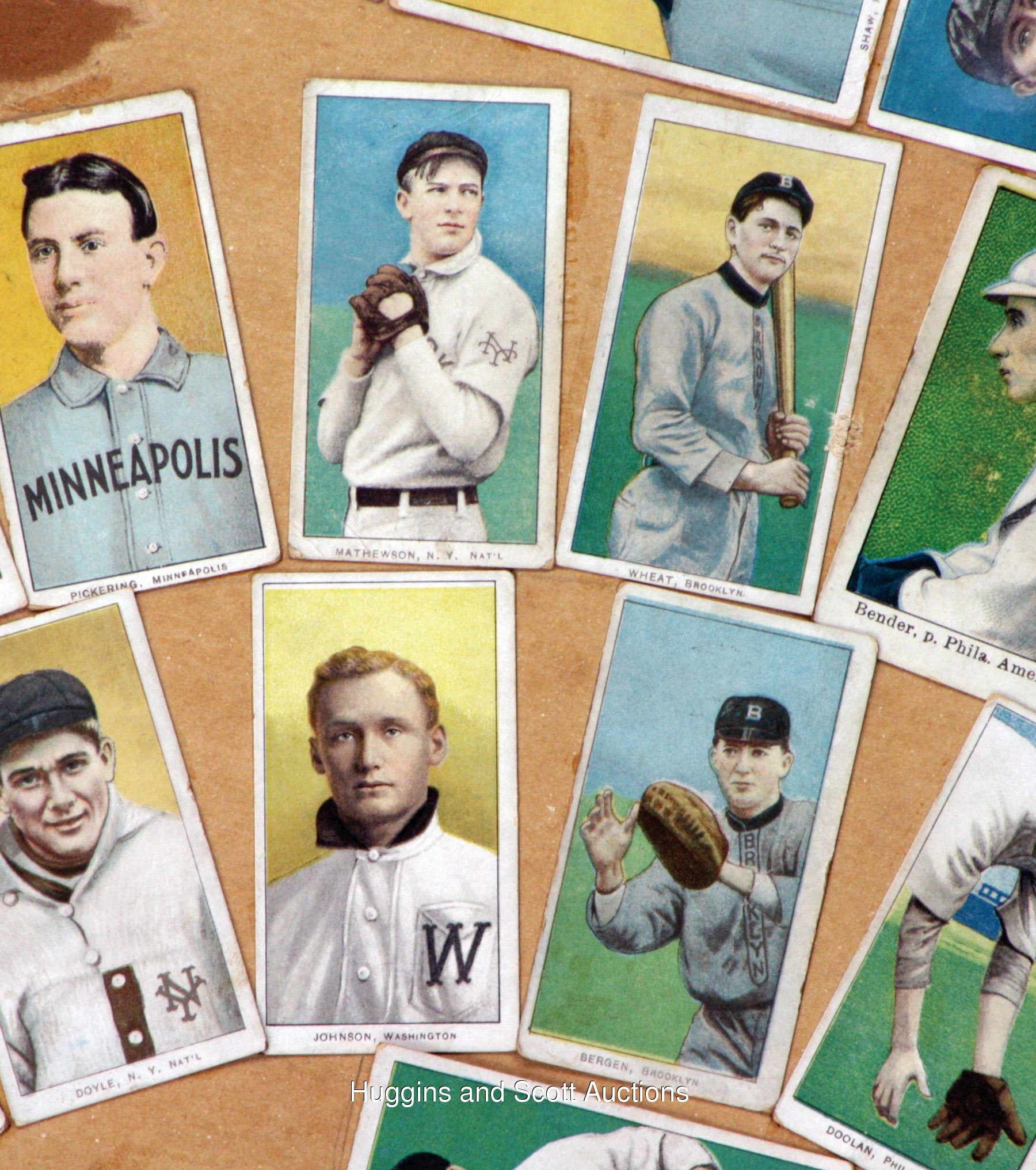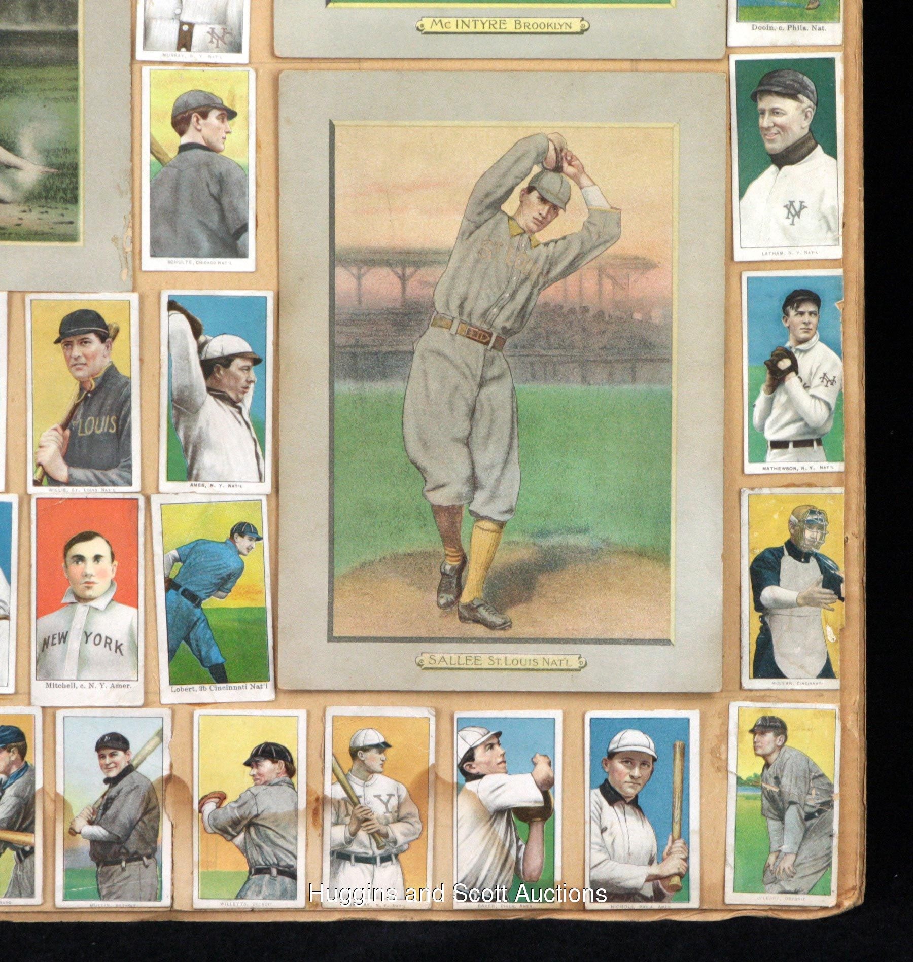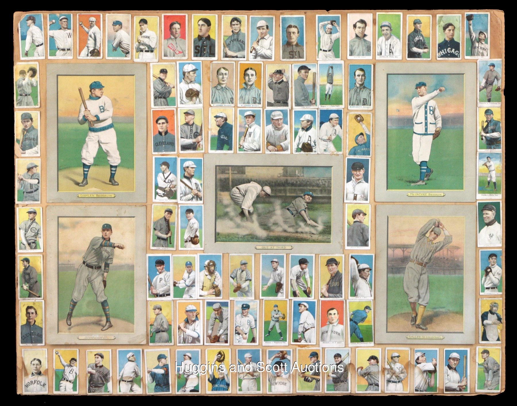 A simply breathtaking pair of 1909-11 baseball tobacco and caramel card collages featuring (210) cards with (36) Hall of Famers including (2) Cobb, Johnson, Mathewson and Wagner. A minimum of (7) ACC designations comprise these antique cardboard sheets which have been expertly mounted to sturdier 28x22 backings. While there exist ample photographic evidence of turn-of-the-century baseball card displays from the earliest hobbyists, to encounter a gallery that has withstood the century in such a remarkable state or preservation is nearly unheard of. It is obvious that the original owner cherished their cardboard treasures as they were symmetrically arranged across the canvas and then carefully adhered to the surface. One sheet displays a whopping (123) cards while the other portrays (87) examples with Hall of Famers and types almost evenly dispersed throughout. While the advertising backs cannot be determined, there is no second guessing the quality of the obverses! Roughly half of the cards are crease-free and the mostly pint-sized relics have retained incredible eye appeal and pinpoint registration. There are about 5-10% showing minimal water damage/trimming, primarily those on the outer perimeter of the sheets. The overall color schemes are eye-catching, attractive and sure to please the advanced tobacco/caramel card enthusiast. This exceptional New York area find is an instant standard of collecting excellence with an assortment of Types and early Cooperstown inductees that is almost unheard of! Key subjects include 1909-11 E90-1 American Caramel: (4 confirmed cards); 1909-11 E92 Croft’s/Dockman/Nadja: (12 confirmed cards) with Hall of Famers: (2 cards) with Bender (presents GD), Jennings (presents FR); 1909-11 E90-1 American Caramel or Croft’s/Dockman/Nadja: (6 cards, all shared images between designations) with Hall of Famers: (2 cards) with E. Collins (presents VG), Wagner (Batting, presents GD); 1909 E95 Philadelphia Caramel: Cicotte (presents GD); 1909-11 E254 Colgan’s Chips: (12 cards) with Hall of Famers: (2 cards) with Baker (presents EX-MT), Kell(e)y (presents FR); 1909-11 T206 White Borders: (166 cards) with Hall of Famers: (29 cards) with Baker, Bender (Throwing, No Trees), Bresnahan (Portrait), Bresnahan (with Bat), Chance (Batting), Cobb (Bat Off Shoulder, presents FR), Cobb (Red Portrait, presents GD, despite color fading), J. Collins (presents VG), Crawford (with Bat), Duffy, (2) Evers (Chicago on Shirt), Jennings (Both Hands Showing), W. Johnson (Hands at Chest, presents VG-EX), W. Johnson (Portrait, presents EX), Lajoie (Throwing, presents GD), Lajoie (with Bat, presents GD), Marquard (Portrait, presents VG), (2) Mathewson (Dark Cap, one presents GD, one has trimmed edge), McGinnity, (2) McGraw (Glove at Hip), Tinker (Bat Off Shoulder), Tinker (Bat On Shoulder), Walsh, Wheat, Willis (with Bat), C. Young (No Glove Shows, presents GD); Southern Leaguers: (2 cards, both present FR) with Orth, Seitz; Commons/Stars: (135 cards) with Chase (Blue Portrait), H. Davis (No Initial), Gandil, Kleinow (Boston); 1910 E104-3 Nadja Caramels: (3 cards) with D. Jones (presents GD), T. Jones (presents PR), Moriarty (presents FR); 1910-11 T3 Turkey Red Cabinets: (6 cards, presents GD) with Hall of Famer: #40 Willis (presents FR); Commons/Stars: (5 cards) with #11 Dahlen, #28 McIntyre (Brooklyn), #37 Sallee, #43 Out At Third and #49 A Close Play At Second. The overall surfaces have an approximate condition breakdown as follows: 25% (VG to EX), 35% (GD), 20% (FR) and 20% (PR). These assessments are based on the obverses only and do not consider the unknown conditions of the reverses and may not be representative of the overall technical grades. More on our website. 1909-11 E90-1 American Caramel: (4 confirmed cards) with Commons: (4 cards) with Blankenship, Camnitz, Gibson (Front View), F. Mitchell; 1909-11 E92 Croft’s/Dockman/Nadja: (12 confirmed cards) with Hall of Famers: (2 cards) with Bender, Jennings; Commons/Stars: (10 cards) with Casey, Chase, H. Davis, Devlin, Dooin, Kleinow, Magee, D. Miller (Batting), Schaefer, Zimmerman; 1909-11 E90-1 American Caramel or Croft’s/Dockman/Nadja: (6 cards, all shared images between designations) with Hall of Famers: (2 cards) with E. Collins, Wagner (Batting); Commons: (4 cards) with Dougherty, Gibson (Back View), Lobert, McLean; 1909 E95 Philadelphia Caramel: Cicotte; 1909-11 E254 Colgan’s Chips: (12 cards) with Hall of Famers: (2 cards) with Baker, Kell(e)y; Commons: (10 cards) with Dunn, Hally, Han, Hartsel, Howard, Manser (Jersey City), Mattern, Meyer, Robinson, Taylor; 1909-11 T206 White Borders: (166 cards) with Hall of Famers: (29 cards) with Baker, Bender (Throwing, No Trees), Bresnahan (Portrait), Bresnahan (with Bat), Chance (Batting), Cobb (Bat Off Shoulder), Cobb (Red Portrait), J. Collins, Crawford (with Bat), Duffy, (2) Evers (Chicago on Shirt), Jennings (Both Hands Showing), W. Johnson (Hands at Chest), W. Johnson (Portrait), Lajoie (Throwing), Lajoie (with Bat), Marquard (Portrait), (2) Mathewson (Dark Cap, one with trimmed edge), McGinnity, (2) McGraw (Glove at Hip), Tinker (Bat Off Shoulder), Tinker (Bat On Shoulder), Walsh, Wheat, Willis (with Bat), C. Young (No Glove Shows); Southern Leaguers: (2 cards) with Orth, Seitz; Commons/Stars: (135 cards) with (2) Abbaticchio (Brown Sleeves), Adkins, Ames (Hands Above Head), Atz, Ball (Cleveland), Bergen (Catching), Bescher (Hands in Air), Bliss, Bradley (with Bat), Brashear, Burch (Batting), Campbell, Camnitz (Hands above Head), Carrigan, Chase (Blue Portrait), J. Clarke, Congalton, Conroy (with Bat), Crandall (Portrait, with Cap), H. Davis (No Initial), Devore, Donlin (Seated), Donovan (Throwing), Doolan (Batting), Doolan (Fielding), Doolin, Downey (Batting), Downs, Doyle (New York, Portrait), Dubuc, Easterly, Elberfeld (Washington, Fielding), Ford, (2) Frill, Gandil, Geyer, Goode, Grimshaw, Hartsel, Hemphill, (2) Herzog (Boston), B. Hinchman, Hoblitzell, Howell (Hands at 