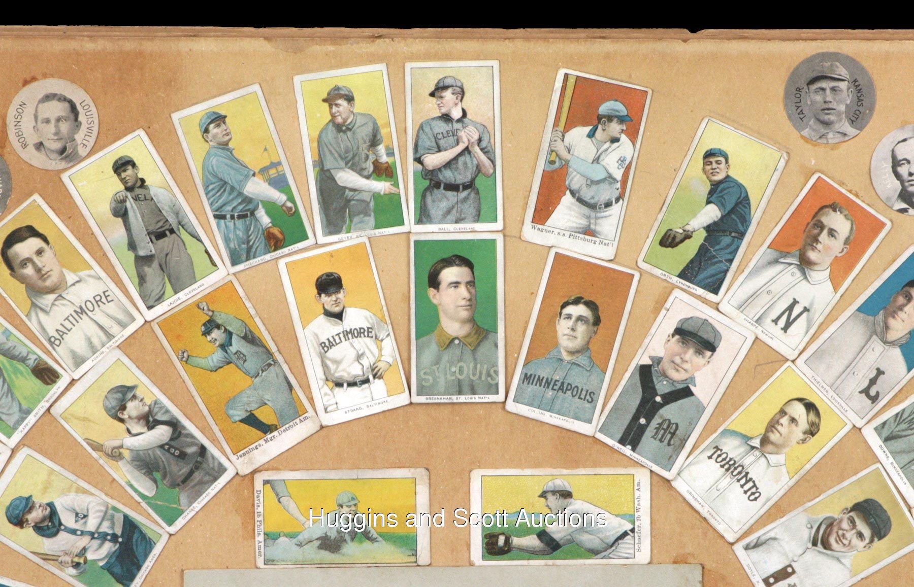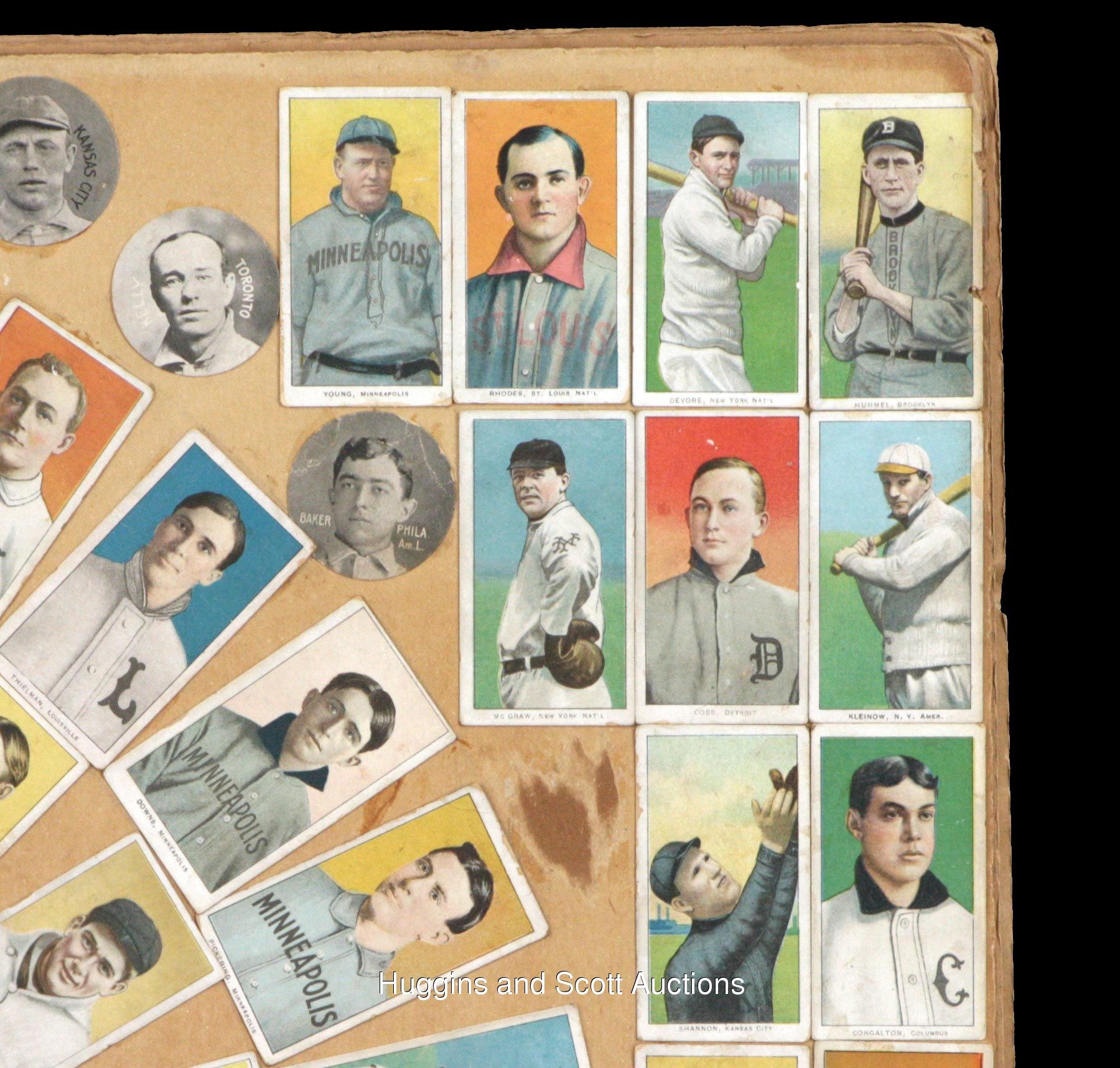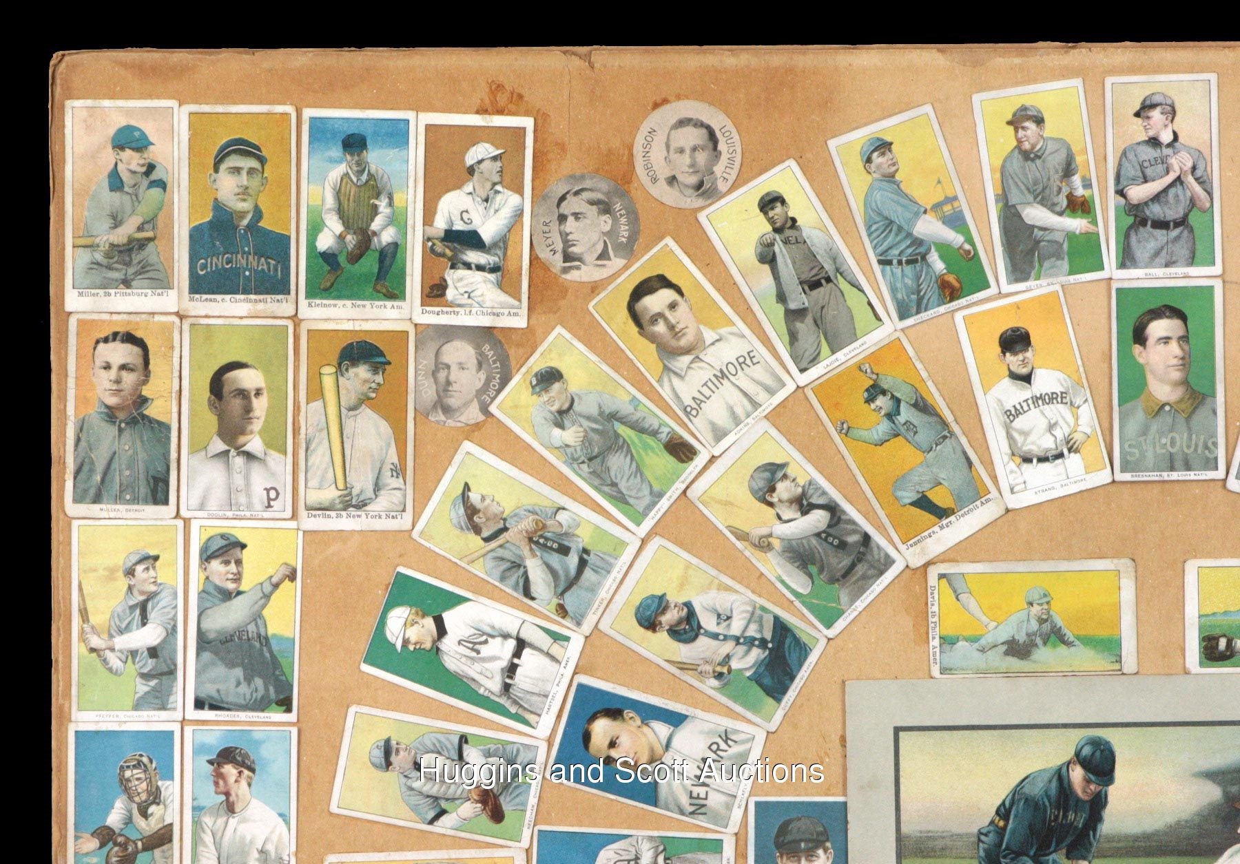 A simply breathtaking pair of 1909-11 baseball tobacco and caramel card collages featuring (210) cards with (36) Hall of Famers including (2) Cobb, Johnson, Mathewson and Wagner. A minimum of (7) ACC designations comprise these antique cardboard sheets which have been expertly mounted to sturdier 28x22 backings. While there exist ample photographic evidence of turn-of-the-century baseball card displays from the earliest hobbyists, to encounter a gallery that has withstood the century in such a remarkable state or preservation is nearly unheard of. It is obvious that the original owner cherished their cardboard treasures as they were symmetrically arranged across the canvas and then carefully adhered to the surface. One sheet displays a whopping (123) cards while the other portrays (87) examples with Hall of Famers and types almost evenly dispersed throughout. While the advertising backs cannot be determined, there is no second guessing the quality of the obverses! Roughly half of the cards are crease-free and the mostly pint-sized relics have retained incredible eye appeal and pinpoint registration. There are about 5-10% showing minimal water damage/trimming, primarily those on the outer perimeter of the sheets. The overall color schemes are eye-catching, attractive and sure to please the advanced tobacco/caramel card enthusiast. This exceptional New York area find is an instant standard of collecting excellence with an assortment of Types and early Cooperstown inductees that is almost unheard of! Key subjects include 1909-11 E90-1 American Caramel: (4 confirmed cards); 1909-11 E92 Croft’s/Dockman/Nadja: (12 confirmed cards) with Hall of Famers: (2 cards) with Bender (presents GD), Jennings (presents FR); 1909-11 E90-1 American Caramel or Croft’s/Dockman/Nadja: (6 cards, all shared images between designations) with Hall of Famers: (2 cards) with E. Collins (presents VG), Wagner (Batting, presents GD); 1909 E95 Philadelphia Caramel: Cicotte (presents GD); 1909-11 E254 Colgan’s Chips: (12 cards) with Hall of Famers: (2 cards) with Baker (presents EX-MT), Kell(e)y (presents FR); 1909-11 T206 White Borders: (166 cards) with Hall of Famers: (29 cards) with Baker, Bender (Throwing, No Trees), Bresnahan (Portrait), Bresnahan (with Bat), Chance (Batting), Cobb (Bat Off Shoulder, presents FR), Cobb (Red Portrait, presents GD, despite color fading), J. Collins (presents VG), Crawford (with Bat), Duffy, (2) Evers (Chicago on Shirt), Jennings (Both Hands Showing), W. Johnson (Hands at Chest, presents VG-EX), W. Johnson (Portrait, presents EX), Lajoie (Throwing, presents GD), Lajoie (with Bat, presents GD), Marquard (Portrait, presents VG), (2) Mathewson (Dark Cap, one presents GD, one has trimmed edge), McGinnity, (2) McGraw (Glove at Hip), Tinker (Bat Off Shoulder), Tinker (Bat On Shoulder), Walsh, Wheat, Willis (with Bat), C. Young (No Glove Shows, presents GD); Southern Leaguers: (2 cards, both present FR) with Orth, Seitz; Commons/Stars: (135 cards) with Chase (Blue Portrait), H. Davis (No Initial), Gandil, Kleinow (Boston); 1910 E104-3 Nadja Caramels: (3 cards) with D. Jones (presents GD), T. Jones (presents PR), Moriarty (presents FR); 1910-11 T3 Turkey Red Cabinets: (6 cards, presents GD) with Hall of Famer: #40 Willis (presents FR); Commons/Stars: (5 cards) with #11 Dahlen, #28 McIntyre (Brooklyn), #37 Sallee, #43 Out At Third and #49 A Close Play At Second. The overall surfaces have an approximate condition breakdown as follows: 25% (VG to EX), 35% (GD), 20% (FR) and 20% (PR). These assessments are based on the obverses only and do not consider the unknown conditions of the reverses and may not be representative of the overall technical grades. More on our website. 1909-11 E90-1 American Caramel: (4 confirmed cards) with Commons: (4 cards) with Blankenship, Camnitz, Gibson (Front View), F. Mitchell; 1909-11 E92 Croft’s/Dockman/Nadja: (12 confirmed cards) with Hall of Famers: (2 cards) with Bender, Jennings; Commons/Stars: (10 cards) with Casey, Chase, H. Davis, Devlin, Dooin, Kleinow, Magee, D. Miller (Batting), Schaefer, Zimmerman; 1909-11 E90-1 American Caramel or Croft’s/Dockman/Nadja: (6 cards, all shared images between designations) with Hall of Famers: (2 cards) with E. Collins, Wagner (Batting); Commons: (4 cards) with Dougherty, Gibson (Back View), Lobert, McLean; 1909 E95 Philadelphia Caramel: Cicotte; 1909-11 E254 Colgan’s Chips: (12 cards) with Hall of Famers: (2 cards) with Baker, Kell(e)y; Commons: (10 cards) with Dunn, Hally, Han, Hartsel, Howard, Manser (Jersey City), Mattern, Meyer, Robinson, Taylor; 1909-11 T206 White Borders: (166 cards) with Hall of Famers: (29 cards) with Baker, Bender (Throwing, No Trees), Bresnahan (Portrait), Bresnahan (with Bat), Chance (Batting), Cobb (Bat Off Shoulder), Cobb (Red Portrait), J. Collins, Crawford (with Bat), Duffy, (2) Evers (Chicago on Shirt), Jennings (Both Hands Showing), W. Johnson (Hands at Chest), W. Johnson (Portrait), Lajoie (Throwing), Lajoie (with Bat), Marquard (Portrait), (2) Mathewson (Dark Cap, one with trimmed edge), McGinnity, (2) McGraw (Glove at Hip), Tinker (Bat Off Shoulder), Tinker (Bat On Shoulder), Walsh, Wheat, Willis (with Bat), C. Young (No Glove Shows); Southern Leaguers: (2 cards) with Orth, Seitz; Commons/Stars: (135 cards) with (2) Abbaticchio (Brown Sleeves), Adkins, Ames (Hands Above Head), Atz, Ball (Cleveland), Bergen (Catching), Bescher (Hands in Air), Bliss, Bradley (with Bat), Brashear, Burch (Batting), Campbell, Camnitz (Hands above Head), Carrigan, Chase (Blue Portrait), J. Clarke, Congalton, Conroy (with Bat), Crandall (Portrait, with Cap), H. Davis (No Initial), Devore, Donlin (Seated), Donovan (Throwing), Doolan (Batting), Doolan (Fielding), Doolin, Downey (Batting), Downs, Doyle (New York, Portrait), Dubuc, Easterly, Elberfeld (Washington, Fielding), Ford, (2) Frill, Gandil, Geyer, Goode, Grimshaw, Hartsel, Hemphill, (2) Herzog (Boston), B. Hinchman, Hoblitzell, Howell (Hands at 