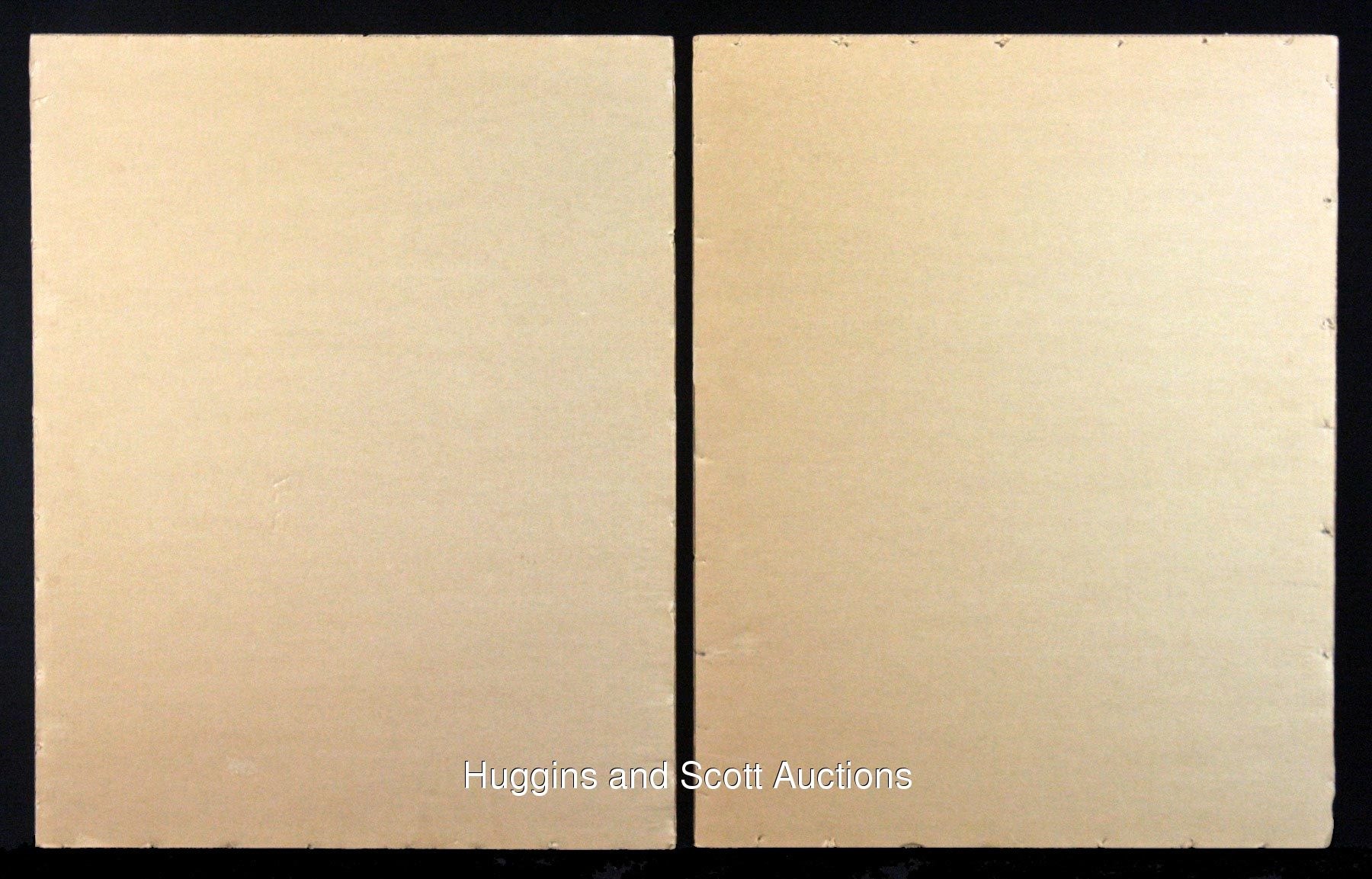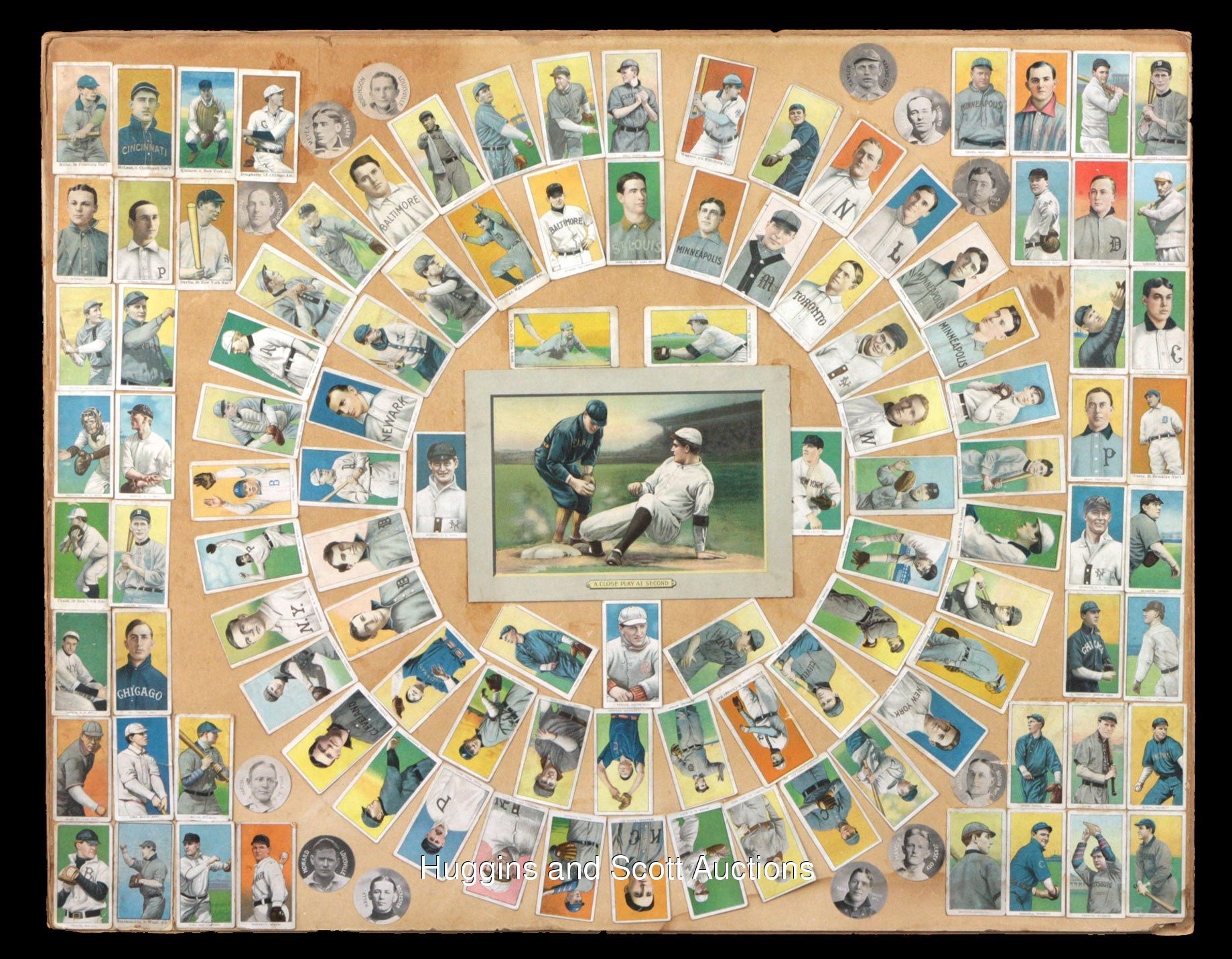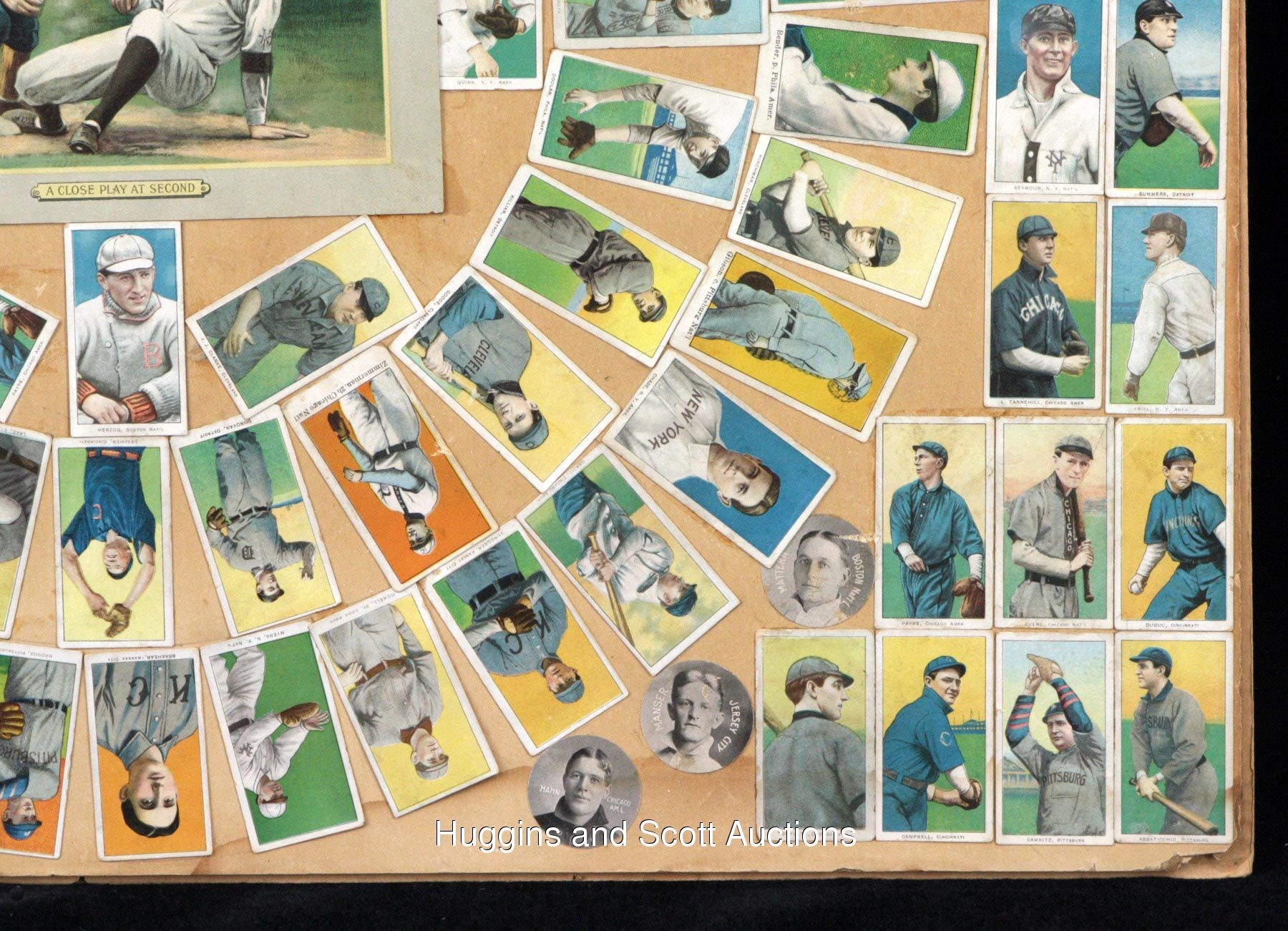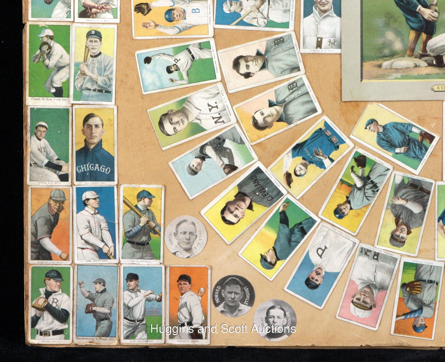 A simply breathtaking pair of 1909-11 baseball tobacco and caramel card collages featuring (210) cards with (36) Hall of Famers including (2) Cobb, Johnson, Mathewson and Wagner. A minimum of (7) ACC designations comprise these antique cardboard sheets which have been expertly mounted to sturdier 28x22 backings. While there exist ample photographic evidence of turn-of-the-century baseball card displays from the earliest hobbyists, to encounter a gallery that has withstood the century in such a remarkable state or preservation is nearly unheard of. It is obvious that the original owner cherished their cardboard treasures as they were symmetrically arranged across the canvas and then carefully adhered to the surface. One sheet displays a whopping (123) cards while the other portrays (87) examples with Hall of Famers and types almost evenly dispersed throughout. While the advertising backs cannot be determined, there is no second guessing the quality of the obverses! Roughly half of the cards are crease-free and the mostly pint-sized relics have retained incredible eye appeal and pinpoint registration. There are about 5-10% showing minimal water damage/trimming, primarily those on the outer perimeter of the sheets. The overall color schemes are eye-catching, attractive and sure to please the advanced tobacco/caramel card enthusiast. This exceptional New York area find is an instant standard of collecting excellence with an assortment of Types and early Cooperstown inductees that is almost unheard of! Key subjects include 1909-11 E90-1 American Caramel: (4 confirmed cards); 1909-11 E92 Croft’s/Dockman/Nadja: (12 confirmed cards) with Hall of Famers: (2 cards) with Bender (presents GD), Jennings (presents FR); 1909-11 E90-1 American Caramel or Croft’s/Dockman/Nadja: (6 cards, all shared images between designations) with Hall of Famers: (2 cards) with E. Collins (presents VG), Wagner (Batting, presents GD); 1909 E95 Philadelphia Caramel: Cicotte (presents GD); 1909-11 E254 Colgan’s Chips: (12 cards) with Hall of Famers: (2 cards) with Baker (presents EX-MT), Kell(e)y (presents FR); 1909-11 T206 White Borders: (166 cards) with Hall of Famers: (29 cards) with Baker, Bender (Throwing, No Trees), Bresnahan (Portrait), Bresnahan (with Bat), Chance (Batting), Cobb (Bat Off Shoulder, presents FR), Cobb (Red Portrait, presents GD, despite color fading), J. Collins (presents VG), Crawford (with Bat), Duffy, (2) Evers (Chicago on Shirt), Jennings (Both Hands Showing), W. Johnson (Hands at Chest, presents VG-EX), W. Johnson (Portrait, presents EX), Lajoie (Throwing, presents GD), Lajoie (with Bat, presents GD), Marquard (Portrait, presents VG), (2) Mathewson (Dark Cap, one presents GD, one has trimmed edge), McGinnity, (2) McGraw (Glove at Hip), Tinker (Bat Off Shoulder), Tinker (Bat On Shoulder), Walsh, Wheat, Willis (with Bat), C. Young (No Glove Shows, presents GD); Southern Leaguers: (2 cards, both present FR) with Orth, Seitz; Commons/Stars: (135 cards) with Chase (Blue Portrait), H. Davis (No Initial), Gandil, Kleinow (Boston); 1910 E104-3 Nadja Caramels: (3 cards) with D. Jones (presents GD), T. Jones (presents PR), Moriarty (presents FR); 1910-11 T3 Turkey Red Cabinets: (6 cards, presents GD) with Hall of Famer: #40 Willis (presents FR); Commons/Stars: (5 cards) with #11 Dahlen, #28 McIntyre (Brooklyn), #37 Sallee, #43 Out At Third and #49 A Close Play At Second. The overall surfaces have an approximate condition breakdown as follows: 25% (VG to EX), 35% (GD), 20% (FR) and 20% (PR). These assessments are based on the obverses only and do not consider the unknown conditions of the reverses and may not be representative of the overall technical grades. More on our website. 1909-11 E90-1 American Caramel: (4 confirmed cards) with Commons: (4 cards) with Blankenship, Camnitz, Gibson (Front View), F. Mitchell; 1909-11 E92 Croft’s/Dockman/Nadja: (12 confirmed cards) with Hall of Famers: (2 cards) with Bender, Jennings; Commons/Stars: (10 cards) with Casey, Chase, H. Davis, Devlin, Dooin, Kleinow, Magee, D. Miller (Batting), Schaefer, Zimmerman; 1909-11 E90-1 American Caramel or Croft’s/Dockman/Nadja: (6 cards, all shared images between designations) with Hall of Famers: (2 cards) with E. Collins, Wagner (Batting); Commons: (4 cards) with Dougherty, Gibson (Back View), Lobert, McLean; 1909 E95 Philadelphia Caramel: Cicotte; 1909-11 E254 Colgan’s Chips: (12 cards) with Hall of Famers: (2 cards) with Baker, Kell(e)y; Commons: (10 cards) with Dunn, Hally, Han, Hartsel, Howard, Manser (Jersey City), Mattern, Meyer, Robinson, Taylor; 1909-11 T206 White Borders: (166 cards) with Hall of Famers: (29 cards) with Baker, Bender (Throwing, No Trees), Bresnahan (Portrait), Bresnahan (with Bat), Chance (Batting), Cobb (Bat Off Shoulder), Cobb (Red Portrait), J. Collins, Crawford (with Bat), Duffy, (2) Evers (Chicago on Shirt), Jennings (Both Hands Showing), W. Johnson (Hands at Chest), W. Johnson (Portrait), Lajoie (Throwing), Lajoie (with Bat), Marquard (Portrait), (2) Mathewson (Dark Cap, one with trimmed edge), McGinnity, (2) McGraw (Glove at Hip), Tinker (Bat Off Shoulder), Tinker (Bat On Shoulder), Walsh, Wheat, Willis (with Bat), C. Young (No Glove Shows); Southern Leaguers: (2 cards) with Orth, Seitz; Commons/Stars: (135 cards) with (2) Abbaticchio (Brown Sleeves), Adkins, Ames (Hands Above Head), Atz, Ball (Cleveland), Bergen (Catching), Bescher (Hands in Air), Bliss, Bradley (with Bat), Brashear, Burch (Batting), Campbell, Camnitz (Hands above Head), Carrigan, Chase (Blue Portrait), J. Clarke, Congalton, Conroy (with Bat), Crandall (Portrait, with Cap), H. Davis (No Initial), Devore, Donlin (Seated), Donovan (Throwing), Doolan (Batting), Doolan (Fielding), Doolin, Downey (Batting), Downs, Doyle (New York, Portrait), Dubuc, Easterly, Elberfeld (Washington, Fielding), Ford, (2) Frill, Gandil, Geyer, Goode, Grimshaw, Hartsel, Hemphill, (2) Herzog (Boston), B. Hinchman, Hoblitzell, Howell (Hands at 