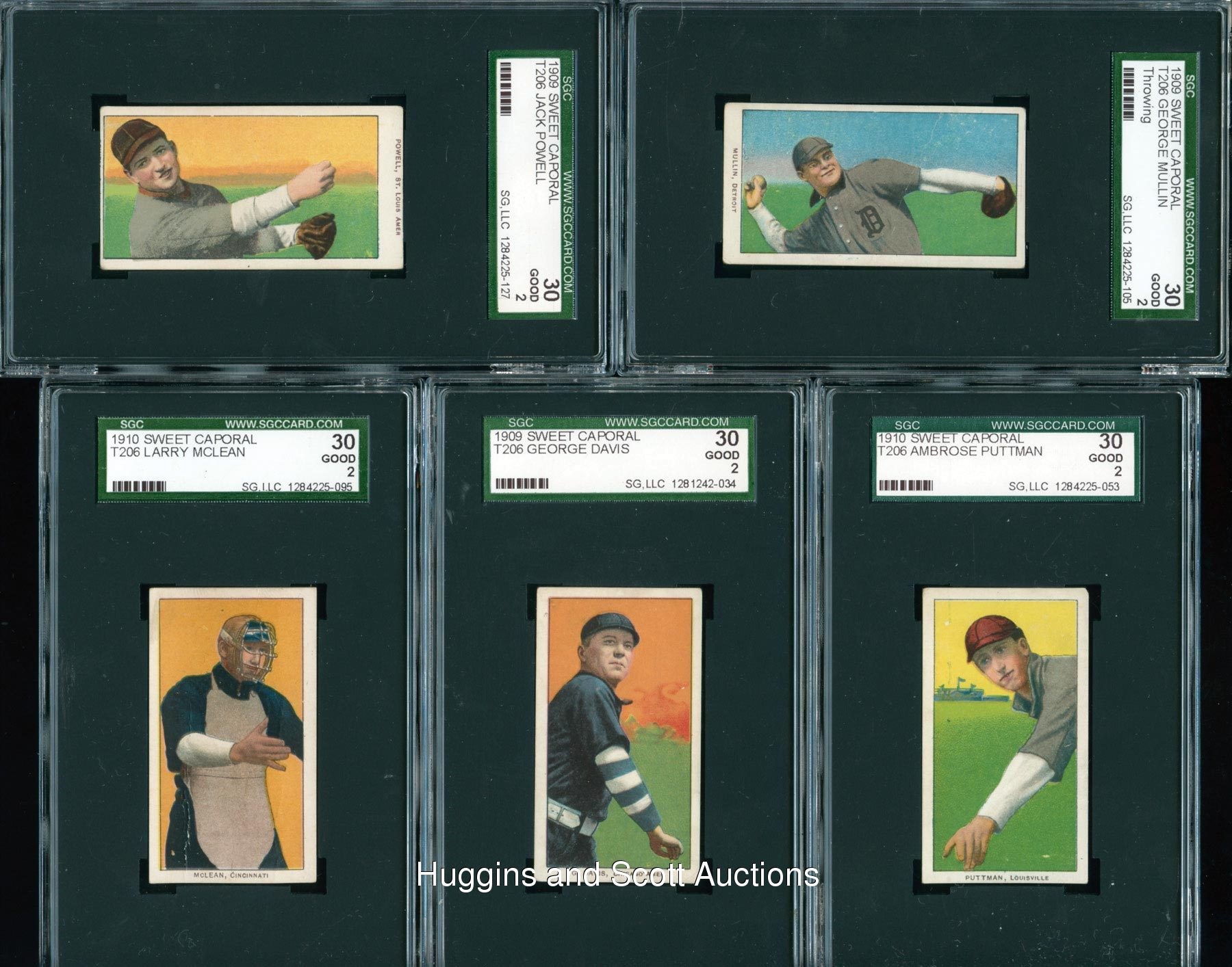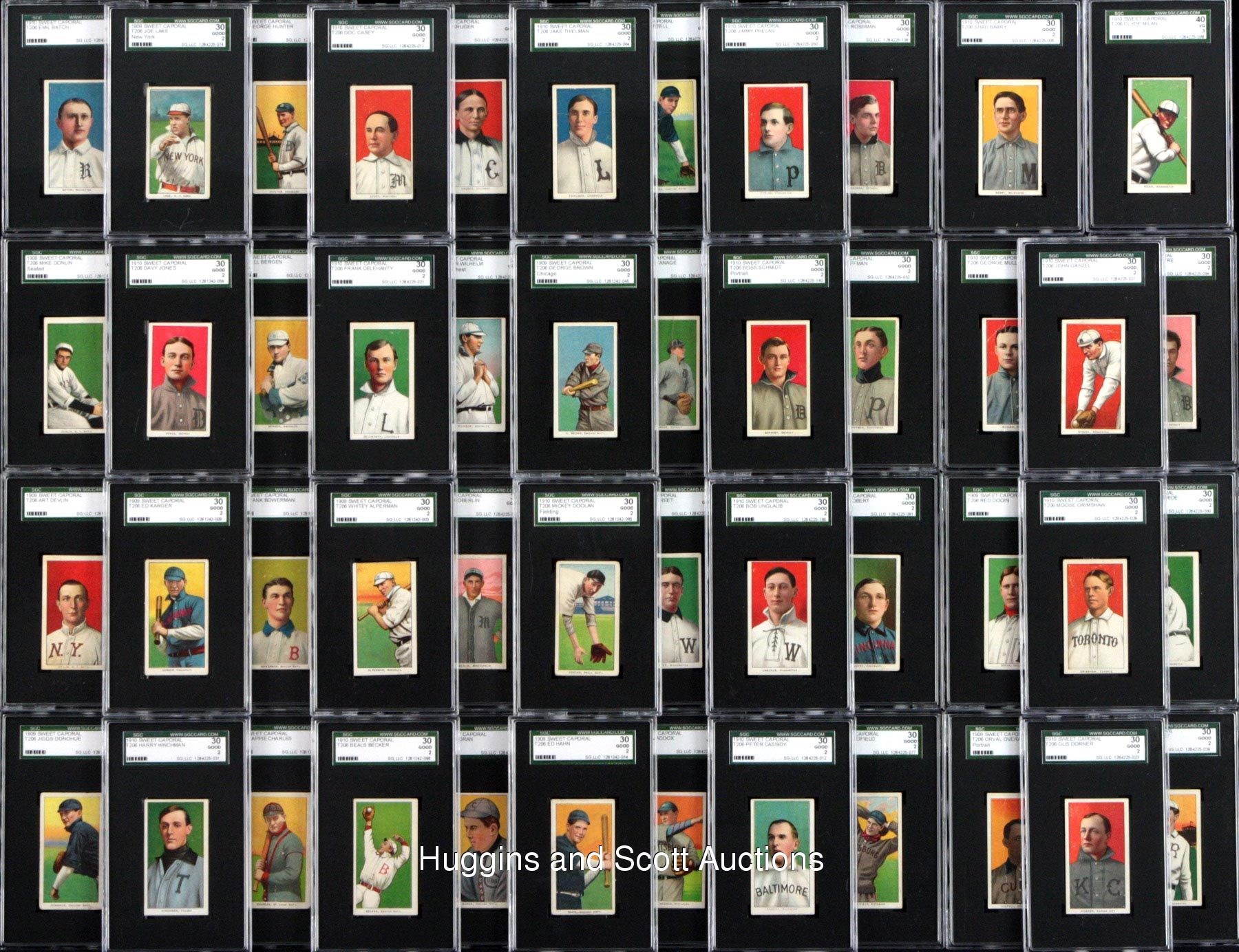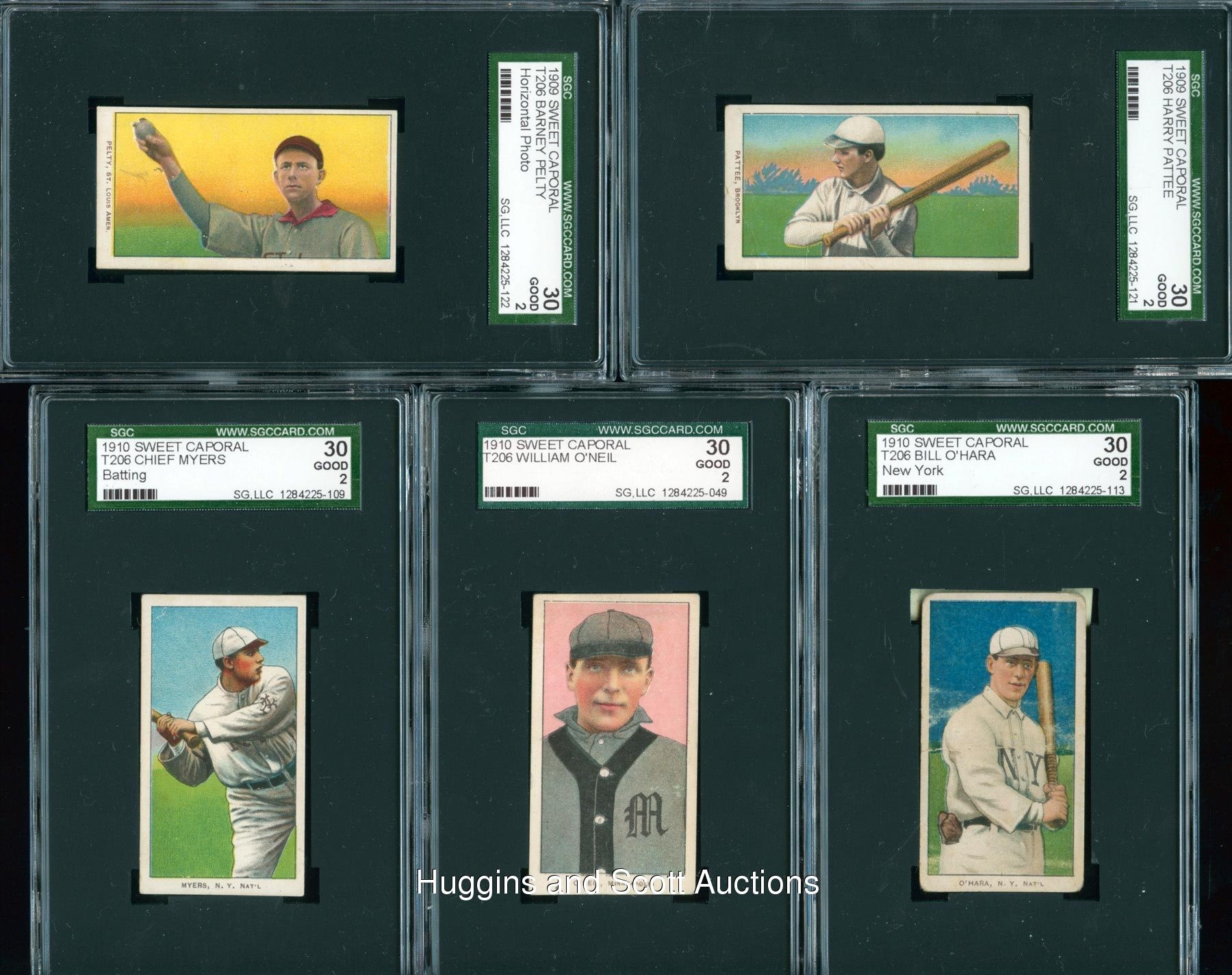Each graded 30 Good 2 by SGC. Presented are (57) 1909-11 T206 White Borders with four horizontal examples and a Hall of Famer. Each card in this “collector’s grade” sampling displays a Sweet Caporal advertising back. Subjects include Alperman, S. Barry, Batch, Becker, Bergen (Batting), Bowerman, G. Brown (Chicago), Casey, Cassidy, Charles, G. Davis, F. Delehanty, Devlin, Donlin (Seated), Donohue, Dooin, Doolan (Fielding), Dorner, Ganzel, Grimshaw, Hahn, H. Hinchman, I. Hoffman, Hunter, D. Jones, Karger, Kruger, Lake (New York), Leifield (Pitching), Lobert, Maddox, Maloney, McBride, McIntyre, McLean, Milan, Moran, Mullen, Mullin (Throwing), Myers (Batting), O’Hara (New York), O’Neil, Oberlin, Overall (Portrait), Pattee, Pelty (Horizontal), Phelan, Powell (double name), Purtell, Puttman, Rossman, Schmidt (portrait), Stanage, Street (Portrait), Thielman, Unglaub and Wilhelm (Hands at Chest).
