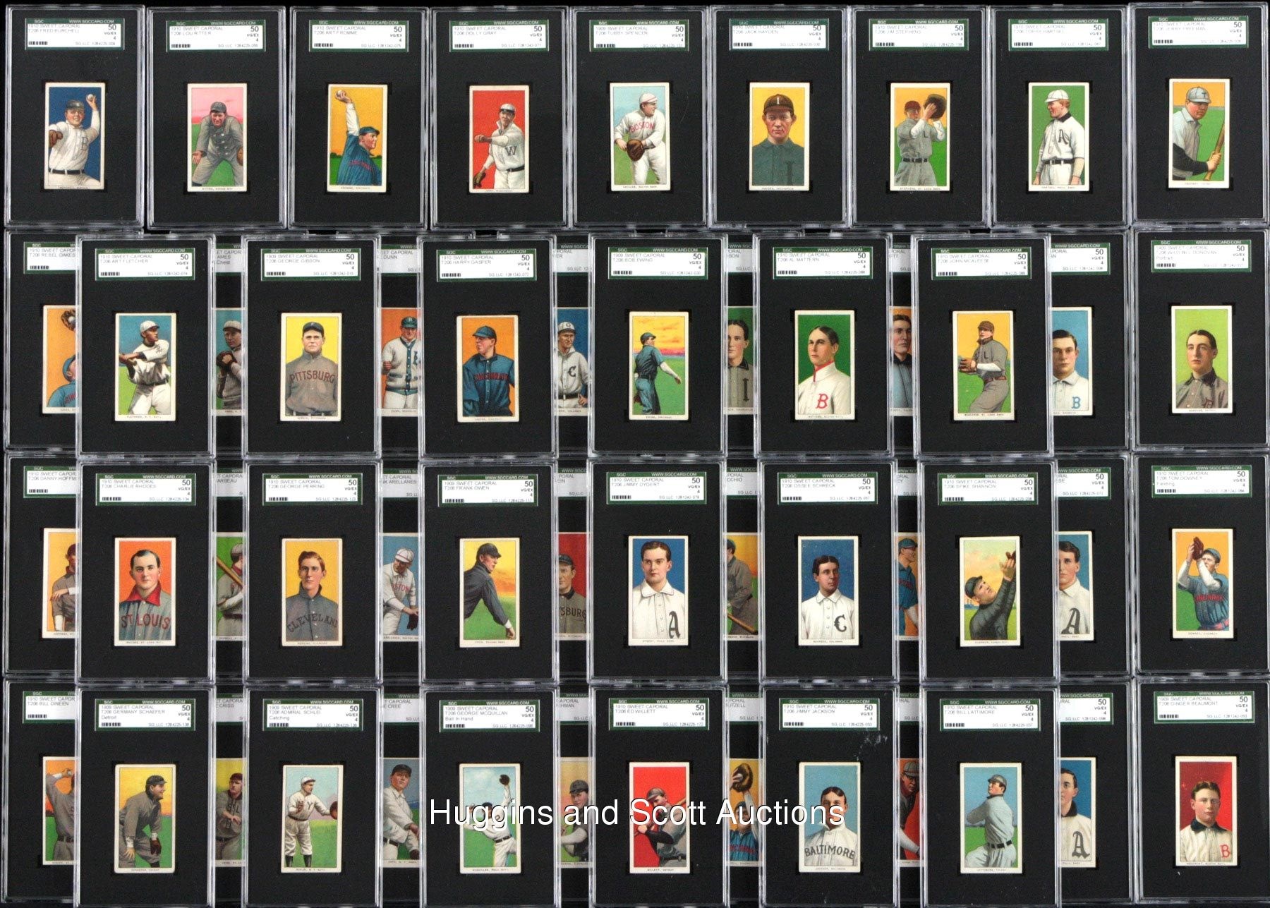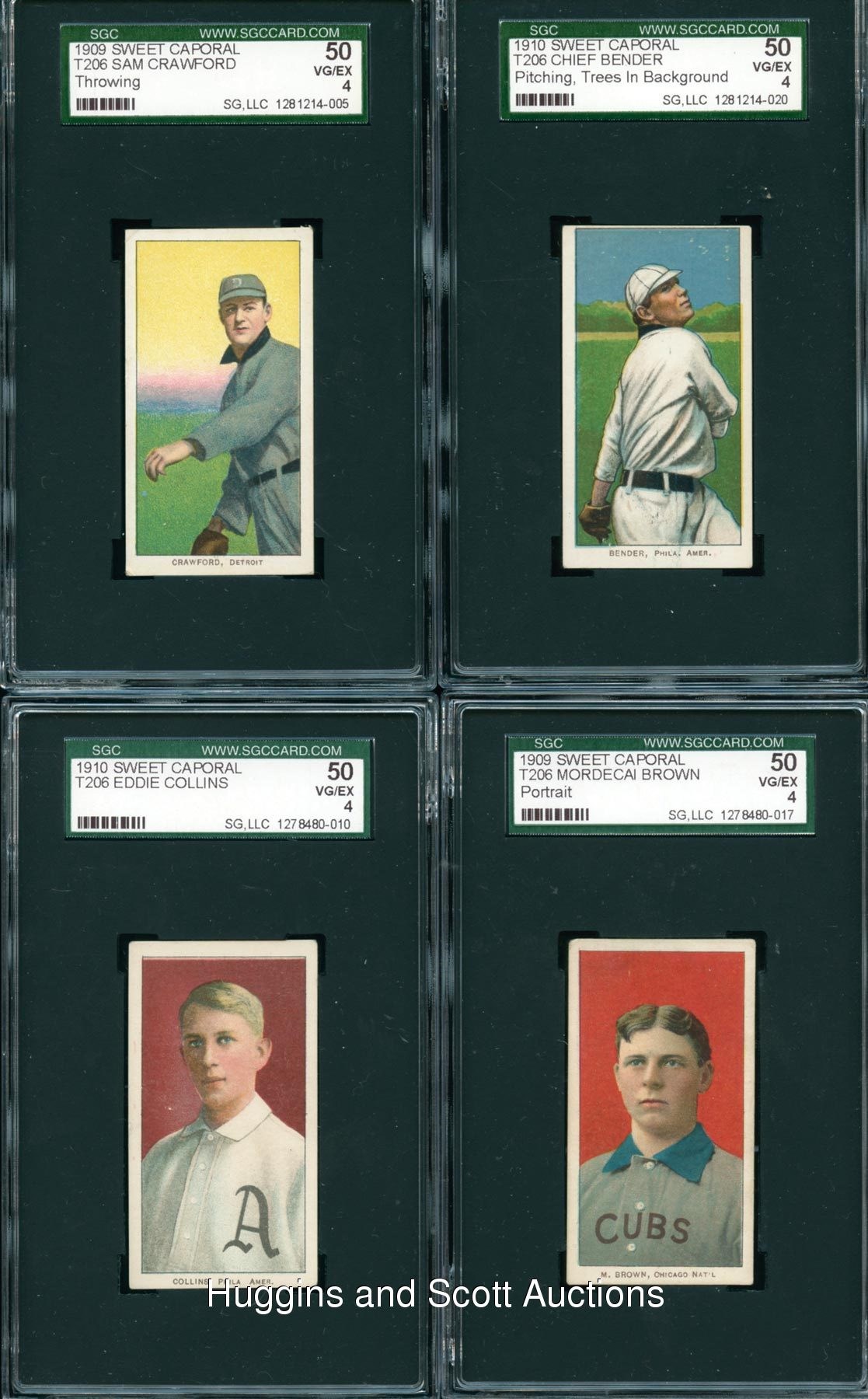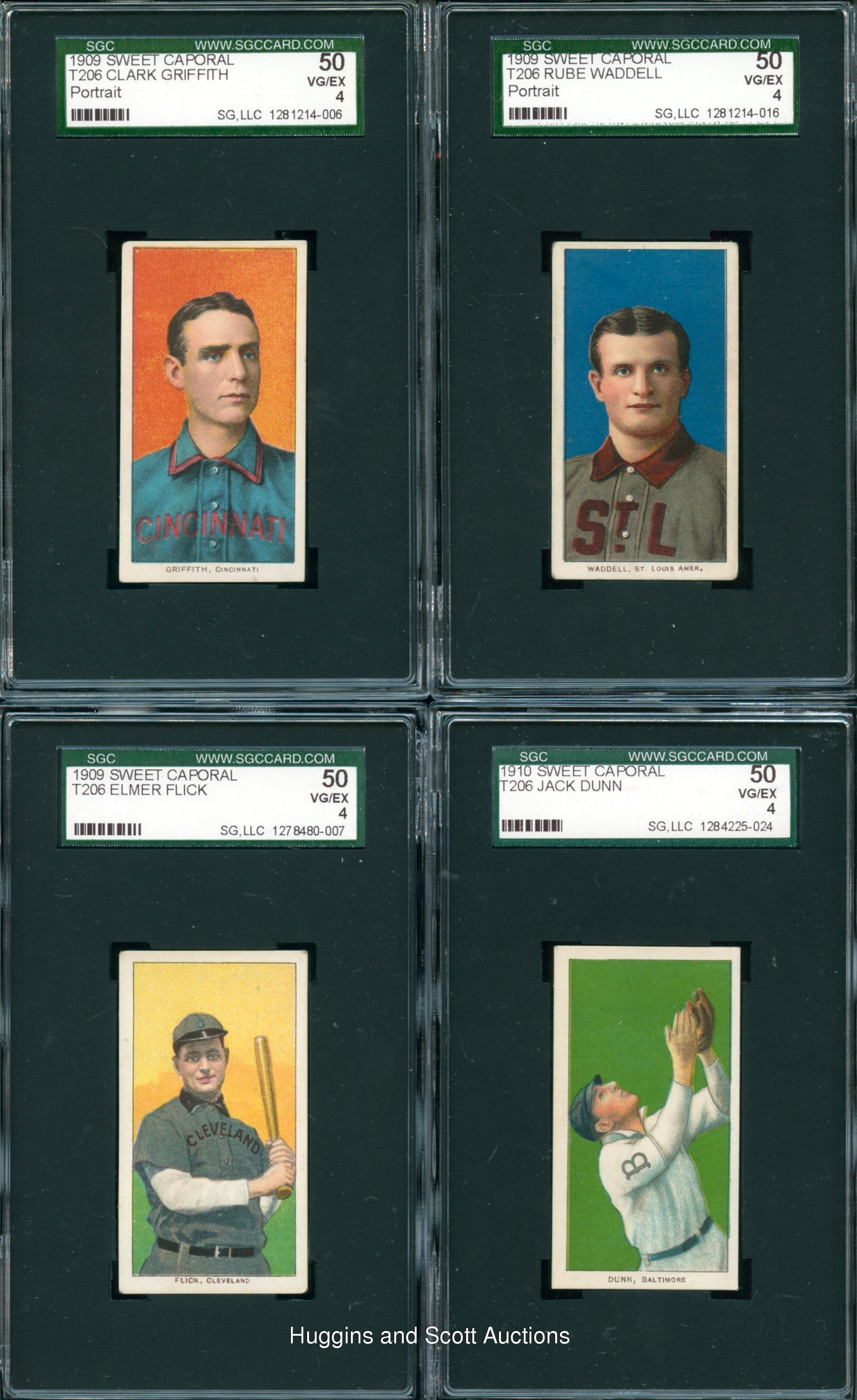 Each graded 50 VG-EX 4 by SGC. Put a dent into your 1909-11 T206 White Border project with his gallery of (59) clean samples from the designation. This grouping is headlined by (7) Hall of Famers with each displaying a Sweet Caporal advertising back. Included are Abbaticchio (Brown Sleeves), Abbott, Abstein, Ames (Hands at Chest), Arellanes, Barbeau, J. Barry, Beaumont, Bender (Pitching, with Trees), Bliss, M. Brown (Portrait), Burchell, Clymer, E. Collins, Crawford (Throwing), Cree, Criss, Davidson, Dineen, Donovan (Portrait), Downey (Fielding), Ja. Dunn, Jo. Dunn, Dygert, Ewing, Fletcher, Flick, Freeman, Fromme, Gasper, Gibson, Gray, Griffith (Portrait), Hartsel, Hayden, B. Hinchman, Hoblitzell, D. Hoffmann, J. Jackson, Jordan (Portrait), Krause (Portrait), Lattimore, Mattern, McAleese, McQuillan (Ball in Hand), Mowrey, Oakes, Owen, Perring, Rhodes, Ritter, Schaefer (Detroit), Schlei (Catching), Schreck, Shannon, Spencer, Stephens, Waddell (Portrait) and Willett.