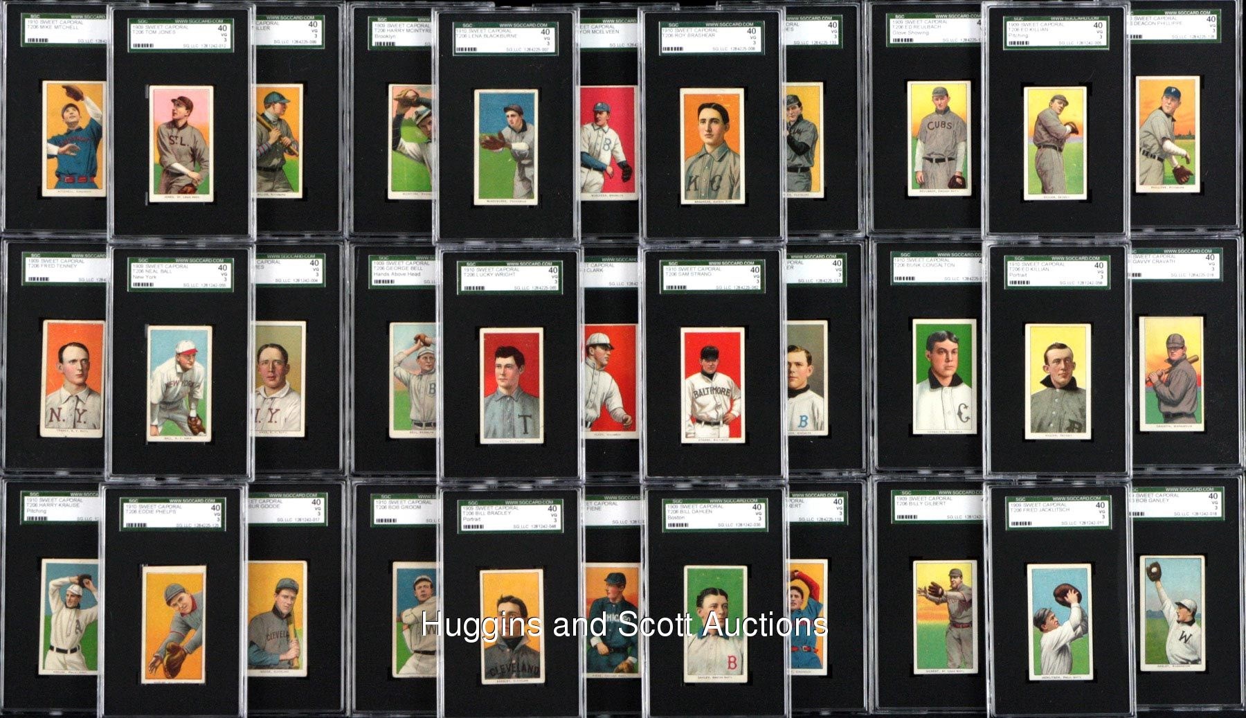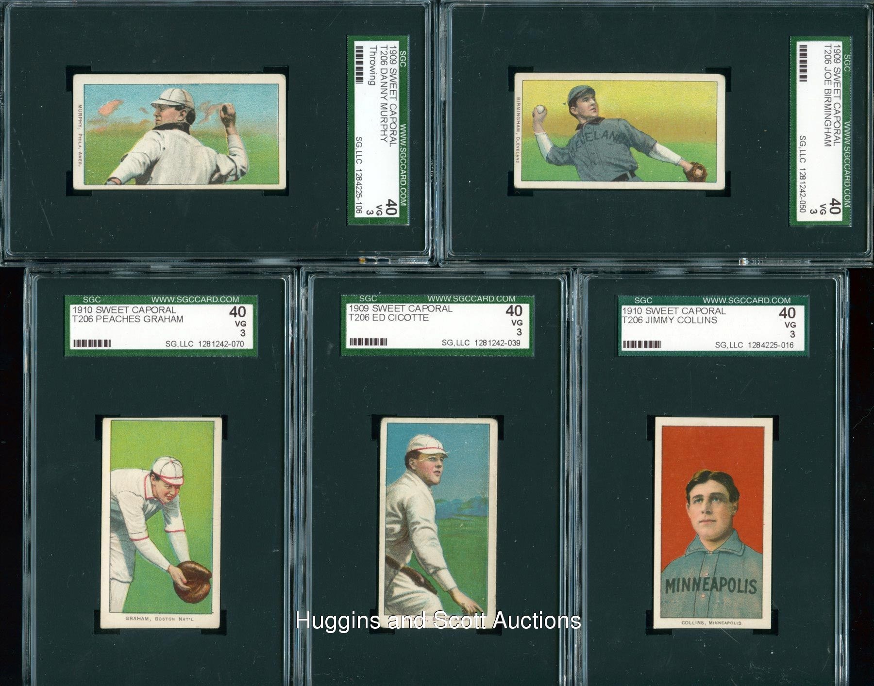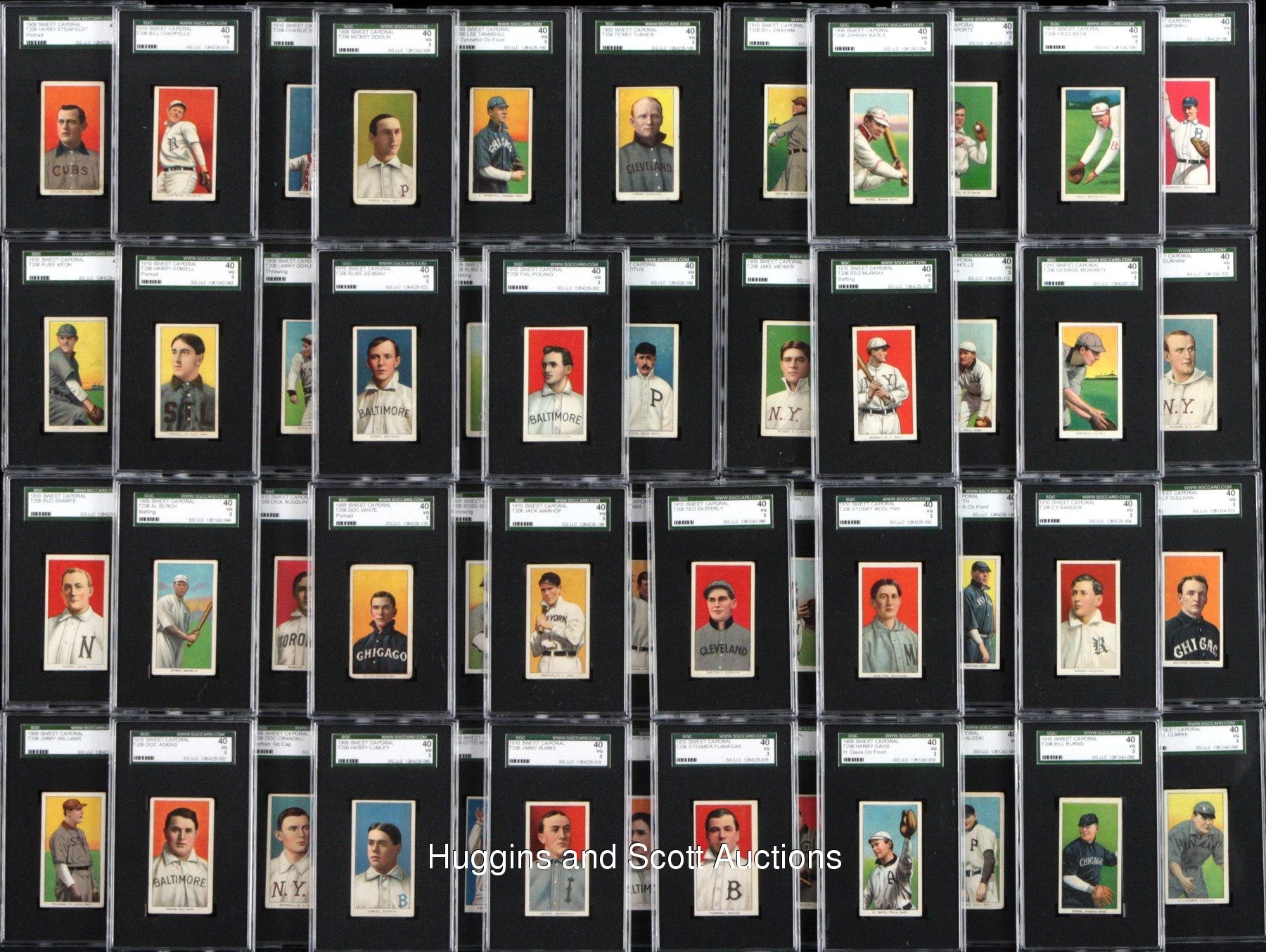 Conquer “The Monster” with these (103) 1909-11 T206 White Borders with (17) Hall of Famers including Lajoie and Young. Each graded 40 VG 3 by SGC, this crisp mid-grade gallery each displays a Sweet Caporal advertising back. Keys include Hall of Famers: (17 cards) with Bender (Portrait), Bresnahan (with Bat), M. Brown (Cubs on Shirt), Chesbro, J. Collins, Huggins (Hands at Mouth), Joss (Portrait), Keeler (with Bat), Lajoie (Portrait), Marquard (Hands at Thighs), Marquard (Portrait), McGinnity, McGraw (Portrait, No Cap), Waddell (Throwing), Walsh, Willis (portrait), C. Young (Bare Hand Shows); Commons/Stars: (86 cards) with Birmingham (horizontal), Cicotte and Murphy (Throwing). More on our website. Hall of Famers: (17 cards) with Bender (Portrait), Bresnahan (with Bat), M. Brown (Cubs on Shirt), Chesbro, J. Collins, Huggins (Hands at Mouth), Joss (Portrait), Keeler (with Bat), Lajoie (Portrait), Marquard (Hands at Thighs), Marquard (Portrait), McGinnity, McGraw (Portrait, No Cap), Waddell (Throwing), Walsh, Willis (portrait), C. Young (Bare Hand Shows); Commons/Stars: (86 cards) with Adkins, Ames (Portrait), Ball (New York), Barger, Bates, Beck, Bell (Hands above Head), Birmingham (horizontal), Blackburne, Bradley (portrait), Brashear, Burch (Batting), Burke, Burns, Chappelle, Cicotte, Clark, J. Clarke, Congalton, Covaleski, Crandall (Portrait, No Cap), Cravath, Dahlen (Boston), H. Davis (Initialed Front), Dessau, Doolin, Doyle (Throwing), Durham, Easterly, Fiene (Throwing), Flanagan, Ganley, Gilbert, Goode, B. Graham, P. Graham, Groom, Hall, Hofman, Howell (Portrait), Jacklitsch, T. Jones, Killian (pitching), Killian (Portrait), Knabe, Krause (Pitching), Kroh, LaPorte, Lumley, Marshall, McElveen, McGlynn, McIntyre (Brooklyn), Miller, Mitchell, Moriarty, Murphy (Throwing), Murray (Batting), Nicholls (Hands on Knees), Oldring (Fielding), Paskert, Phelps, Phillippe, Poland, Reulbach (Glove Showing), Rhoades (Hands at Chest), Rucker (Portrait), Rudolph, Schmidt (Throwing), Sharpe, Shipke, F. Smith (Chicago Front), Starr, Steinfeldt (Portrait), Strang, Sullivan, L. Tannehill (Initialed Front), Tenney, I. Thomas, Titus, Turner, Warhop, Weimer, D. White (Portrait), Williams, Wright