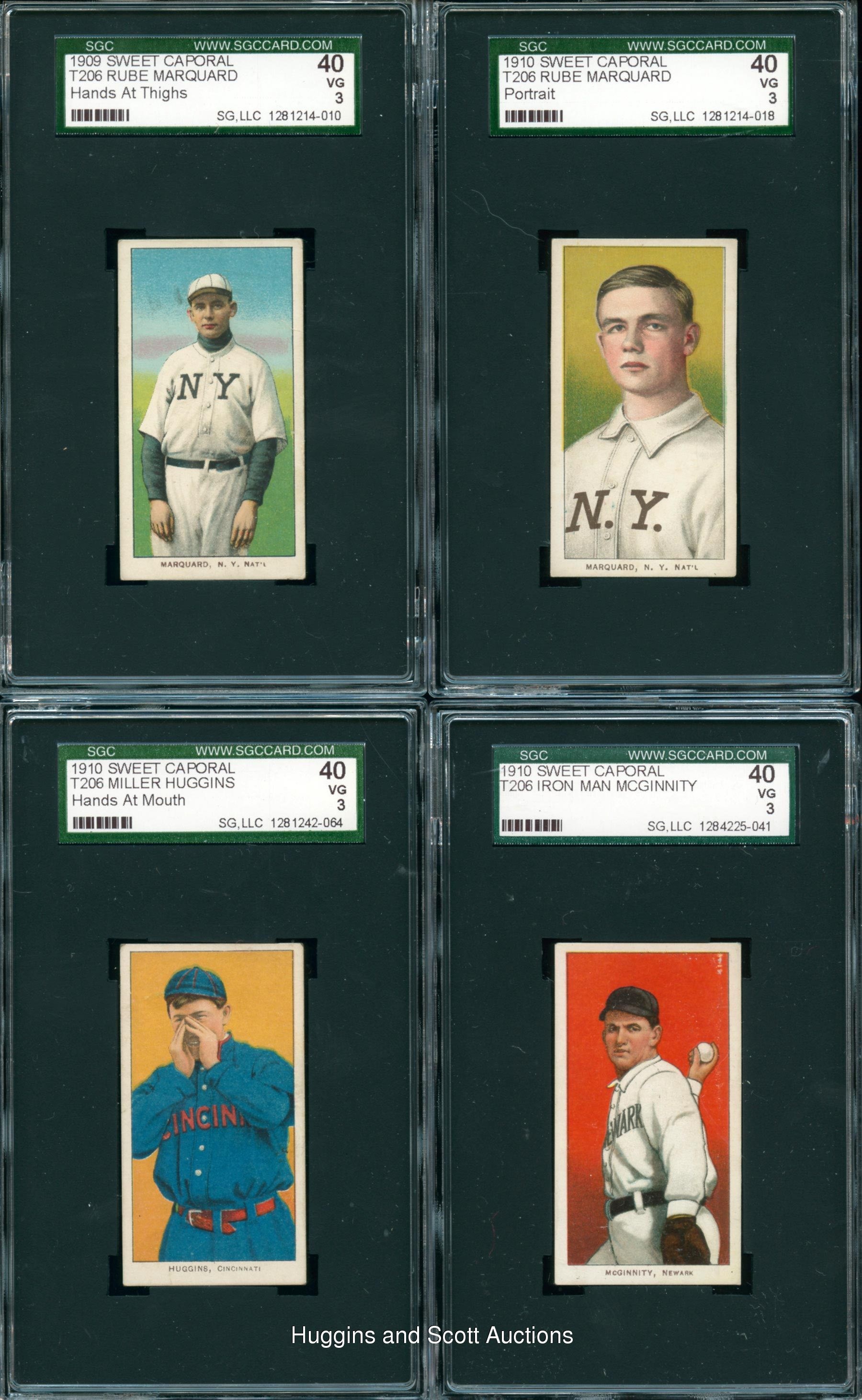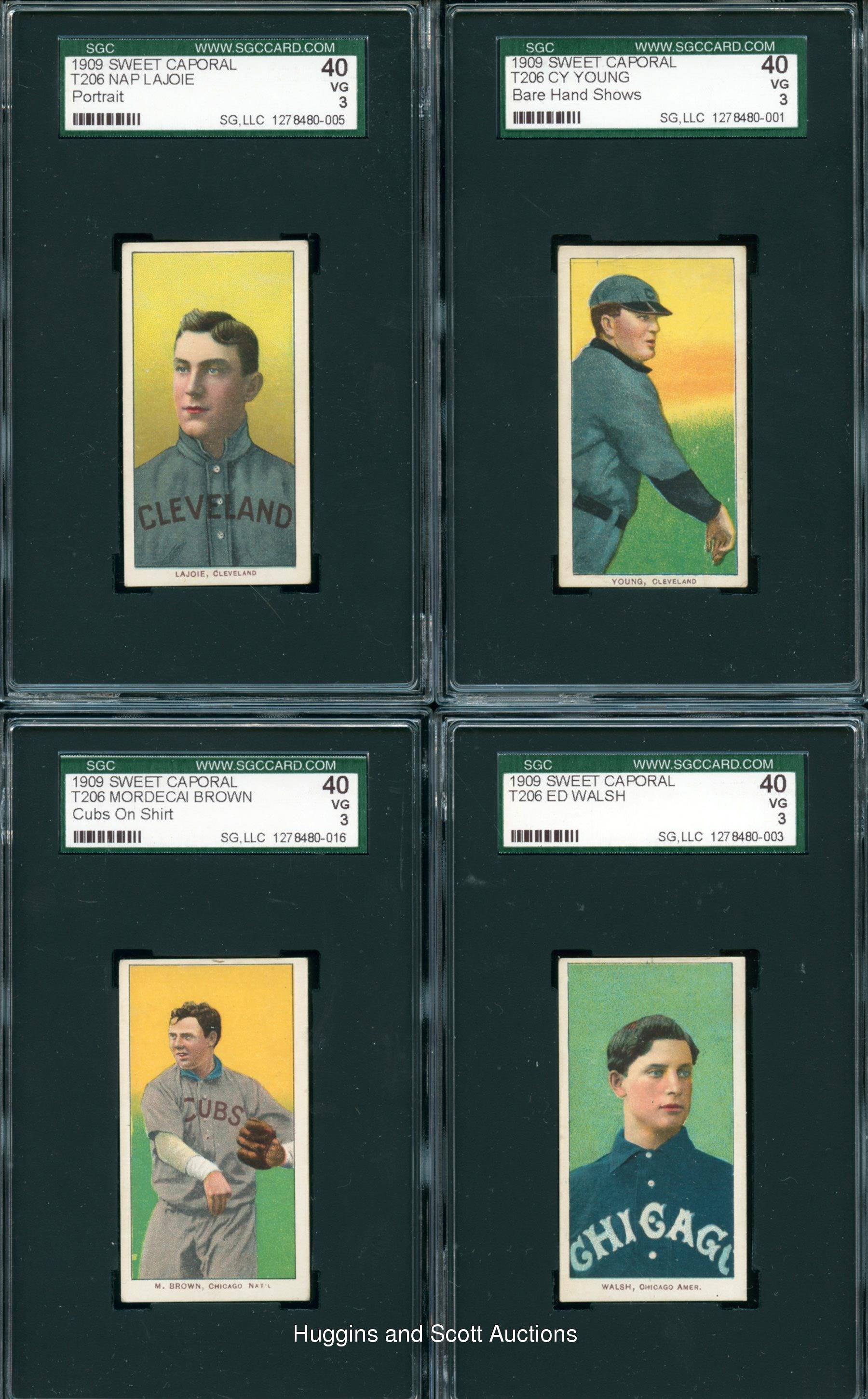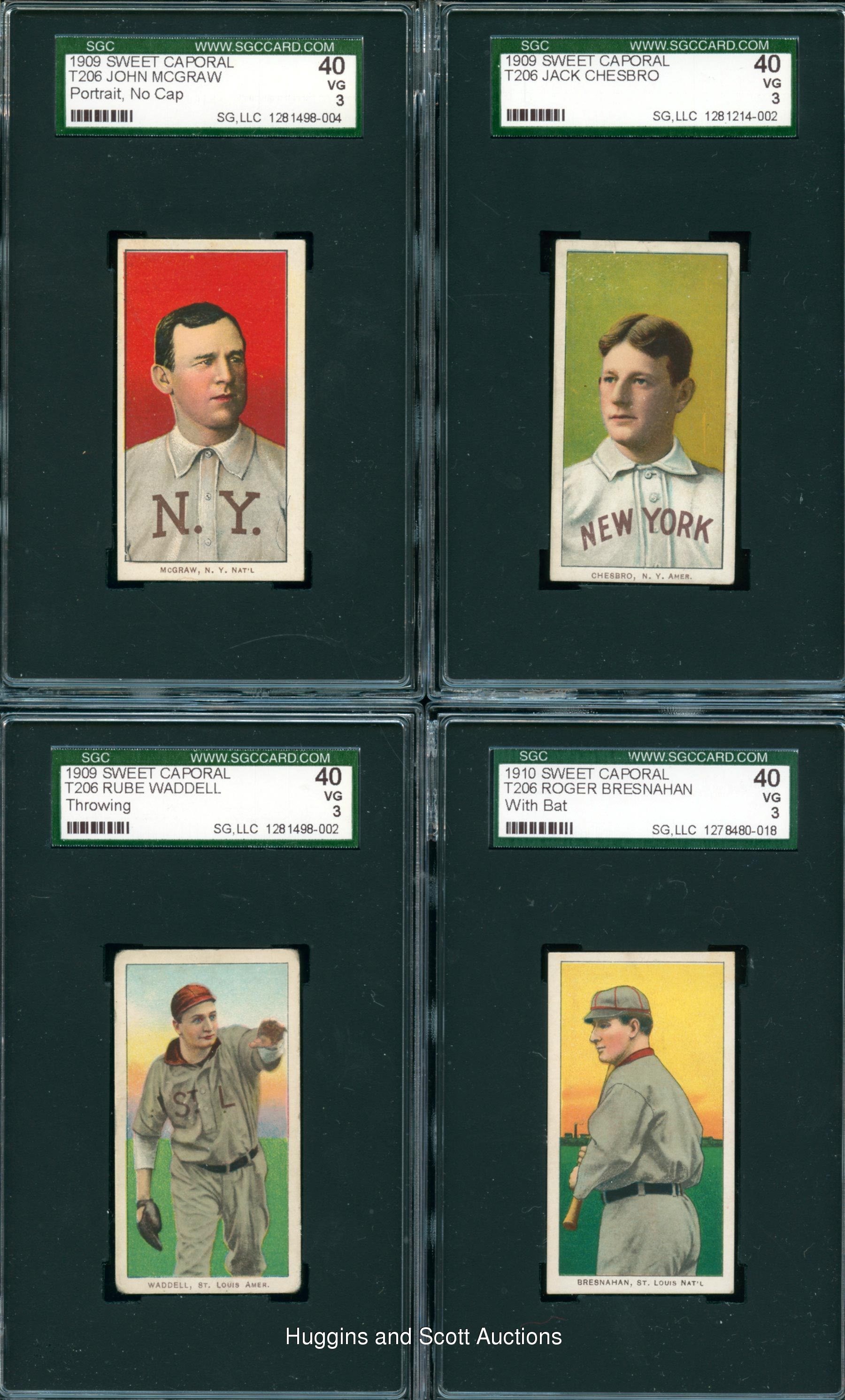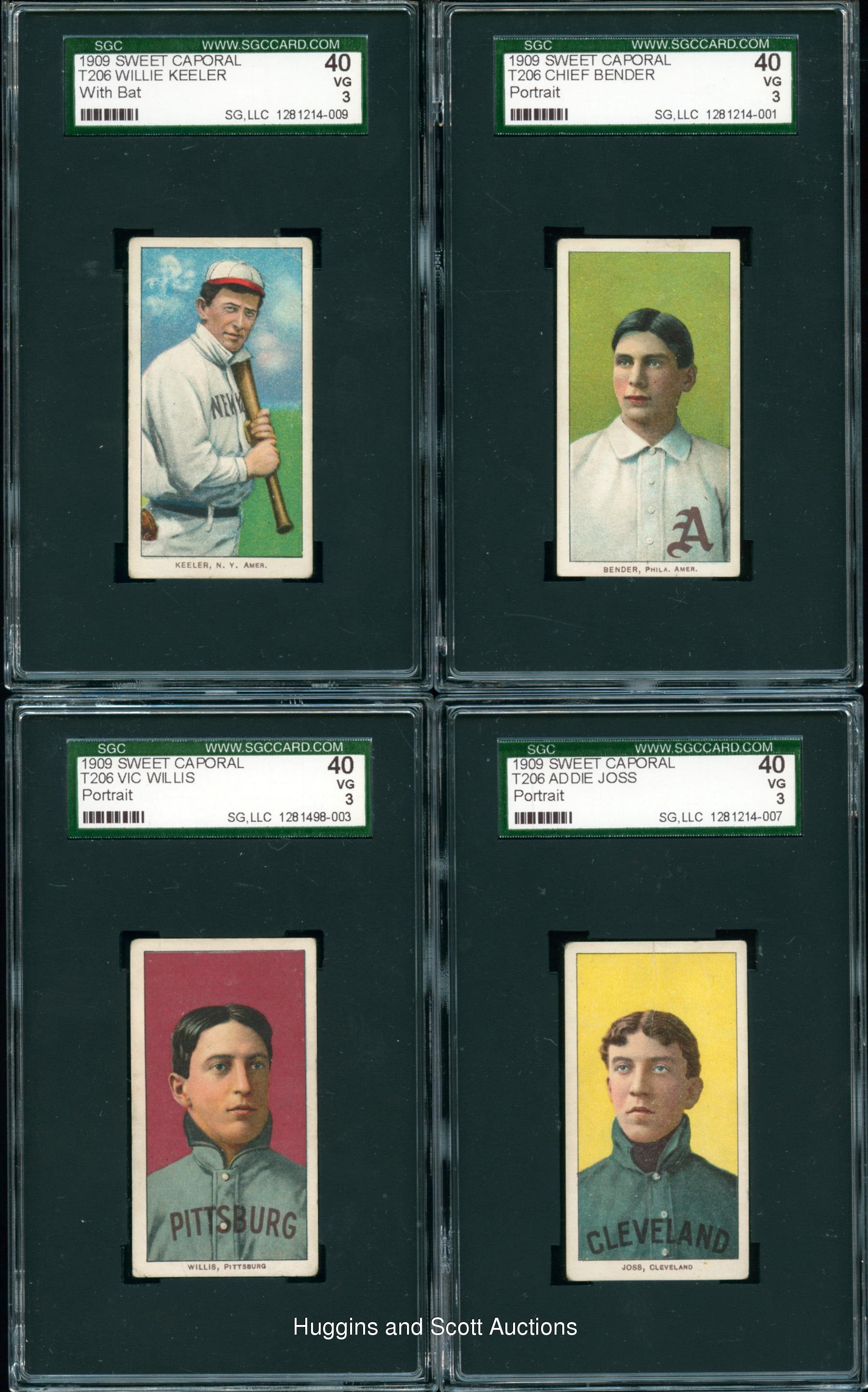 Conquer “The Monster” with these (103) 1909-11 T206 White Borders with (17) Hall of Famers including Lajoie and Young. Each graded 40 VG 3 by SGC, this crisp mid-grade gallery each displays a Sweet Caporal advertising back. Keys include Hall of Famers: (17 cards) with Bender (Portrait), Bresnahan (with Bat), M. Brown (Cubs on Shirt), Chesbro, J. Collins, Huggins (Hands at Mouth), Joss (Portrait), Keeler (with Bat), Lajoie (Portrait), Marquard (Hands at Thighs), Marquard (Portrait), McGinnity, McGraw (Portrait, No Cap), Waddell (Throwing), Walsh, Willis (portrait), C. Young (Bare Hand Shows); Commons/Stars: (86 cards) with Birmingham (horizontal), Cicotte and Murphy (Throwing). More on our website. Hall of Famers: (17 cards) with Bender (Portrait), Bresnahan (with Bat), M. Brown (Cubs on Shirt), Chesbro, J. Collins, Huggins (Hands at Mouth), Joss (Portrait), Keeler (with Bat), Lajoie (Portrait), Marquard (Hands at Thighs), Marquard (Portrait), McGinnity, McGraw (Portrait, No Cap), Waddell (Throwing), Walsh, Willis (portrait), C. Young (Bare Hand Shows); Commons/Stars: (86 cards) with Adkins, Ames (Portrait), Ball (New York), Barger, Bates, Beck, Bell (Hands above Head), Birmingham (horizontal), Blackburne, Bradley (portrait), Brashear, Burch (Batting), Burke, Burns, Chappelle, Cicotte, Clark, J. Clarke, Congalton, Covaleski, Crandall (Portrait, No Cap), Cravath, Dahlen (Boston), H. Davis (Initialed Front), Dessau, Doolin, Doyle (Throwing), Durham, Easterly, Fiene (Throwing), Flanagan, Ganley, Gilbert, Goode, B. Graham, P. Graham, Groom, Hall, Hofman, Howell (Portrait), Jacklitsch, T. Jones, Killian (pitching), Killian (Portrait), Knabe, Krause (Pitching), Kroh, LaPorte, Lumley, Marshall, McElveen, McGlynn, McIntyre (Brooklyn), Miller, Mitchell, Moriarty, Murphy (Throwing), Murray (Batting), Nicholls (Hands on Knees), Oldring (Fielding), Paskert, Phelps, Phillippe, Poland, Reulbach (Glove Showing), Rhoades (Hands at Chest), Rucker (Portrait), Rudolph, Schmidt (Throwing), Sharpe, Shipke, F. Smith (Chicago Front), Starr, Steinfeldt (Portrait), Strang, Sullivan, L. Tannehill (Initialed Front), Tenney, I. Thomas, Titus, Turner, Warhop, Weimer, D. White (Portrait), Williams, Wright