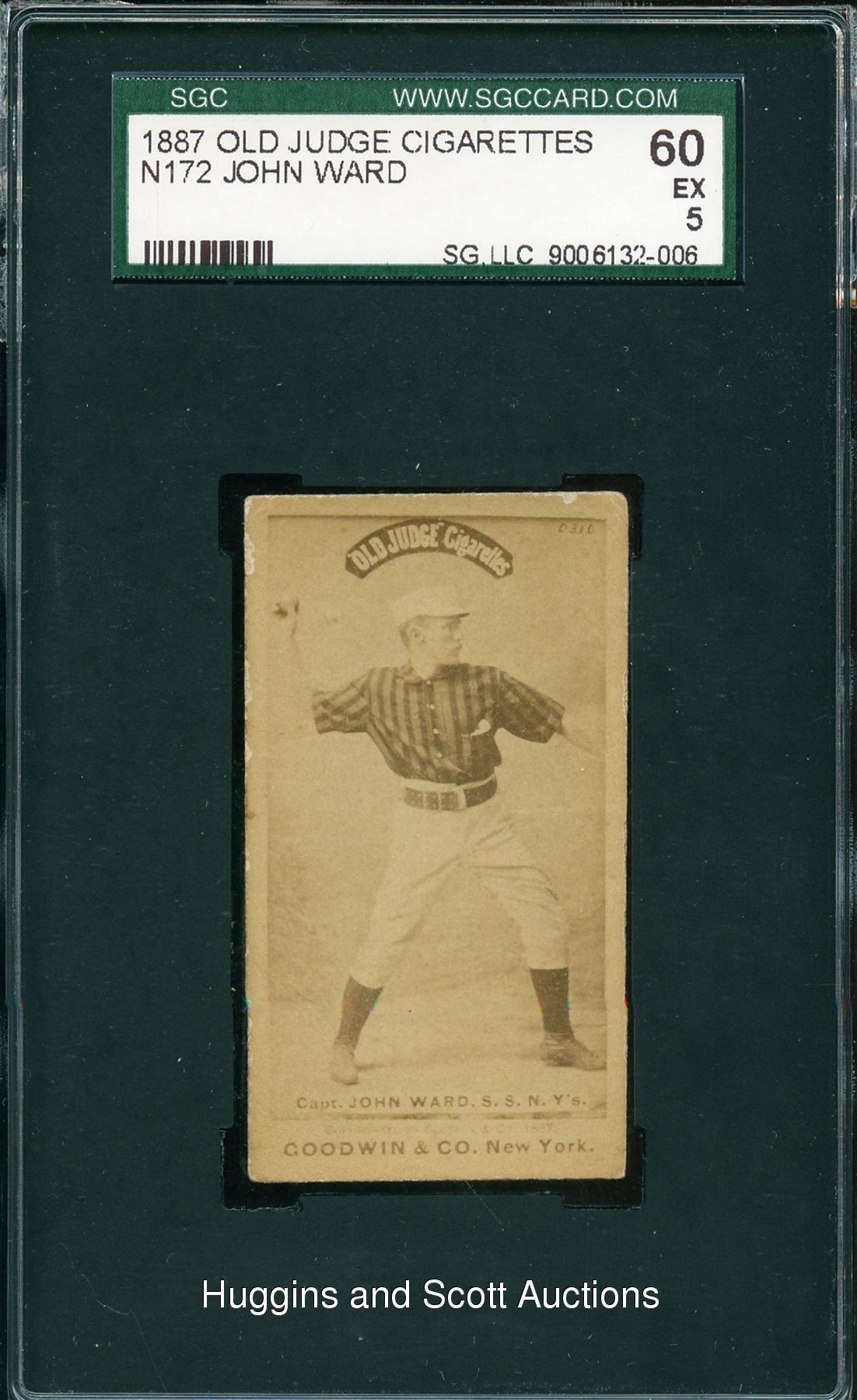 Graded 60 EX 5 by SGC. John (Monte) Ward, Captain of the New York Giants and 1964 Hall of Famer is the focus of this 1887 N172 Old Judge specimen. The Pennsylvania native is captured heaving a throw against a crease-free sepia backdrop. Incidental peripheral fraying does not disrupt the poignant and clear nineteenth century imagery. The blank reverse is clean.