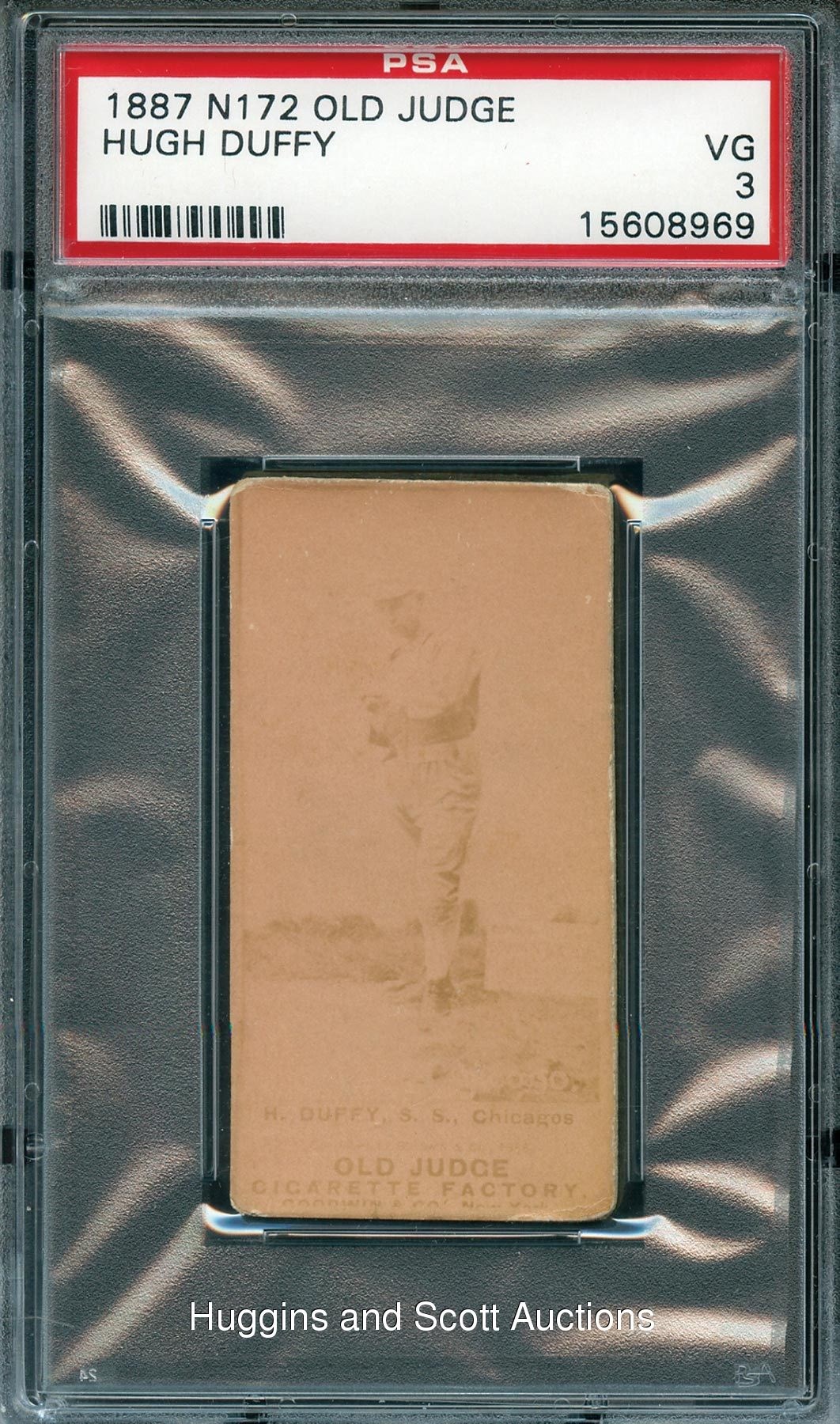 Graded VG 3 by PSA. (Sir) Hugh Duffy of the Chicago White Stockings is portrayed during his rookie campaign on the offered 1887 N172 Old Judge example. The Class of 1945 Hall of Famer is depicted as a shortstop on this 125 year-old canvas. Crease-free with even corner and edge wear along with a clean blank back makes this Duffy a winning proposition.
