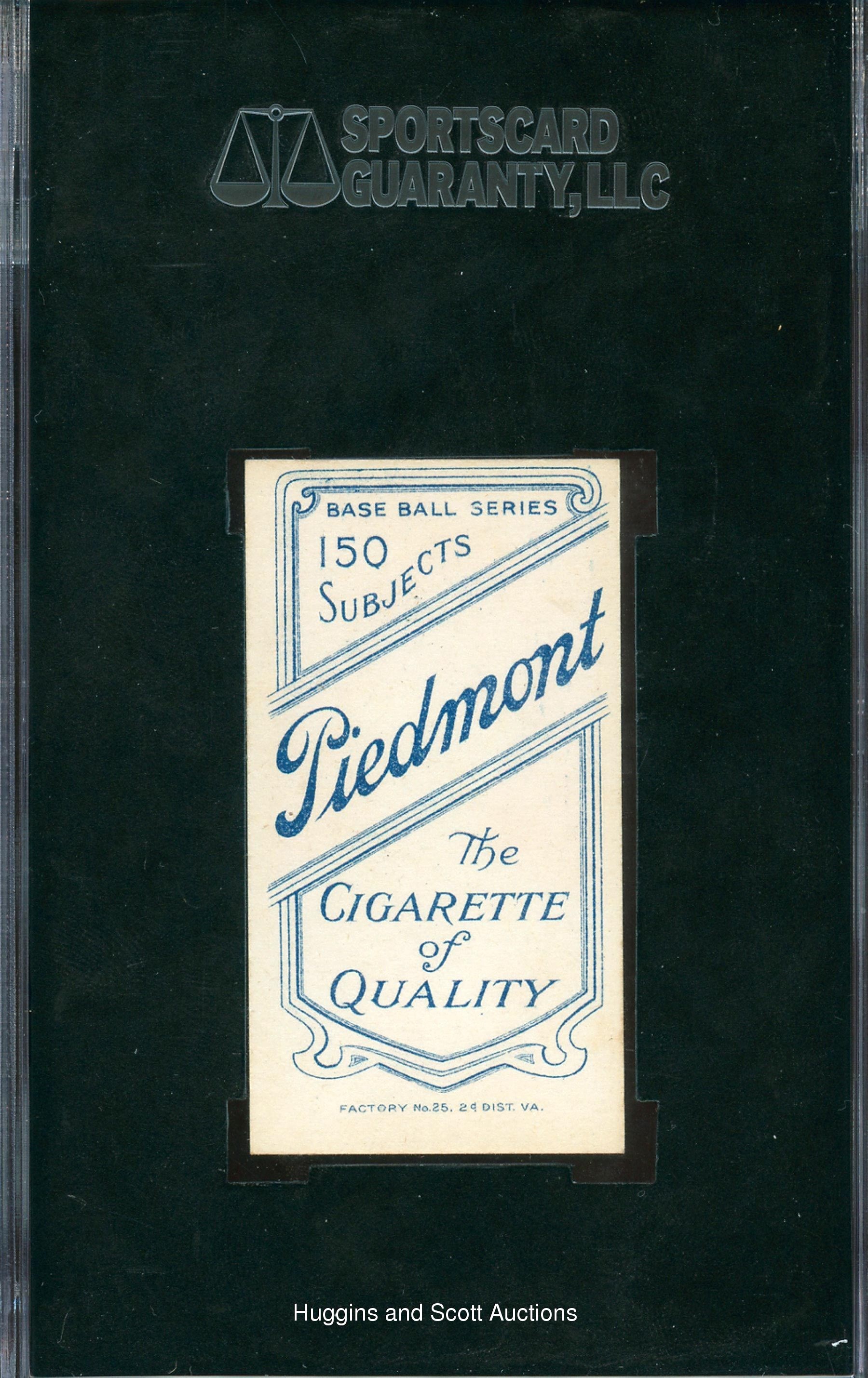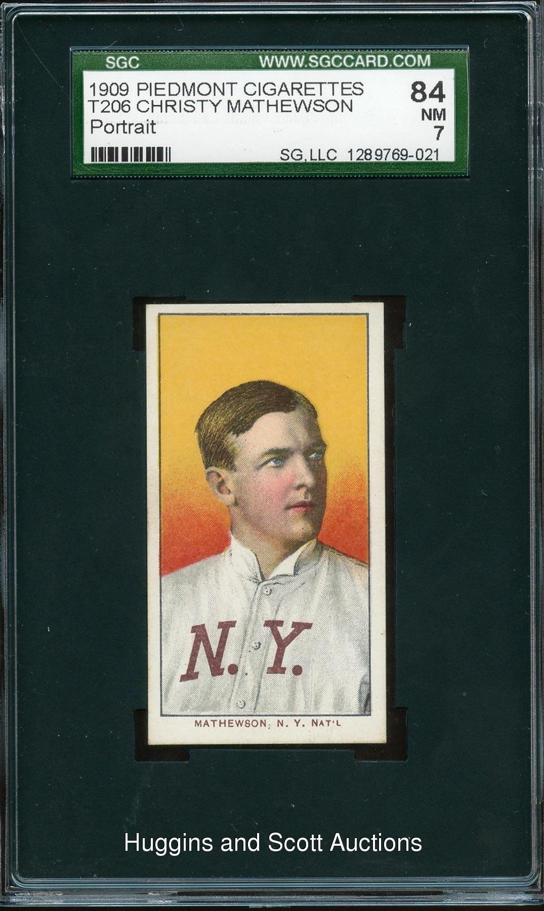 Graded 84 NM 7 by SGC. Breathtaking 1909-11 T206 White Borders Christy Mathewson portrait in a remarkable state of preservation. Recently unearthed in an antique toy box by our consignor, the canvas of the “Christian Gentleman” appears to have been virtually untouched for decades. The dapper Class of 1936 Hall of Famer emerges from an amber backdrop with razor-sharp corners, creamy edges and an unblemished surface registration. Despite slightly askew top-to-bottom centering along with a factory printing imperfection along the upper edge, any detractors are superficial when compared to the overwhelming attributes of the subject’s majestic presentation. The Piedmont 150 Subjects advertising back is clean with bright typeface. The sole Christy Mathewson pose/brand combination at this grading level with none equal or better.