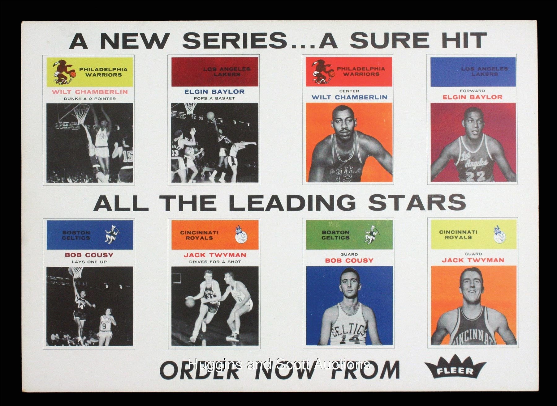 1961-62 Fleer basketball cards rank among the most coveted of basketball issues. Presented is an extremely handsome and super rare blank backed advertising panel promoting this desirable series. This exceptional panel measures 13-1/2 x 9-3/4” and presents vivid colors and bold images against a bright white background. Featured are “regular” & “in action” versions of top stars Baylor, Chamberlain, Cousy & Twyman. The 1961-62 Fleer cards are considered rookie issues for Chamberlain and Baylor compounding the interest of this seldom offered piece. More on our website Minimally affecting this dynamic offering are a barely perceptible surface wrinkle on the Twyman “in action” card, some superficial surface imperfections on the Cousy “regular” card and minor corner wear. These conditions are only evident upon close inspection and do not detract from the outstanding appearance of this upper echelon specimen.