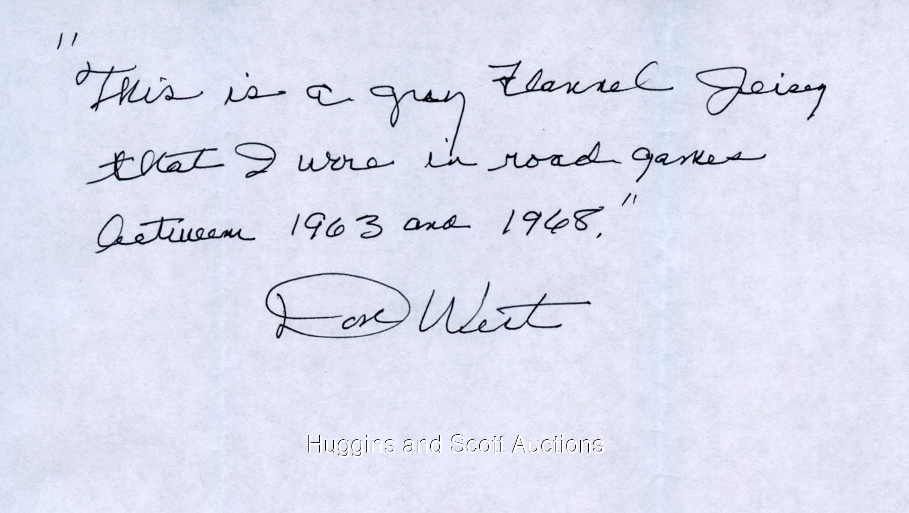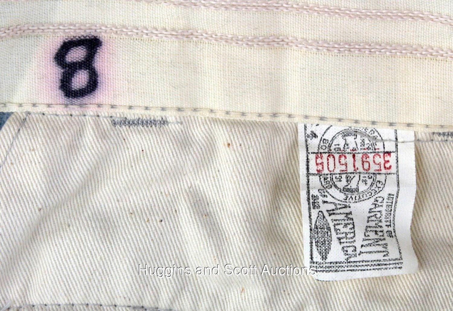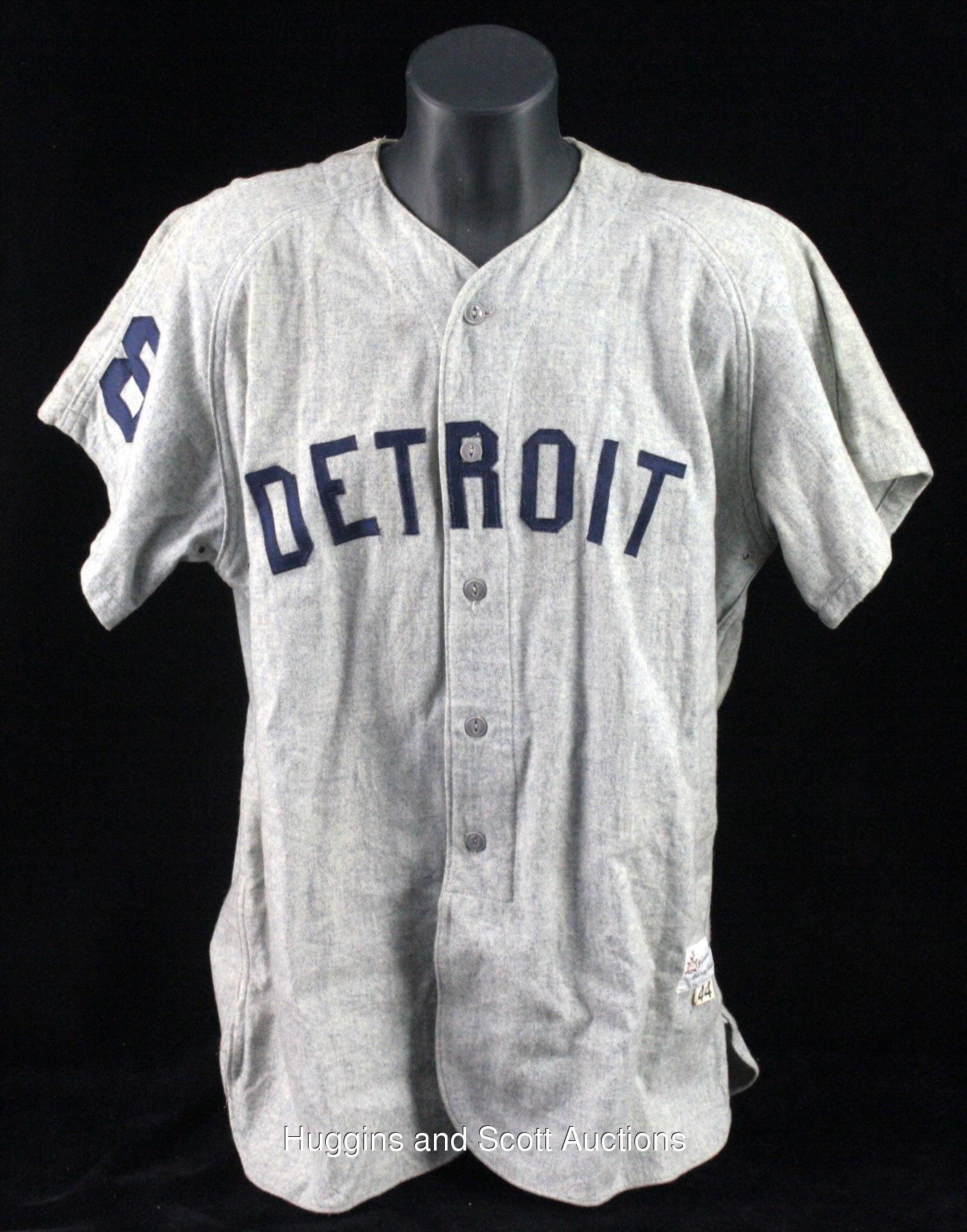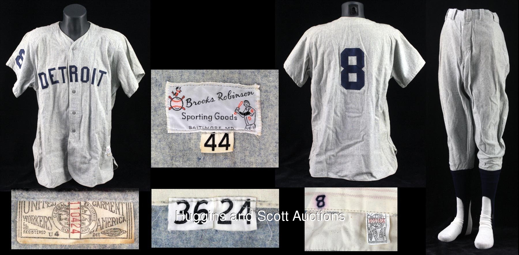 An unsung hero throughout his Motown tenure, former third baseman Don Wert earned “Mr. Tiger” honors (1965) and an All-Star Game selection (1968) in the sizable shadows of teammates Kaline and Cash (among others). During Wert’s first six big league seasons (1963-1968) he wore this Tigers road ensemble as his club rose to American League prominence. Tailored by the Brooks Robinson Sporting Goods Co., the gray flannel ensemble features proper felt identifiers. In 1965, it was Wert who became the lone third baseman during the decade to interrupt Robinson’s run of fielding percentage titles. Thus, it’s ironic that Wert wore game apparel with Robinson’s name and likeness on the label. But it was common for visiting teams to request “emergency” uniforms from Robinson’s company, who supplied name-brand garments from industry giants. This particular uniform shows moderate wear and, to Wert’s recollection, was the only one he was allowed to retain, as uniforms were returned to the team at the end of each season and re-distributed the following spring. Hand-written LOA from Don Wert. More on our website.The uniform includes: Jersey a gray flannel button-down garment with “DETROIT” arched across the chest in navy blue twill and “8” sewn to the back and left sleeve in like fashion. On the left front tail, a “Brooks Robinson Sporting Goods” label is accompanied by a size “44” tag and the rear tail’s interior is home to a union label. There are four holes (as tailored) under each arm to facilitate ventilation; Pants gray flannel leg wear with a four-button fly, six belt hoops and two canvas-lined back pockets. Within the waistband, (2) flap tags respectively denote “36” and “24.” Additionally, there is a union label and a black marker notation of “8.” Also included is a pair of white cotton socks and blue knit stirrup socks. All original and unaltered, the items show moderate wear.In addition to a handwritten LOA from Wert, we have obtained confirmation from former Brooks Robinson Sporting Goods Co. employee Bruce Genther, who offered the following correspondence:”At Brooks Robinson Sporting Goods we often produced jerseys for players during their road trips to Baltimore. The reasons vary, but every once in a while, we would get a frantic request from the Orioles or from the visiting teams equipment manager to produce a jersey that had either been recently recalled from the minors or recently obtained via trade.Many times visiting team equipment managers would only carry several extra jerseys and since Brooks Robinson was on the Advisory Board of Rawlings Sporting Goods in St. Louis and we also carried other major league uniform brands (i.e., Wilson, Spalding, MacGregor etc.) we could usually find a flannel jersey in the stock room (especially a grey road jersey like the Tigers wore in 1968 – plain jersey without any trim and plain block letters on the front in navy felt and a four inch plain block number on the right sleeve and a plain block navy felt number on the back). We had the capability to duplicate the lettering or numbering styles of any team and then hand cut the letters and numbers out of navy felt, apply to the jersey, have the letters and numbers sewn quickly and then of course add the brooks Robinson Sporting Goods label to the jersey front.”