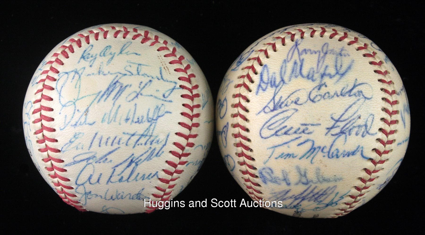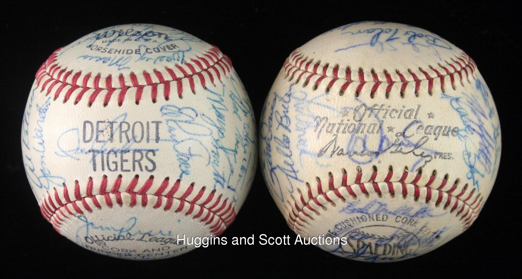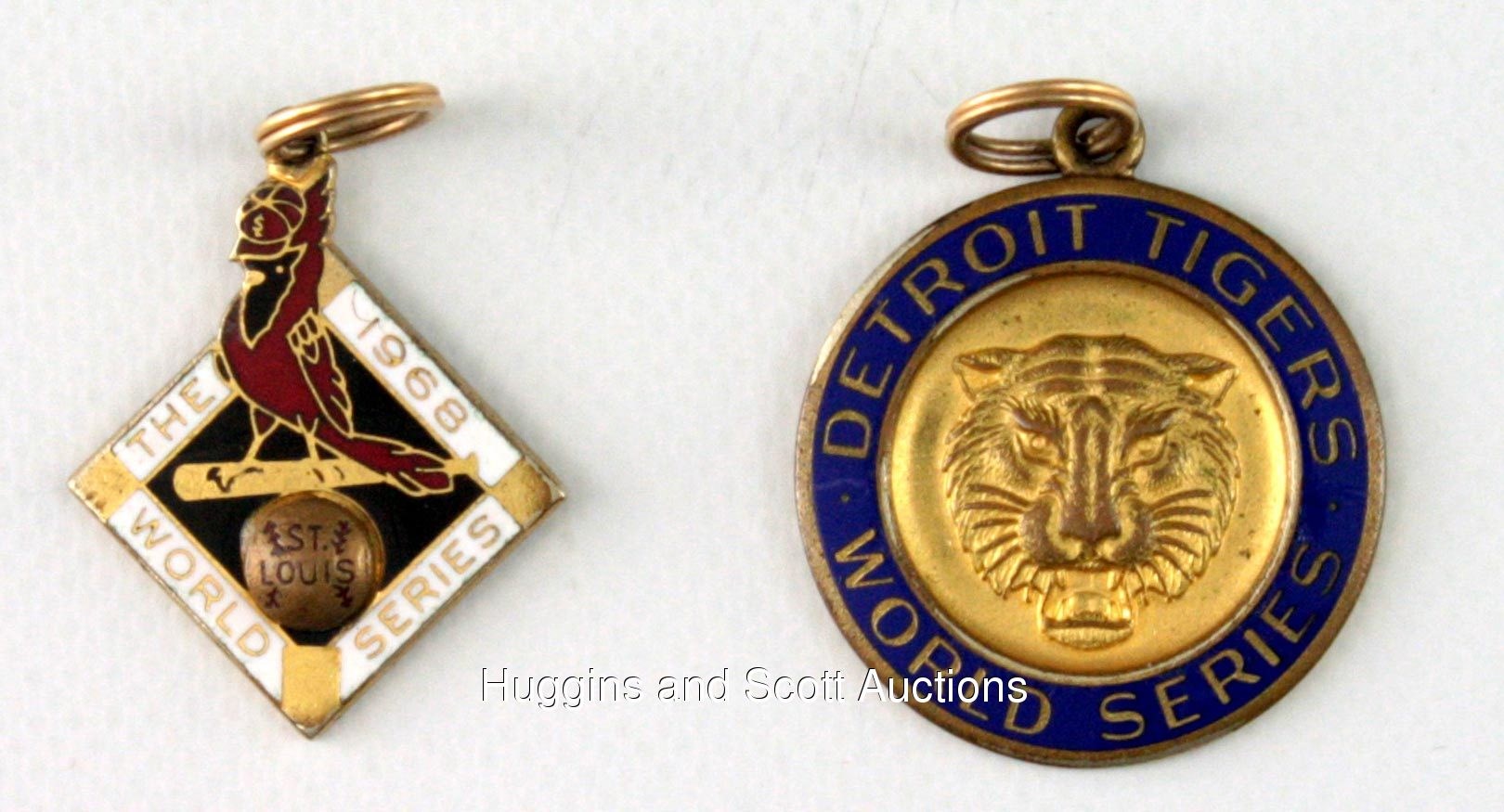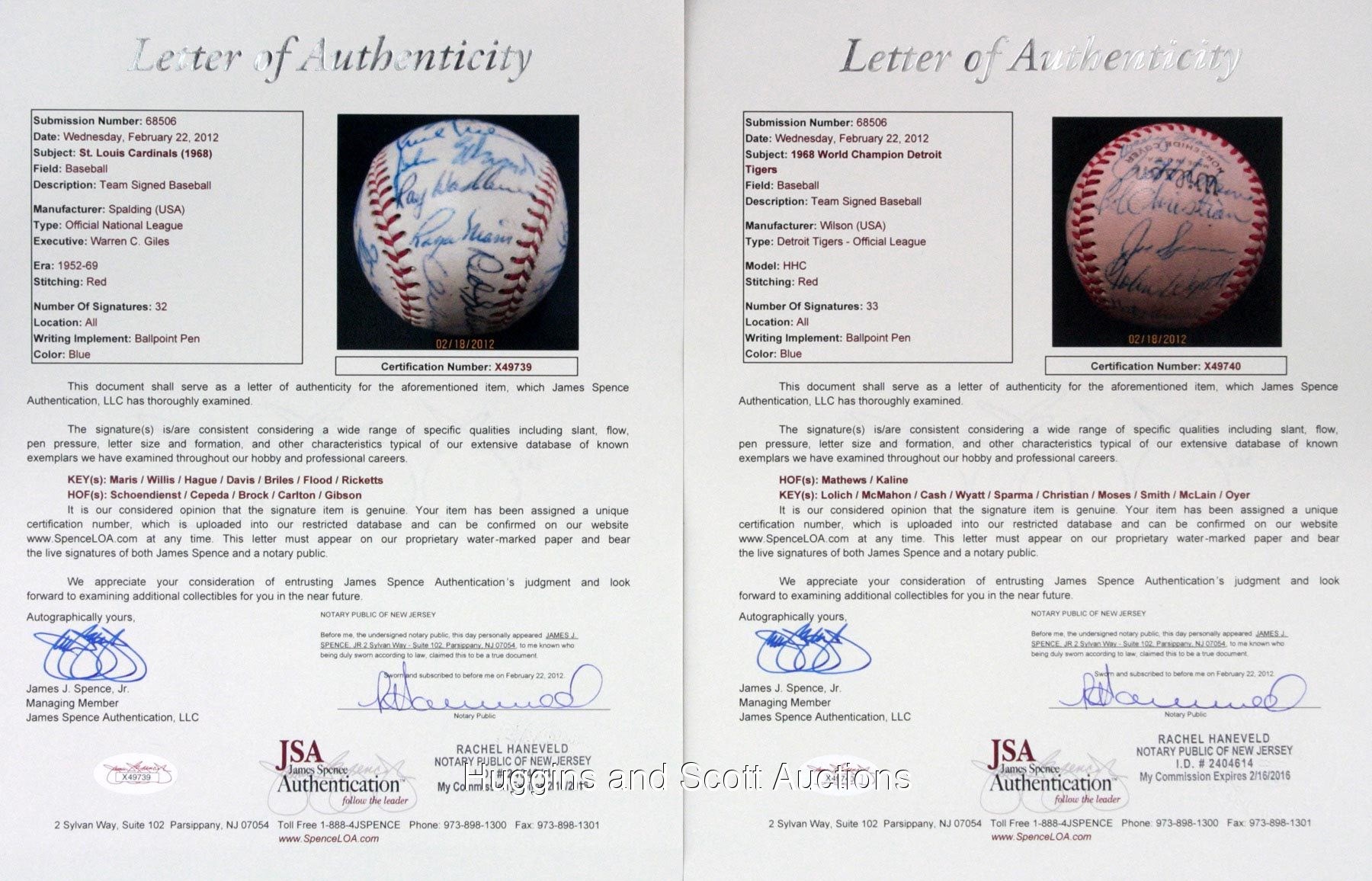 1968 was known as the “Year of the Pitcher” and it was also the year of the Tigers who captured the World Series title by defeating the Cardinals. Presented are (2) team balls and (2) press charms, one from each of the ’68 Series opponents. Endorsed by (33) the Detroit Tigers ball displays an average (“8”) quality and features key signers Kaline, Lolich, Mathews and McLain. The St. Louis Cardinals ball includes (32) autographs averaging (“7”) quality with key signers Brock, Carlton, Cepeda, Flood, Gibson, Maris, Schoendienst and Willis (d.1977). Individual full photo LOAs from JSA. More on our website. The following is a list of included signers for both balls. Tigers Ball:Sweet Spot: Cash, Cuccinello (coach)North Panel: Oyler, Stanley, McLain, McAuliffe, Mathews, Hiller, Kaline, WardenSouth Panel: Wert, Lasher, Horton, Sain (coach), Comer, Northrup, Naragon (coach), Smith, FaceReverse Sweet Spot: FreehanEast Panel: Price, Patterson, Tracewski, McMahon, Lolich, MatchickWest Panel: Moses (coach), Dobson, Christian, Sparma, Wyatt, Brown, Wilson Cardinals Ball:Sweet Spot: Schoendienst (manager), CepedaNorth Panel: Jaster, Maxvill, Carlton, Flood, McCarver, Gibson, Muffett (coach), RickettsSouth Panel: Hague, Sisler (coach), Schofield, Granger, Ricketts (repeat signature), Davis, Briles, BrockReverse Sweet Spot: WillisEast Panel: Shannon, Tolan, Hughes, Gagliano, Spiezio, HoernerWest Panel: Milliken (coach), Schultz (coach), Javier, Nelson, Edwards, Washburn, Maris