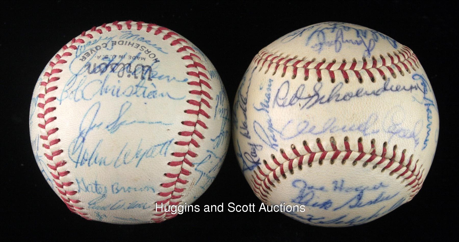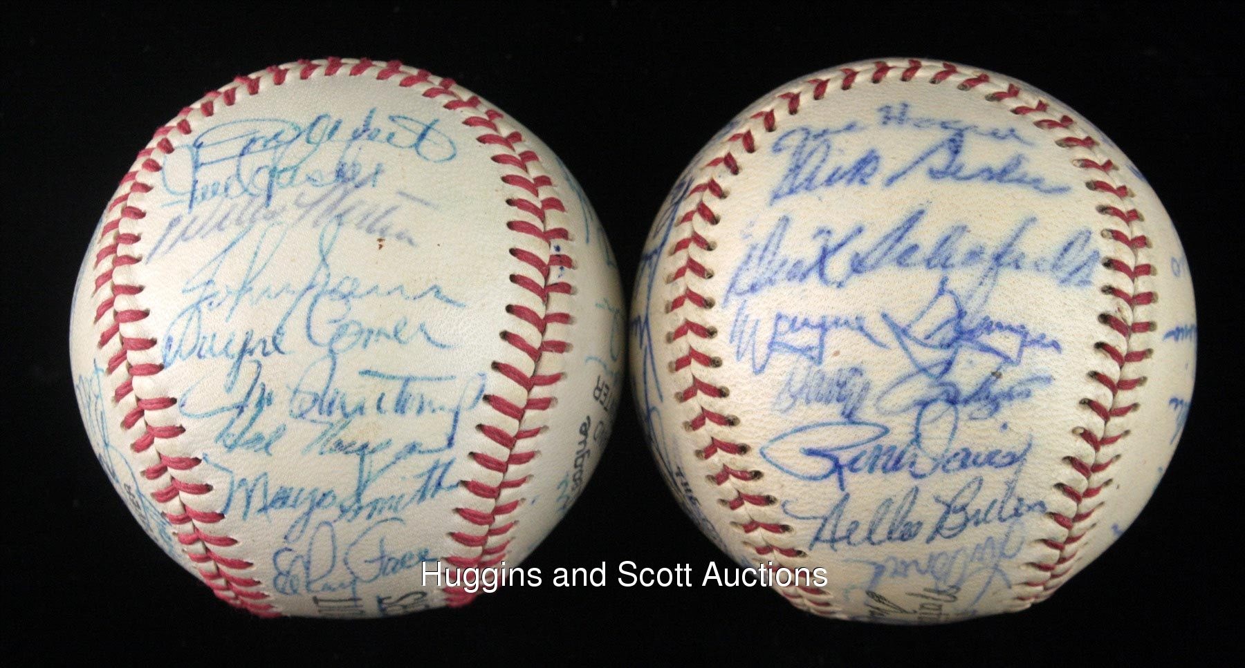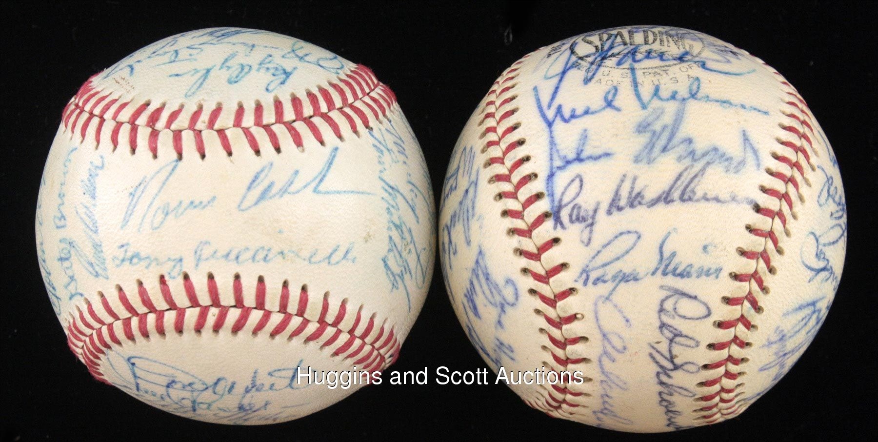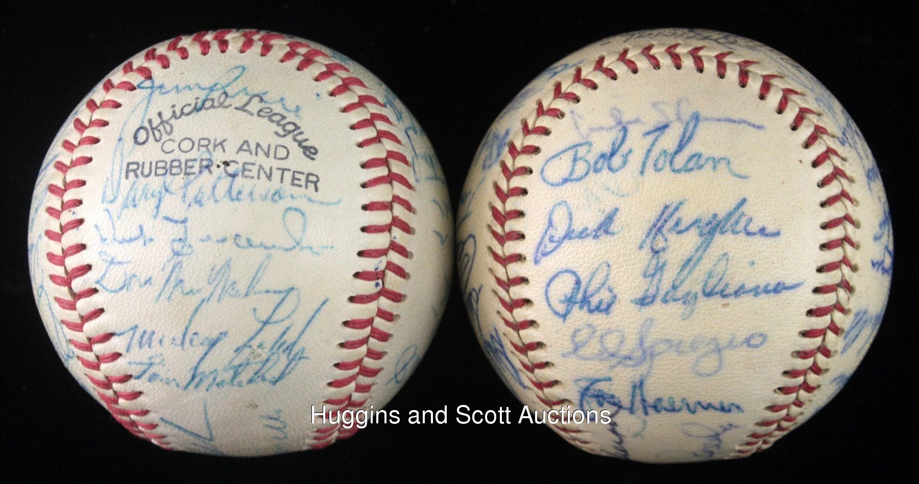 1968 was known as the “Year of the Pitcher” and it was also the year of the Tigers who captured the World Series title by defeating the Cardinals. Presented are (2) team balls and (2) press charms, one from each of the ’68 Series opponents. Endorsed by (33) the Detroit Tigers ball displays an average (“8”) quality and features key signers Kaline, Lolich, Mathews and McLain. The St. Louis Cardinals ball includes (32) autographs averaging (“7”) quality with key signers Brock, Carlton, Cepeda, Flood, Gibson, Maris, Schoendienst and Willis (d.1977). Individual full photo LOAs from JSA. More on our website. The following is a list of included signers for both balls. Tigers Ball:Sweet Spot: Cash, Cuccinello (coach)North Panel: Oyler, Stanley, McLain, McAuliffe, Mathews, Hiller, Kaline, WardenSouth Panel: Wert, Lasher, Horton, Sain (coach), Comer, Northrup, Naragon (coach), Smith, FaceReverse Sweet Spot: FreehanEast Panel: Price, Patterson, Tracewski, McMahon, Lolich, MatchickWest Panel: Moses (coach), Dobson, Christian, Sparma, Wyatt, Brown, Wilson Cardinals Ball:Sweet Spot: Schoendienst (manager), CepedaNorth Panel: Jaster, Maxvill, Carlton, Flood, McCarver, Gibson, Muffett (coach), RickettsSouth Panel: Hague, Sisler (coach), Schofield, Granger, Ricketts (repeat signature), Davis, Briles, BrockReverse Sweet Spot: WillisEast Panel: Shannon, Tolan, Hughes, Gagliano, Spiezio, HoernerWest Panel: Milliken (coach), Schultz (coach), Javier, Nelson, Edwards, Washburn, Maris
