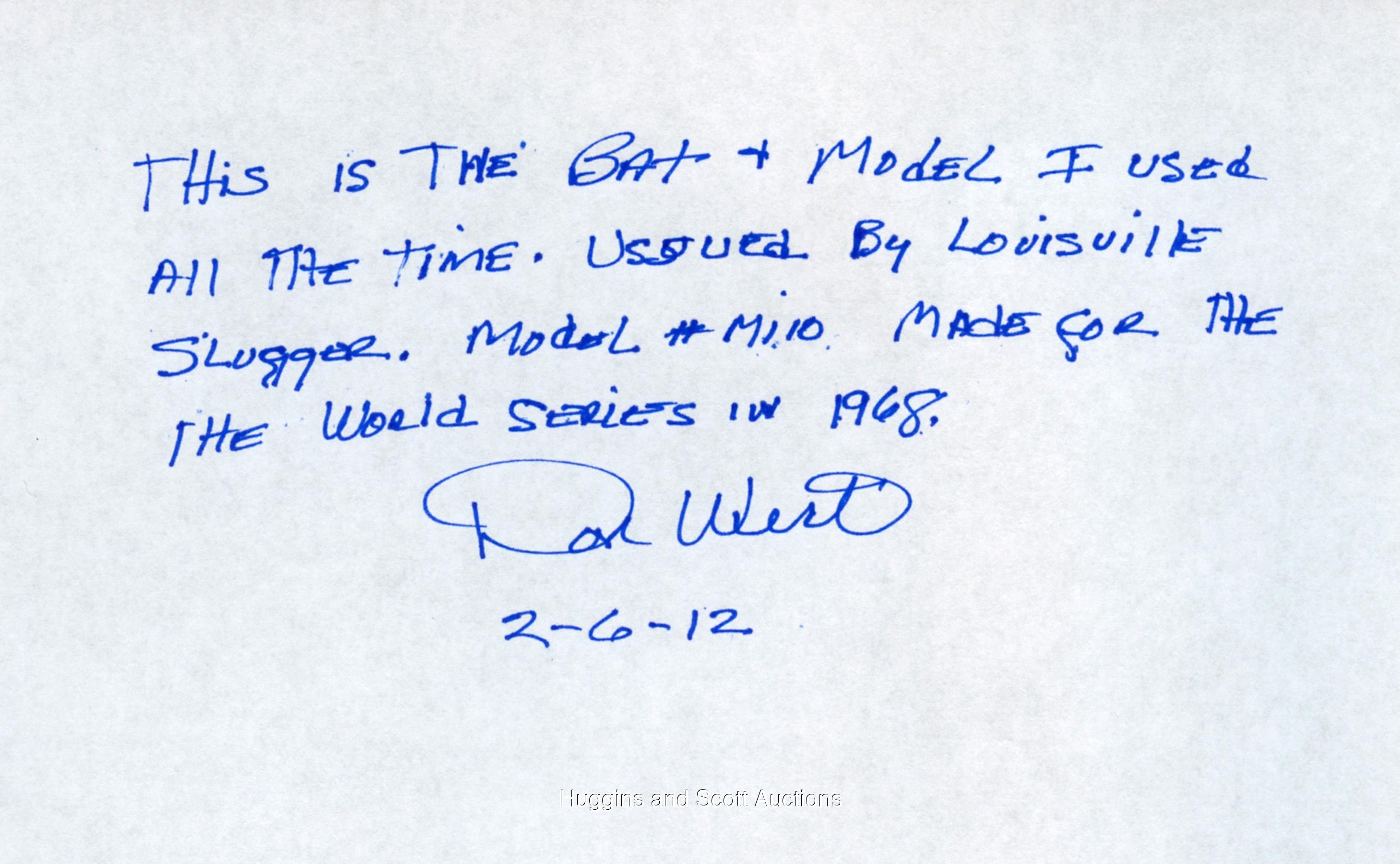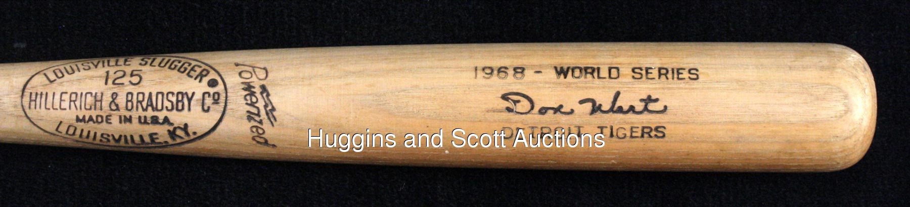 Overshadowed by popular Motown teammates, former third baseman Don Wert quietly gained recognition as a defensive wizard at the hot corner, garnering “Mr. Tiger” accolades in 1965 and making his first All-Star Game appearance in 1968. Wert’s fondest diamond recollection, however, is the 1968 World Series endeavor that saw the Tigers overcome a three games-to-one deficit to overtake the defending champion Cardinals. This Hillerich & Bradsby bat was issued to Wert for use in that fall Classic. The uncracked white ash “M110” (31.6-oz/34-1/2”) signature model weapon features “1968 – WORLD SERIES” and “DETROIT TIGERS” barrel stampings, as well as a center brand that dates to the referenced labeling period. It was Wert who propelled the Tigers into the World Series that year, as his two-out 9th-inning single on September 17 sealed a pennant-clinching triumph that eliminated the Orioles. While Wert made 23 plate appearances in six games during the ’68 World Series, this particular bat shows no use, as Wert was partial to Adirondack models. In any case, this is a coveted vintage Bengals postseason artifact. LOA from Don Wert.Note: the winning bidder has the option of having this item autographed (with choice of personalization/inscription, if wanted) by Wert at no extra cost.