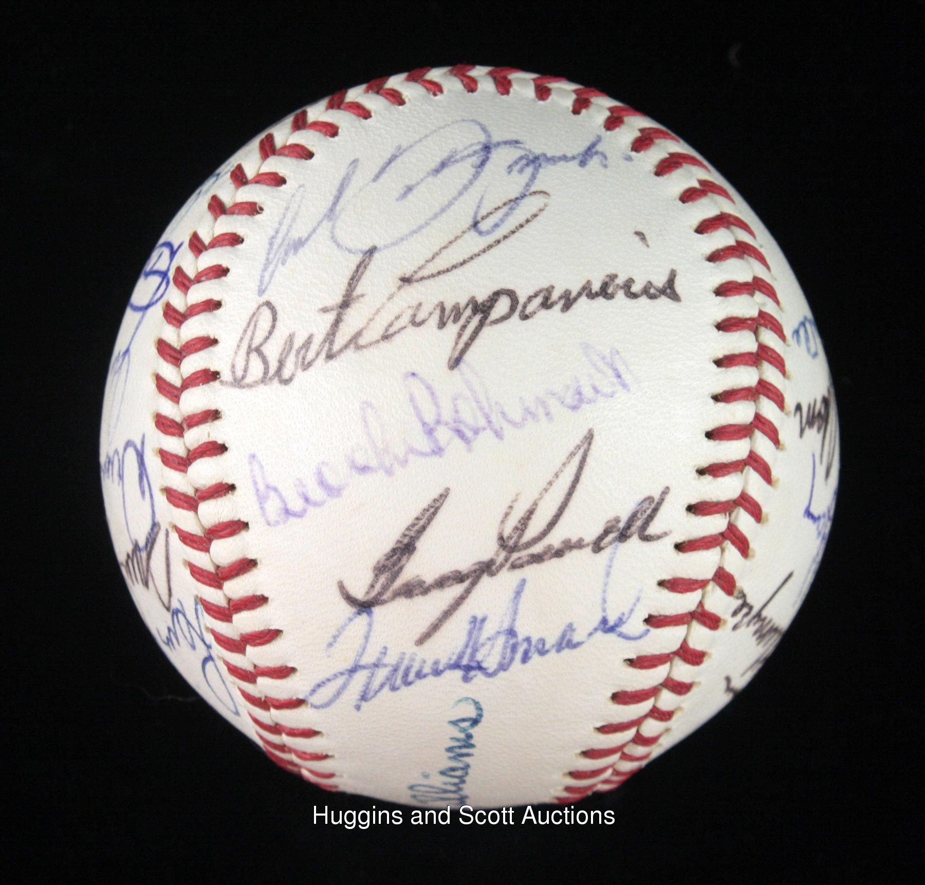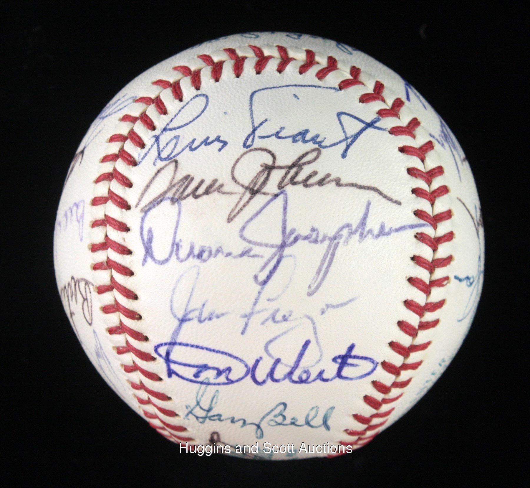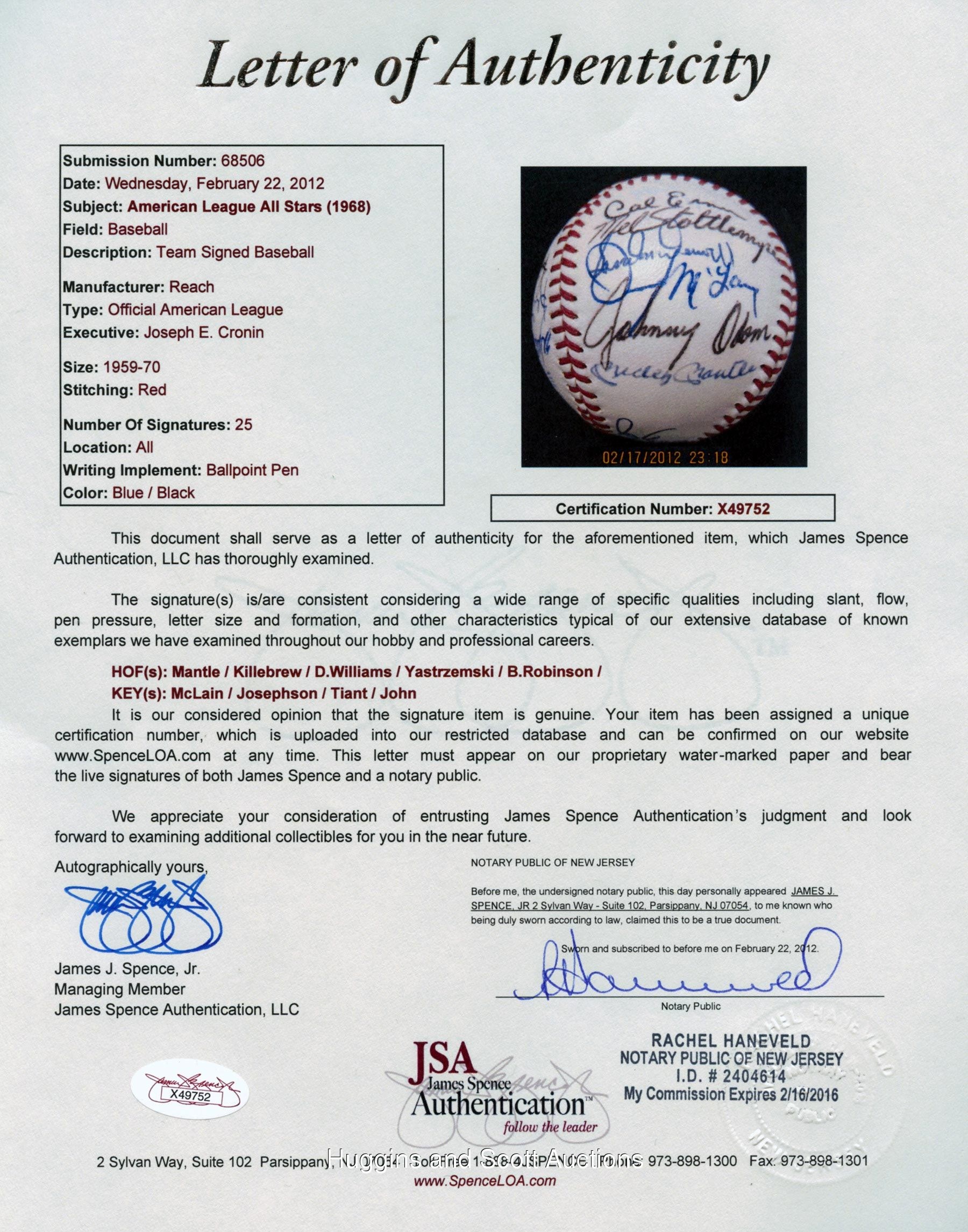 Held during the “Year of the Pitcher,” the 1968 All-Star Game appropriately featured the event’s only 1-0 final score. This gorgeous OAL Cronin sphere (grade “9-10”) has been signed in ballpoint (average “8-9” strength) by (25) members of the blanked Junior Circuit roster. Includes: Sweet Spot Williams (manager); North Panel Tiant, Johnson, Josephson, Fregosi, Wert and Bell; South Panel Ermer, Stottlemyre, McDowell, McLain, Odom, Mantle and Azcue; West Panel Horton, Harrelson, Monday, John and Freehan; East Panel Yastrzemski, Campaneris, B. Robinson, Powell and Howard; Reverse Sweet Spot Killebrew. Full photo LOA from JSA.