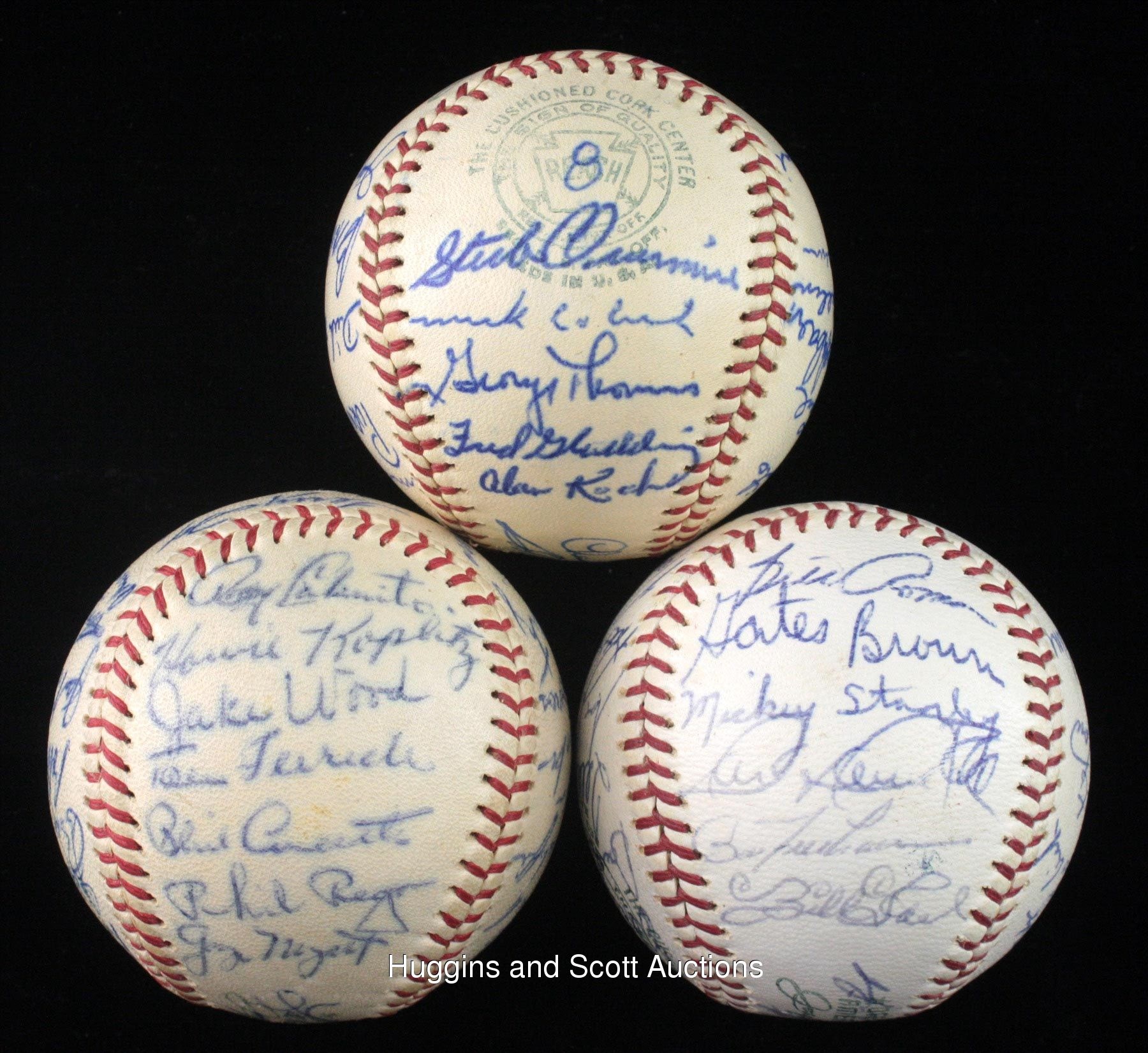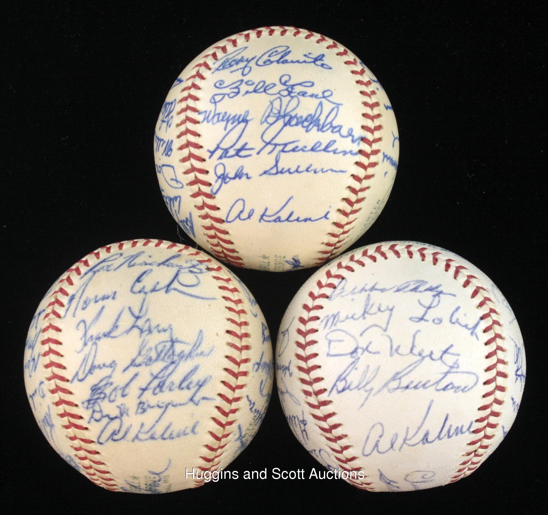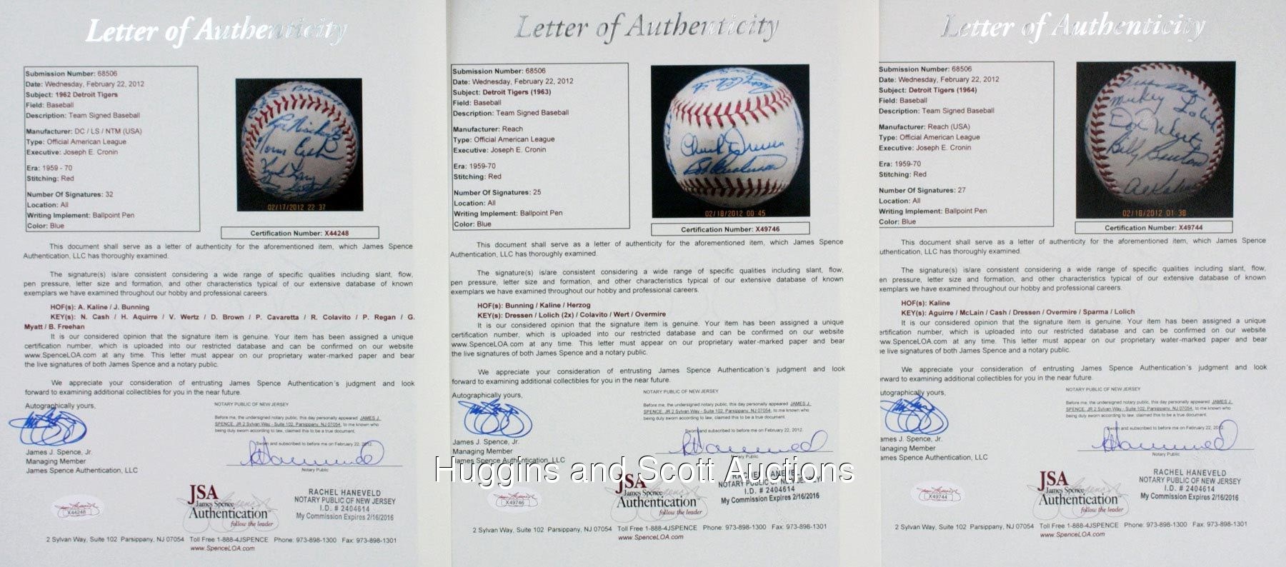 Motor city faithful will enjoy this run of (3) 1962-1964 Detroit Tigers team-signed baseballs. Highlights include 1962 Detroit Tigers: (32 signatures, autographs average “7”, OAL ball “7”) with South Panel: Cash; 1963 Detroit Tigers: (25 signatures, autographs average “8”, OAL ball “7”) with Sweet Spot: Dressen; North Panel: Kaline; 1964 Detroit Tigers: (27 signatures, autographs average “8”, OAL ball “8”) with Sweet Spot: Dressen; West Panel: Kaline and East Panel: Cash. Individual full photo LOAs from JSA. More on our website. 1962 Detroit Tigers: (32 signatures, autographs average “7”, OAL ball “7”) with Sweet Spot: T. Fox, Scheffing; West Panel: Faul, Foytack, McAuliffe, Buddin, Roarke, Boros, Wertz, Aguirre; East Panel: Sullivan, Freehan, Humphreys, Bunning, Mossi, C. Fernandez; North Panel: Colavito, Koplitz, Wood, Ferrick, Cavarretta, Regan, Myatt; South Panel: Nischwitz, Cash, Lary, Gallagher, Farley, Brown, Kaline; Reverse Sweet Spot: Osborne; 1963 Detroit Tigers: (25 signatures, autographs average “8”, OAL ball “7”) with Sweet Spot: Dressen, Anderson; West Panel: Overmire, Lolich, Thomas, Gladding, Koch; East Panel: Bruton, Herzog, Wert, W. Smith, G. Brown, Mossi; North Panel: Colavito, Faul, Blackburn, Mullin, Sullivan, Kaline; South Panel: Lolich, Goldy, McAuliffe, Phillips, Bunning; Reverse Sweet Spot: unidentified; 1964 Detroit Tigers: (27 signatures, autographs average “8”, OAL ball “8”) with Sweet Spot: Dressen, Overmire; West Panel: Phillips, Lolich, Wert, Bruton, Kaline; East Panel: Rakow, Wickersham, Fox, Sparma, Mullin, Cash; North Panel: Roman, G. Brown, Stanley, Demeter, Freehan, Faul; South Panel: Gladding, McLain, G. Smith, Seale, Aguirre, Northrup; Reverse Sweet Spot: McAuliffe, Swift