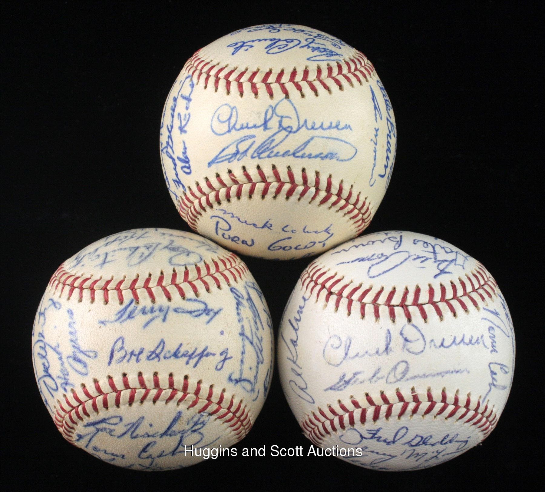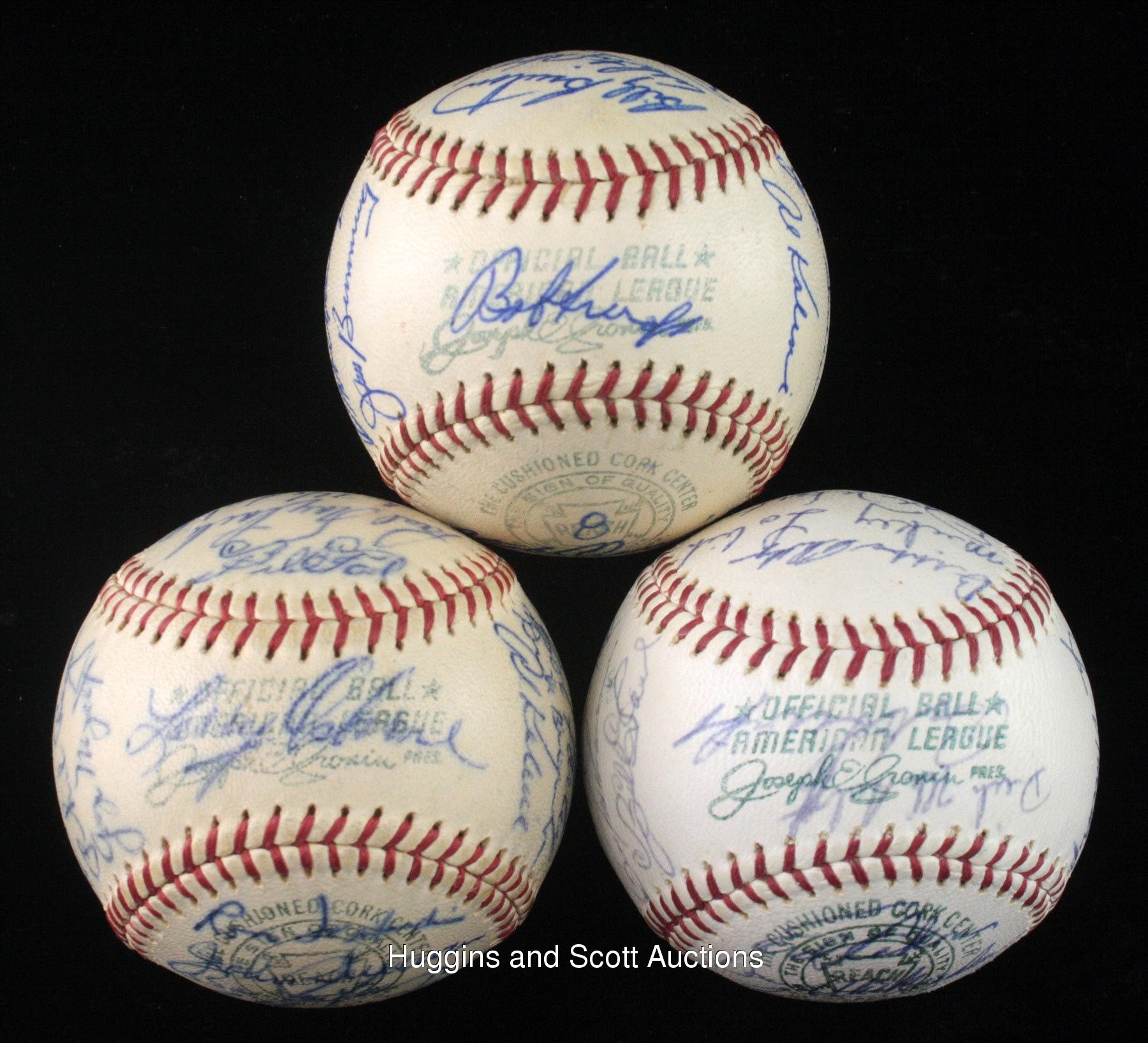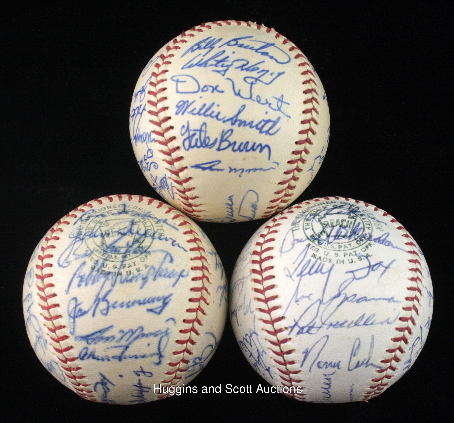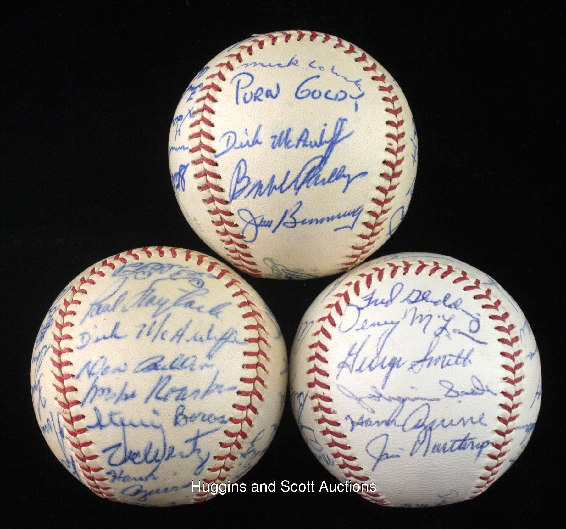 Motor city faithful will enjoy this run of (3) 1962-1964 Detroit Tigers team-signed baseballs. Highlights include 1962 Detroit Tigers: (32 signatures, autographs average “7”, OAL ball “7”) with South Panel: Cash; 1963 Detroit Tigers: (25 signatures, autographs average “8”, OAL ball “7”) with Sweet Spot: Dressen; North Panel: Kaline; 1964 Detroit Tigers: (27 signatures, autographs average “8”, OAL ball “8”) with Sweet Spot: Dressen; West Panel: Kaline and East Panel: Cash. Individual full photo LOAs from JSA. More on our website. 1962 Detroit Tigers: (32 signatures, autographs average “7”, OAL ball “7”) with Sweet Spot: T. Fox, Scheffing; West Panel: Faul, Foytack, McAuliffe, Buddin, Roarke, Boros, Wertz, Aguirre; East Panel: Sullivan, Freehan, Humphreys, Bunning, Mossi, C. Fernandez; North Panel: Colavito, Koplitz, Wood, Ferrick, Cavarretta, Regan, Myatt; South Panel: Nischwitz, Cash, Lary, Gallagher, Farley, Brown, Kaline; Reverse Sweet Spot: Osborne; 1963 Detroit Tigers: (25 signatures, autographs average “8”, OAL ball “7”) with Sweet Spot: Dressen, Anderson; West Panel: Overmire, Lolich, Thomas, Gladding, Koch; East Panel: Bruton, Herzog, Wert, W. Smith, G. Brown, Mossi; North Panel: Colavito, Faul, Blackburn, Mullin, Sullivan, Kaline; South Panel: Lolich, Goldy, McAuliffe, Phillips, Bunning; Reverse Sweet Spot: unidentified; 1964 Detroit Tigers: (27 signatures, autographs average “8”, OAL ball “8”) with Sweet Spot: Dressen, Overmire; West Panel: Phillips, Lolich, Wert, Bruton, Kaline; East Panel: Rakow, Wickersham, Fox, Sparma, Mullin, Cash; North Panel: Roman, G. Brown, Stanley, Demeter, Freehan, Faul; South Panel: Gladding, McLain, G. Smith, Seale, Aguirre, Northrup; Reverse Sweet Spot: McAuliffe, Swift