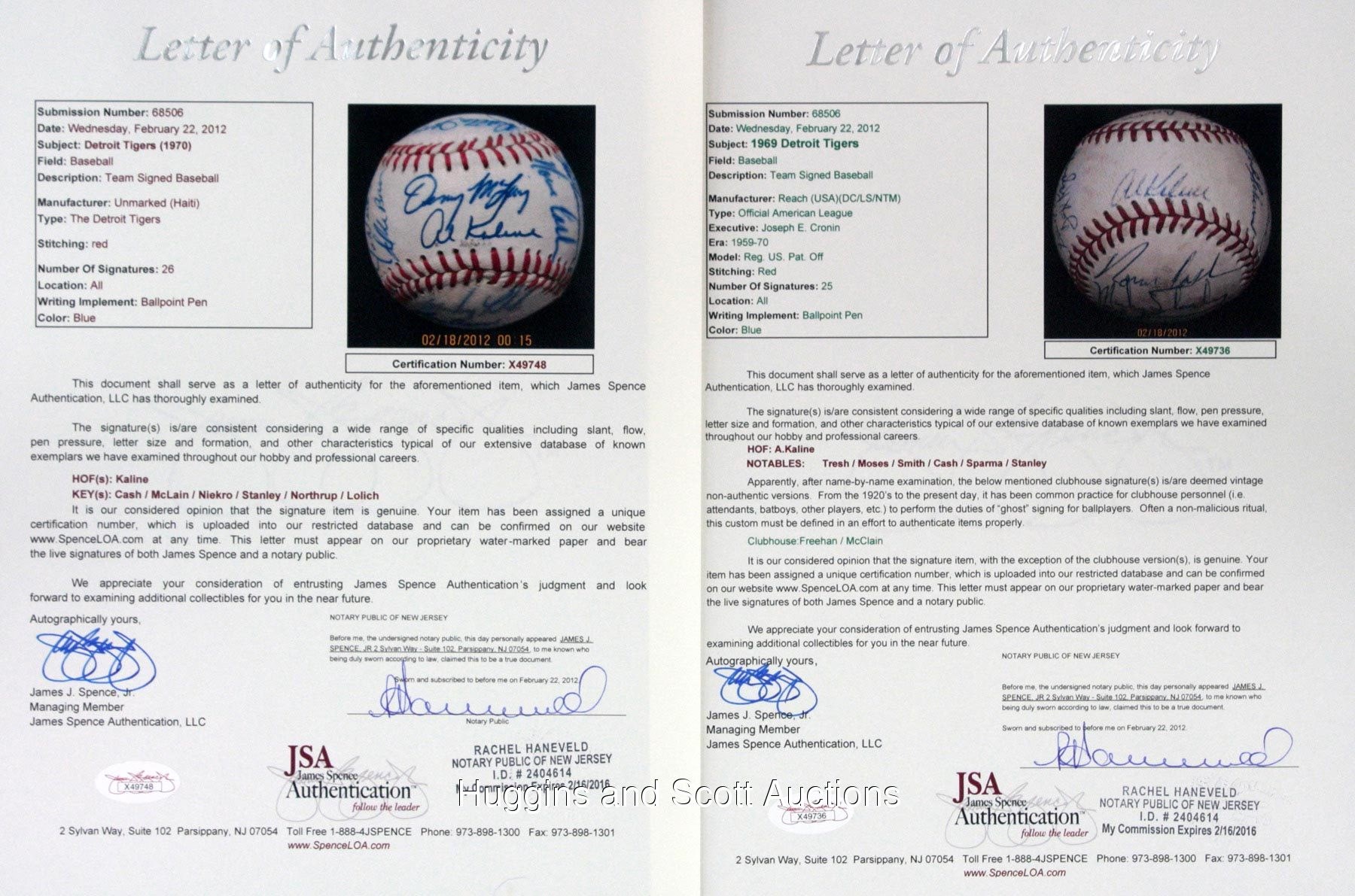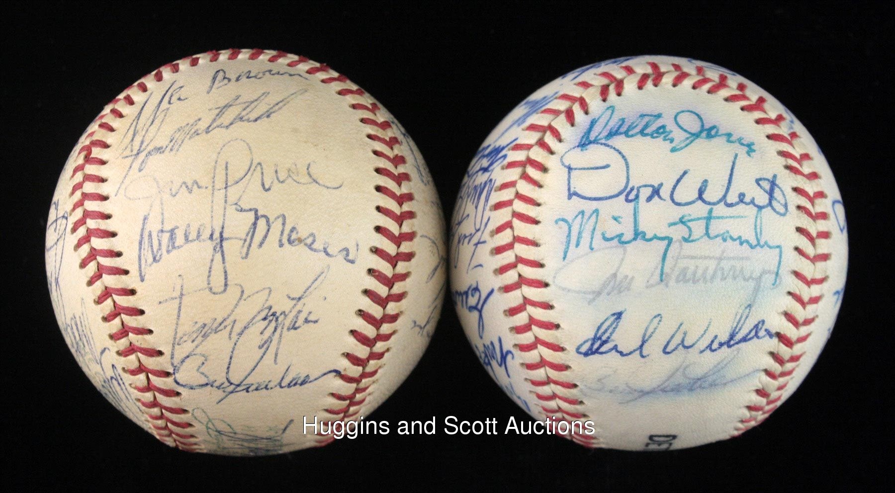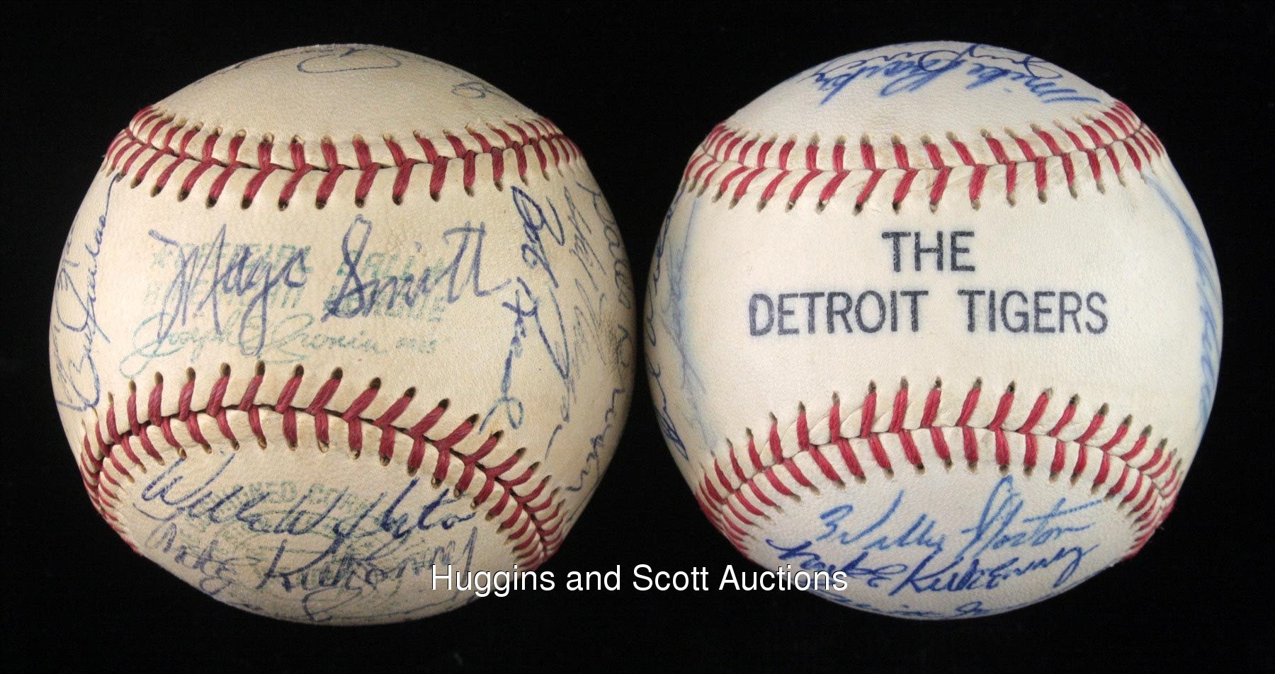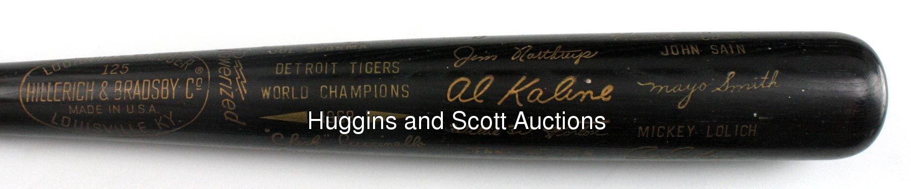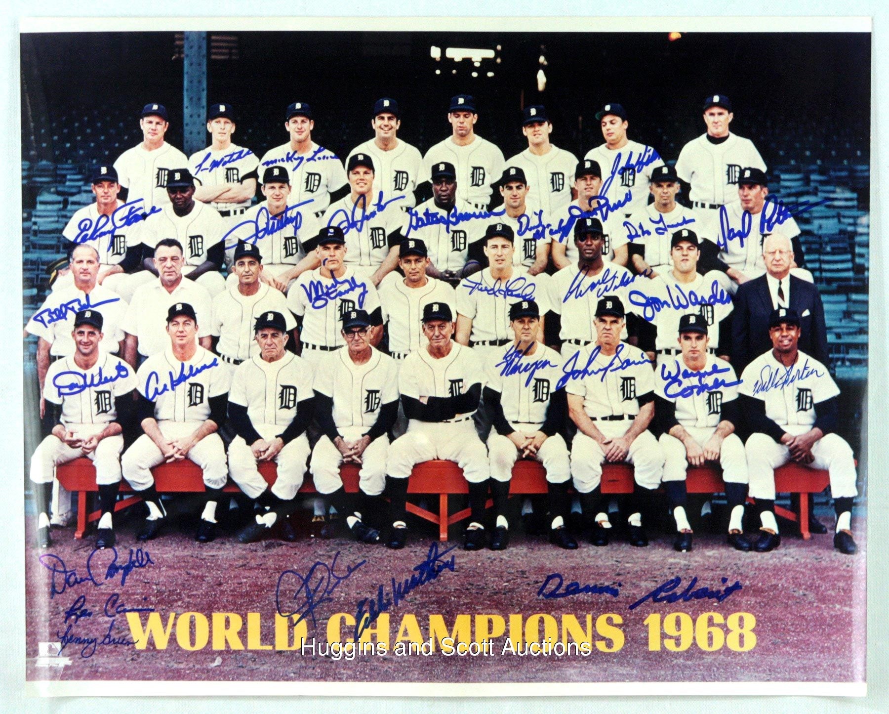 This lot of souvenirs hails from the 1968-1970 Detroit Tigers. Highlights include: 1968 Team-Signed Photo a 20x16 color print signed in blue marker (all “10” strength) by (28) with Kaline, Lolich and Mathews; (2) Team-signed Baseballs (1969 & 1970) and a 1968 World Series Black Bat. More on our website.1968 Team-Signed Photograph: signed by (28) including Behm (trainer), G. Brown, Cain, Campbell, Comer, Face, Freehan, Green, Hiller, Horton, Kaline, Lasher, Lolich, Matchick, Mathews, McAuliffe, Naragon (coach), Northrup, Patterson, Price, Ribant, Rooker, Sain (coach), Stanley, Tracewski, Warden, Wert and Wilson.Additional highlights include:1969 Detroit Tigers Team-Signed Ball: (24 signatures, average "7-8", mildly toned OAL Cronin ball grades “6”, full phoot LOA from JSA) with Sweet Spot: Kaline; West Panel: Resinger, Tresh, Tracewski, Kazanski; East Panel: Horton, Kilhenny, Sparma, Wert, unidentified, Scherman; North Panel: I. Brown, Matchick, Price, Moses, McLain (clubhouse), Freehan (clubhouse); South Panel: Cash, Stanley, Timmerman, G. Brown, Naragon, Reed; Reverse Sweet Spot: M. Smith; Full photo LOA from JSA 1970 Detroit Tigers Team-Signed Ball: (26 signatures, average "8" with south panel lesser, souvenir ball grades "6-7", full photo LOA from JSA) with Sweet Spot: McLain, Kaline; West Panel: Roarke, Price, Okrie, Szotkiewicz, J. Niekro, I. Brown; East Panel: Horton, Kilhenny, Maddox, Scherman, Patterson, Timmerman, Cash; North Panel: D. Jones, Wert, Stanley, Northrup, Wilson, Freehan; South Panel: Lolich, Cain, G. Brown, McAuliffe, Hiller; Full photo LOA from JSA1968 World Series Black Bat: distributed in limited quantity by Hillerich & Bradsby, this 35” example features a black finish decorated by gold-colored stampings and facsimile signatures of those who wielded H&B weapons (and block-letter stampings of those who did not). In all, there are (33) names, including Kaline, Mathews, McLain and Oyler. The item presents nicely with minimal fading.