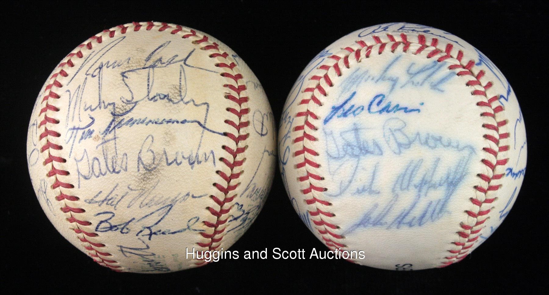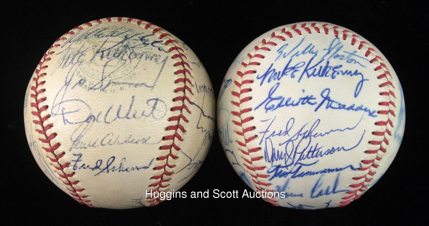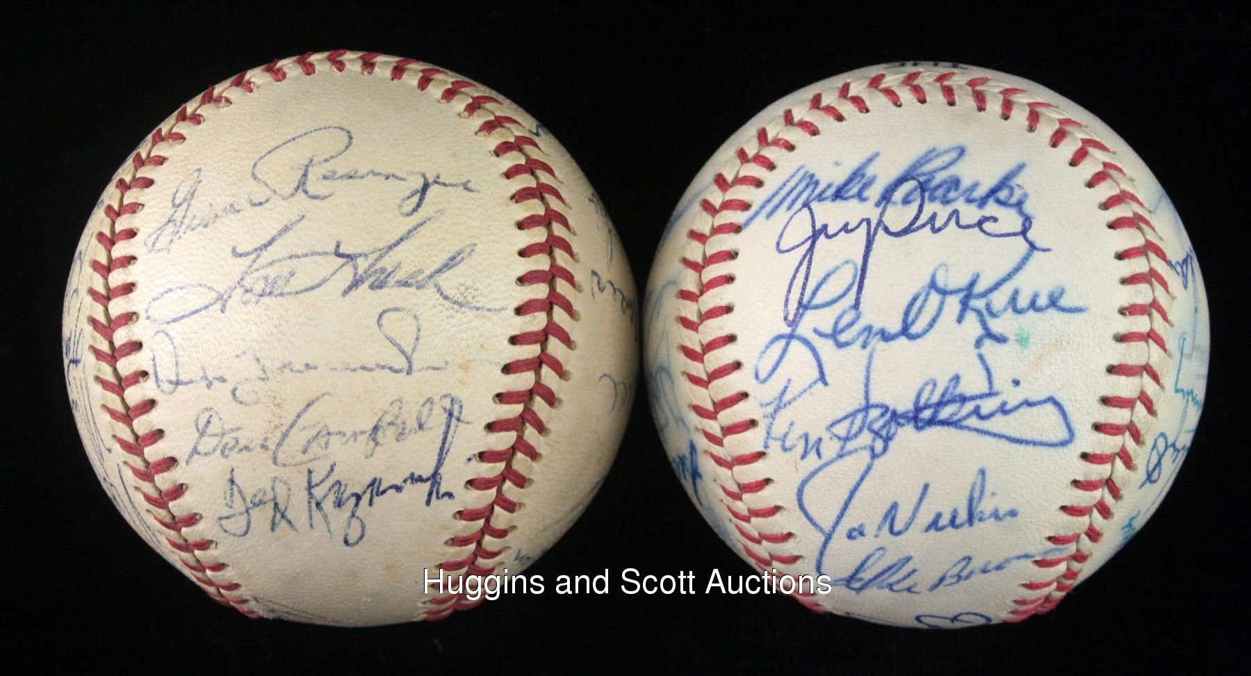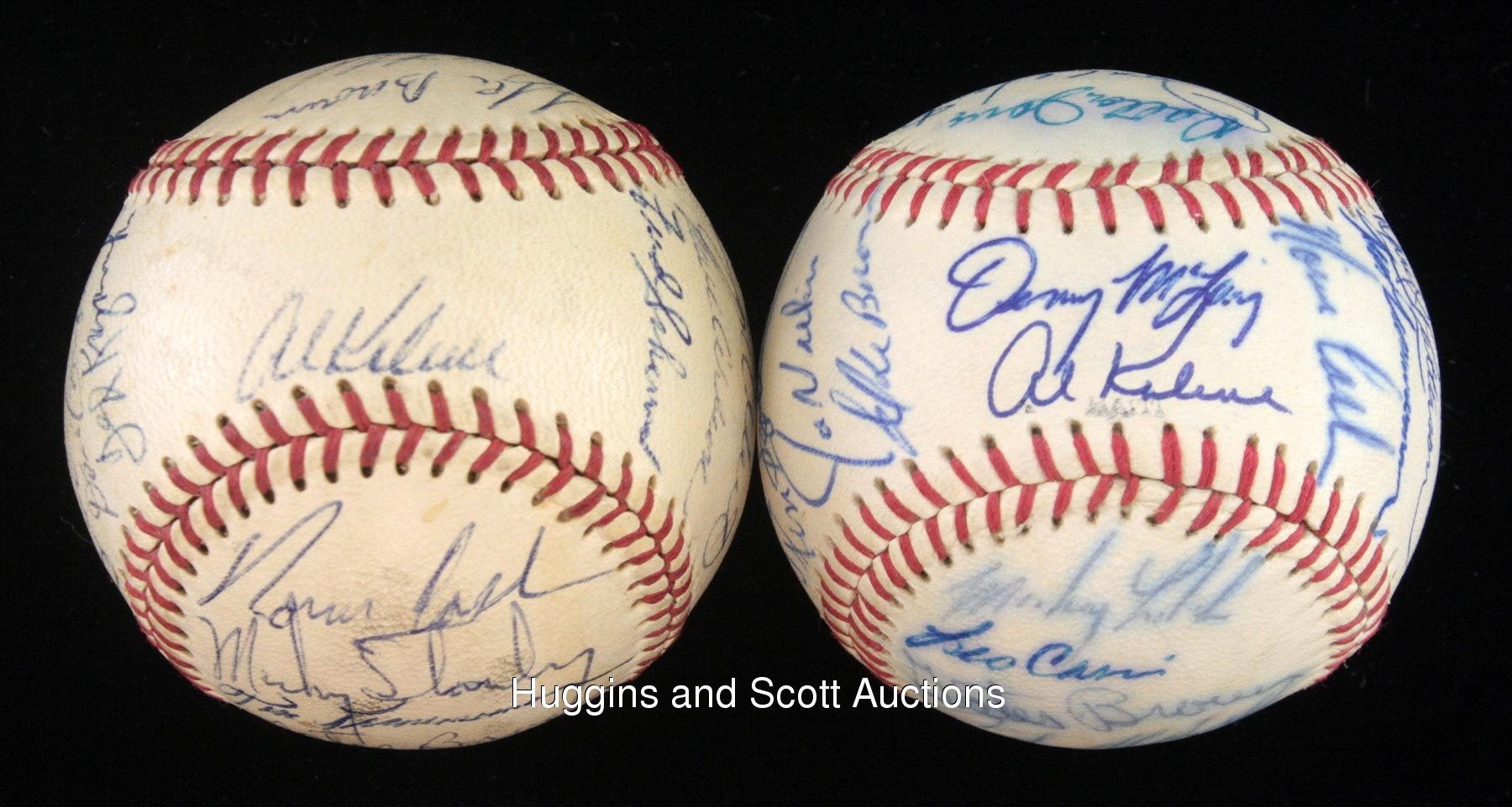 This lot of souvenirs hails from the 1968-1970 Detroit Tigers. Highlights include: 1968 Team-Signed Photo a 20x16 color print signed in blue marker (all “10” strength) by (28) with Kaline, Lolich and Mathews; (2) Team-signed Baseballs (1969 & 1970) and a 1968 World Series Black Bat. More on our website.1968 Team-Signed Photograph: signed by (28) including Behm (trainer), G. Brown, Cain, Campbell, Comer, Face, Freehan, Green, Hiller, Horton, Kaline, Lasher, Lolich, Matchick, Mathews, McAuliffe, Naragon (coach), Northrup, Patterson, Price, Ribant, Rooker, Sain (coach), Stanley, Tracewski, Warden, Wert and Wilson.Additional highlights include:1969 Detroit Tigers Team-Signed Ball: (24 signatures, average "7-8", mildly toned OAL Cronin ball grades “6”, full phoot LOA from JSA) with Sweet Spot: Kaline; West Panel: Resinger, Tresh, Tracewski, Kazanski; East Panel: Horton, Kilhenny, Sparma, Wert, unidentified, Scherman; North Panel: I. Brown, Matchick, Price, Moses, McLain (clubhouse), Freehan (clubhouse); South Panel: Cash, Stanley, Timmerman, G. Brown, Naragon, Reed; Reverse Sweet Spot: M. Smith; Full photo LOA from JSA 1970 Detroit Tigers Team-Signed Ball: (26 signatures, average "8" with south panel lesser, souvenir ball grades "6-7", full photo LOA from JSA) with Sweet Spot: McLain, Kaline; West Panel: Roarke, Price, Okrie, Szotkiewicz, J. Niekro, I. Brown; East Panel: Horton, Kilhenny, Maddox, Scherman, Patterson, Timmerman, Cash; North Panel: D. Jones, Wert, Stanley, Northrup, Wilson, Freehan; South Panel: Lolich, Cain, G. Brown, McAuliffe, Hiller; Full photo LOA from JSA1968 World Series Black Bat: distributed in limited quantity by Hillerich & Bradsby, this 35” example features a black finish decorated by gold-colored stampings and facsimile signatures of those who wielded H&B weapons (and block-letter stampings of those who did not). In all, there are (33) names, including Kaline, Mathews, McLain and Oyler. The item presents nicely with minimal fading.