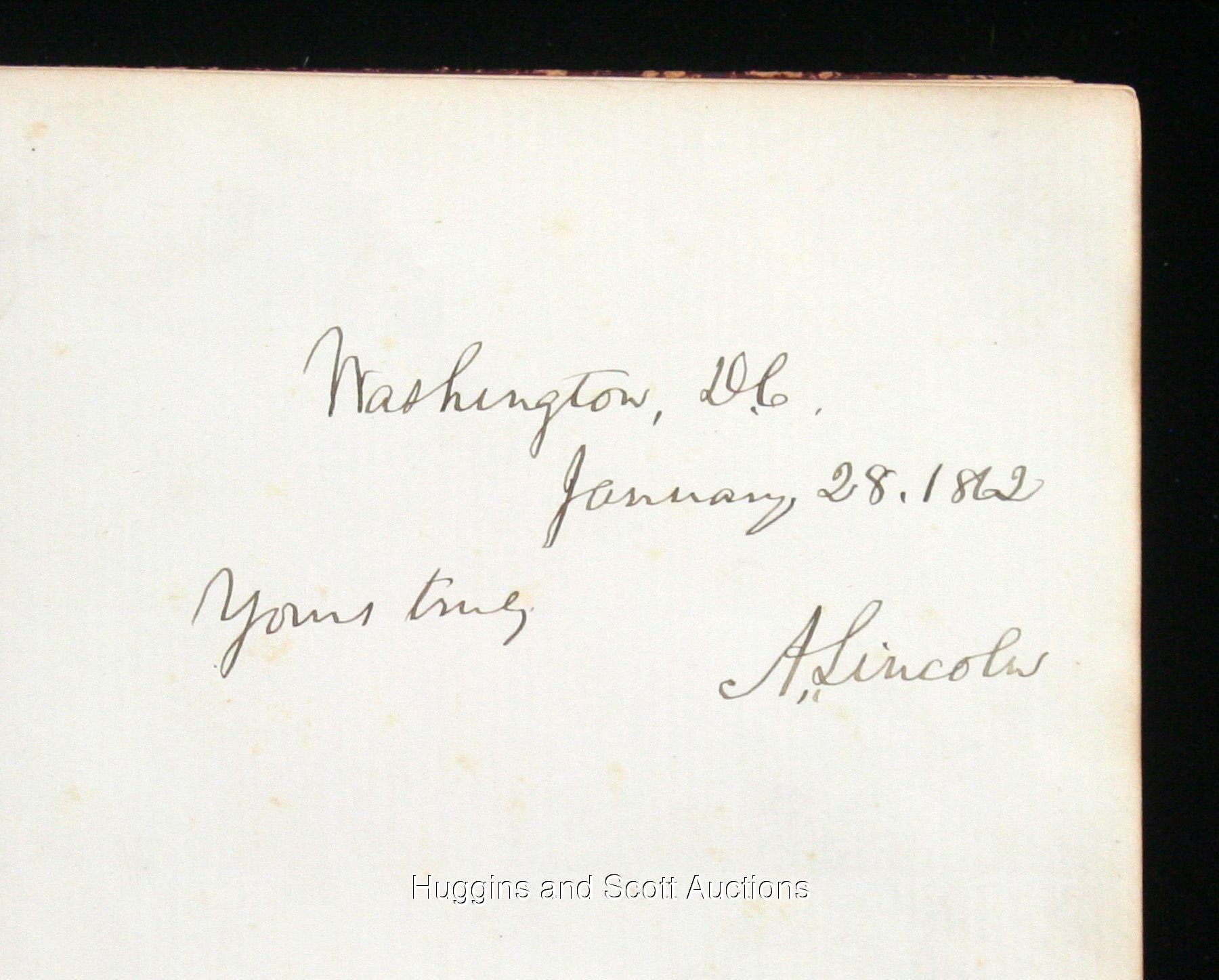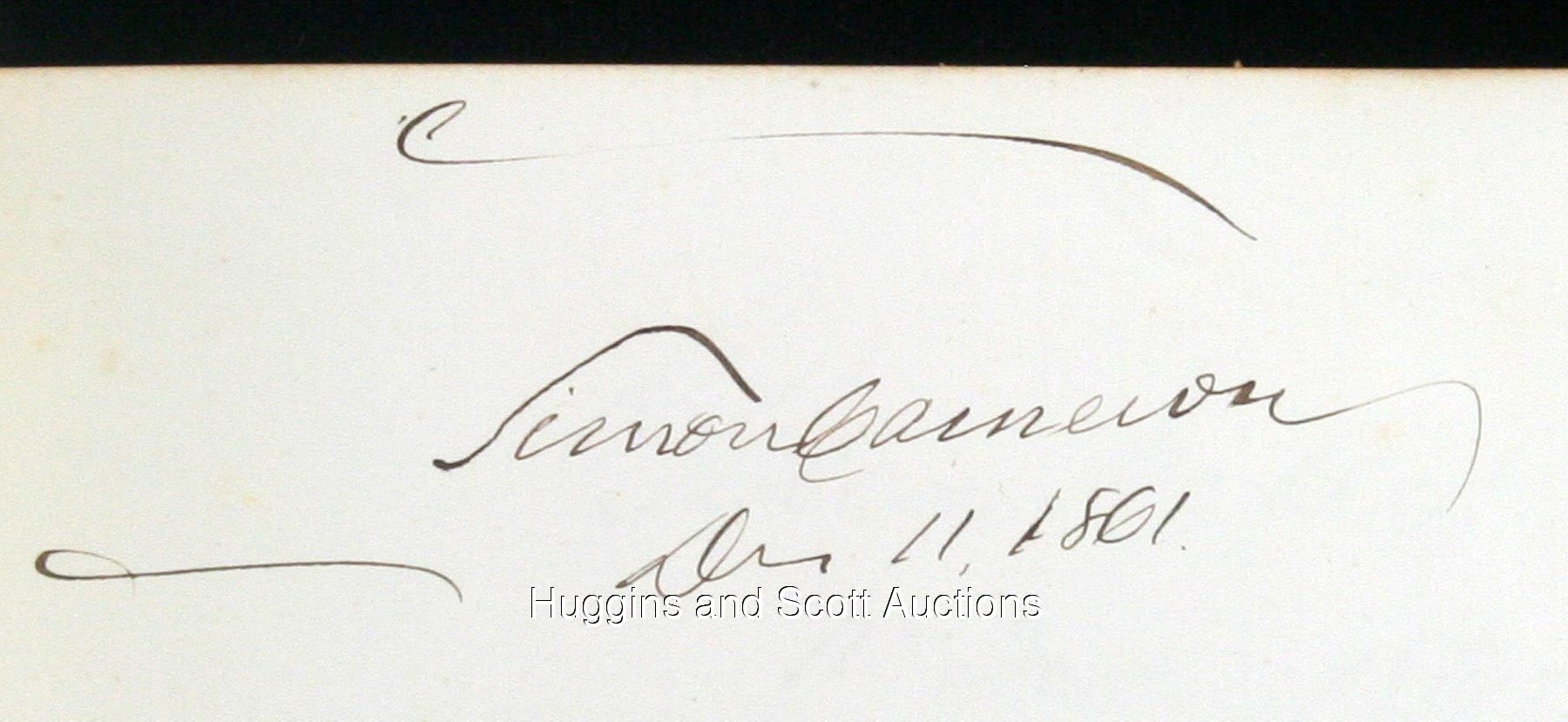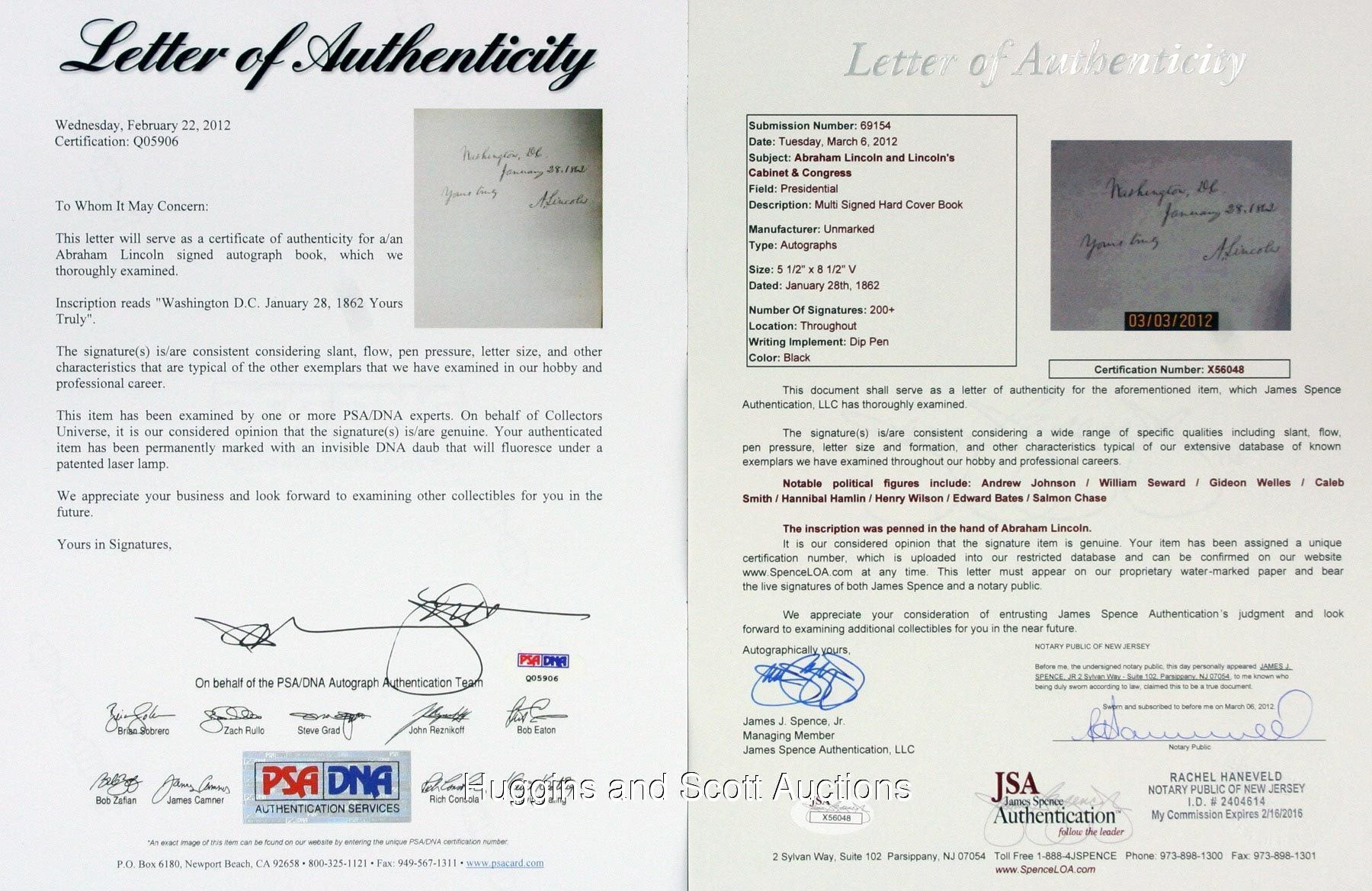 A house divided against itself cannot stand. I believe this government cannot endure, permanently, half slave and half free. I do not expect the Union to be dissolved — I do not expect the house to fall — but I do expect it will cease to be divided. It will become all one thing or all the other. Either the opponents of slavery will arrest the further spread of it, and place it where the public mind shall rest in the belief that it is in the course of ultimate extinction; or its advocates will push it forward, till it shall become alike lawful in all the States, old as well as new — North as well as South. - Abraham Lincoln, June 16, 1858Arguably the most influential President in American history, Abraham Lincoln was a polarizing figure from the moment he made his House Divided speech in June of 1858. For the abolitionists and anti-slavery citizens, Lincoln was a hero. Southerners and pro-slavery men seemed to have a much different opinion about him. Lincoln’s election two years later forced the hand of Southern states toward secession. If Lincoln is the most influential President, the 37th Congress has to be considered one of the most influential assemblies in American history. The debate over slavery, states’ rights and the perseveration of the Union were common occurrences in the unfinished Capitol chamber. These men, alongside Lincoln, held together our Nation during the Civil War. The presented 5-3/4 x 9" autograph album is the most complete accumulation of signatures from these men ever offered. Contained with the pages of the hard-covered album are (224) autographs that include – in order – President Abraham Lincoln (“8”), VP Hannibal Hamlin (“7”), William Seward, Salmon Chase, Edward Bates, Simon Cameron, Gideon Welles and Caleb Smith. Each of these signatures and on a page by itself and constitute the key members of the Cabinet. The person that obtained these autographs should be considered a pioneer in autograph collecting as the original owner meticulously gathered the autographs in order of importance with Lincoln first, followed by Hamlin, the Cabinets members, then the Senators and lastly the members of the House of Representatives. The autograph album can be dated between December, 1861 and February of 1862 by following the members of Congress and when they took office. There are a total of (224) signatures, eight are Lincoln and his Cabinet, (42) are senators (out of 50 possible at the time) including Henry Wilson (VP under US Grant) and Andrew Johnson (17th President of US); (170) of the (180) Representatives (there are 2 duplicate signatures) including William Wheeler (VP under R. Hayes) and Schuyler Colfax (VP under A. Johnson). All signatures were penned in black ink and are in incredible condition (ranging from “7-9”). Full photo LOA's from JSA and PSA/DNA. For a complete list of all (224) signatures and more information on each, please visit our website.Note: The Abe Lincoln autograph has January 28, 1862 added was the same day that he issued General Order #1 to advance all land and sea forces to his Generals. Grant obliged in the West, while McClellan did nothing. List, in order, of signatures (inscriptions in parenthesis): Abraham Lincoln signed as President (Washington, DC January 28, 1862, Yours Truly, grade “8”) Hannibal Hamlin signed as Vice President (June 10, 1862, grade (“7”)William H. Seward signed as Secretary of State (Auburn, grade “8”)Salmon P. Chase signed “S P Chase” as Secretary of the Treasury (Dec. 4, 1861, grade “7”) Edward Bates signed as Attorney General (of St Louis, MO) signed on the reverse of the S P Chase page, grade (“8”) Simon Cameron signed as Secretary of War (Dec 11, 1861, grade “7”)Gideon Wells signed as Secretary of the Navy (Dec 11, 1861, grade “7-8”)Caleb Smith signed as Secretary of the Interior (Dec 12, 1861, grade “7”)The remaining signatures were penned 3-5 on a page (unless otherwise noted):Senators: Henry S. Lane (Senator from Indiana, d.1881), James Grimes (Senator from Iowa, d.1872), Timothy O. Howe (Senator from Wisconsin, d.1883) John C Ten Eyck (Senator from New Jersey, d.1879), Lazarus W. Powell (Senator from Kentucky, d.1867), Charles Sumner (Senator from Massachusetts, d.1874), Lot M. Morrill (Senator from Maine, d.1883) Anthony Kennedy (Senator from Maryland, d.1892), John Sherman (Senator from Ohio - who took SP Chase’s seat – d.1900), Garrett Davis (Senator from Kentucky, d.1872), Benjamin Wade (Senator from Ohio, d.1878) Lafayette S. Foster (Senator from Connecticut, d.1880), James Harlan (Senator from Iowa, d.1899), Preston King (Senator from New York, d.1865), Willard Saulsbury, Sr. (Senator from Delaware, d.1892) Henry M. Rice (Senator from Minnesota, d.1894), Jesse D. Bright (Senator from Indiana, d.1875), Samuel C. Pomeroy (Senator from Kansas, d.1891), Orville H. Browning (Senator from Illinois – who took Stephen Douglas’ seat – d.1881) Lyman Trumbull (Senator from Illinois, d.1896), Zachariah Chandler (Senator from Michigan, d.1879), Morton S. Wilkerson (Senator from Minnesota, d.1894) James R. Doolittle (Senator from Wisconsin, d.1897), James W. Nesmith (Senator from Oregon, d.1885), James Dixon (Senator from Connecticut, d.1873), Ira Harris, Senator from New York, d.1875) Henry Wilson (Senator from Massachusetts and future Vice President under US Grant, d.1875), Milton Latham (Senator from California, d.1882), James H. Lane (Senator from Kansas, d.1866) John R. Thomson (Senator from New Jersey, d.1862), Jacob Collamer (Senator from Vermont, d.1865), James Alfred Pearce (Senator from Maryland, d.1862), Edgar Cowan (Senator from Pennsylvania, d.1885) James A. Bayard, Jr (Senator from Delaware, d.1880), James A. McDougall (Senator from California, d.1867), Anthony Kennedy (a second signature by the Senator from Maryland, d.1892), Solomon Foot (Senator from Vermont, d.1866), David Wilmot (Senator from Pennsylvania who took Simon Cameron