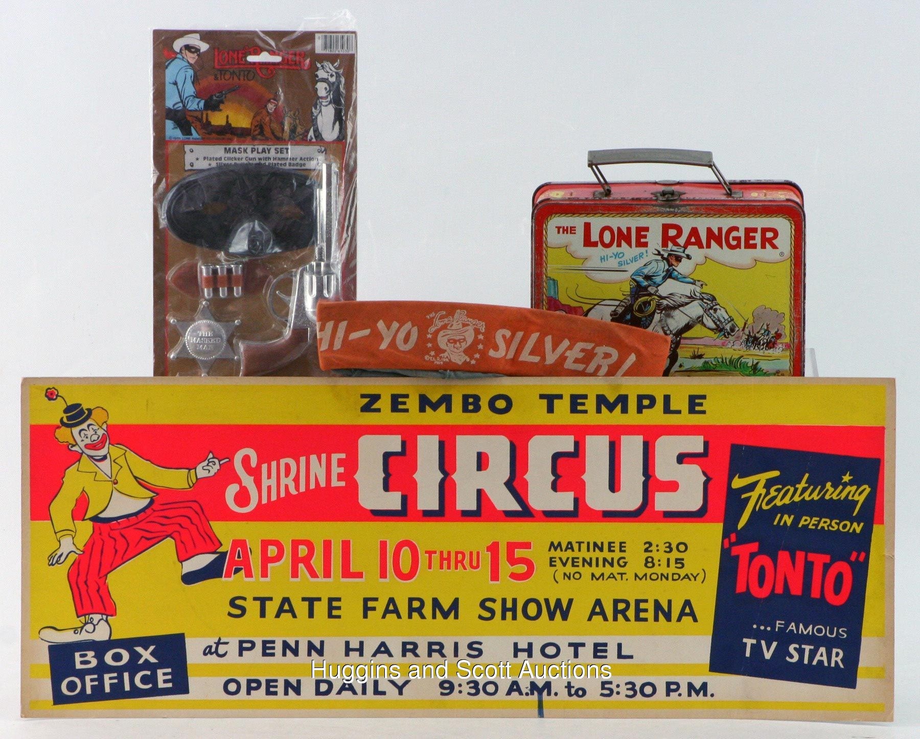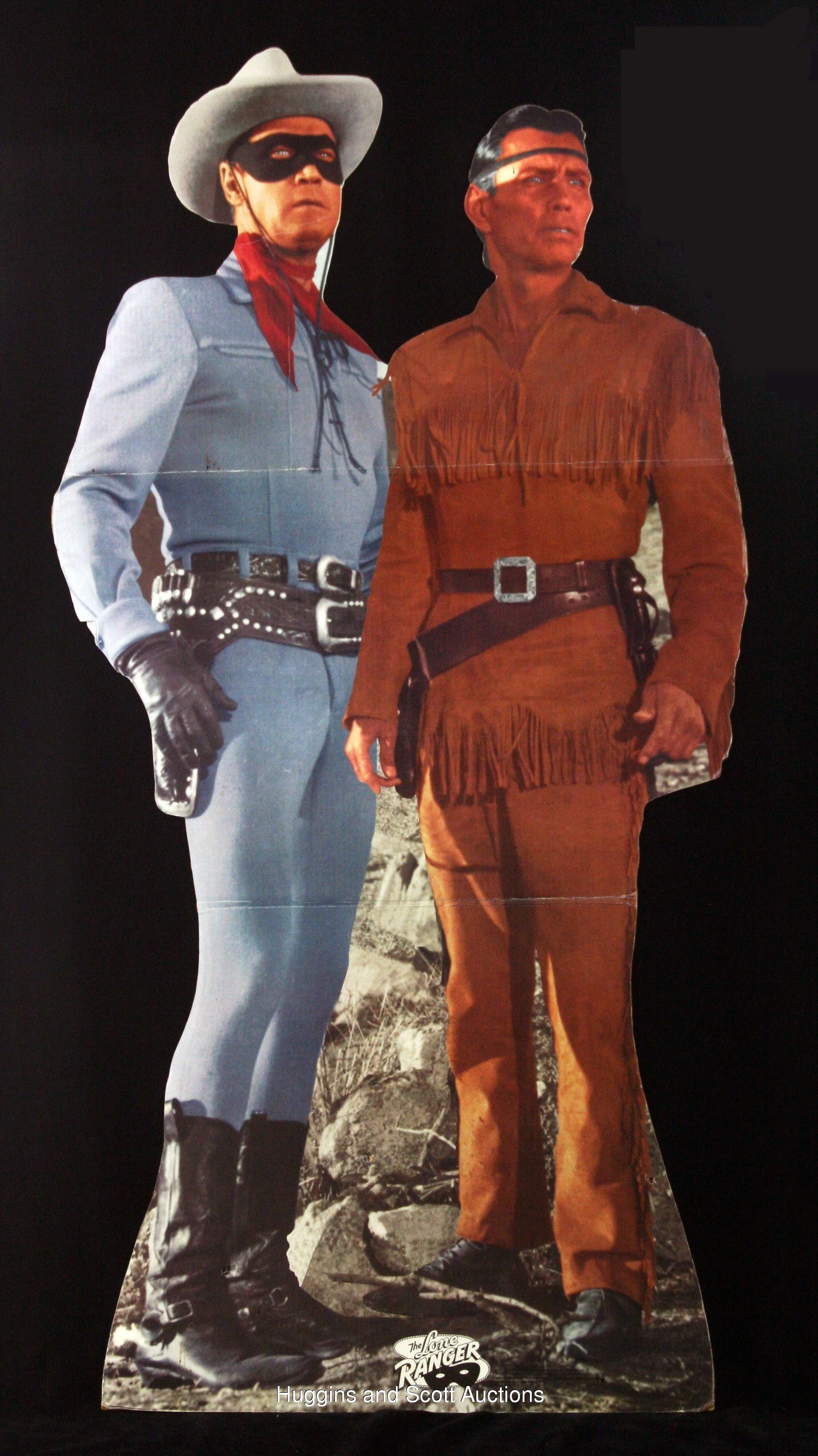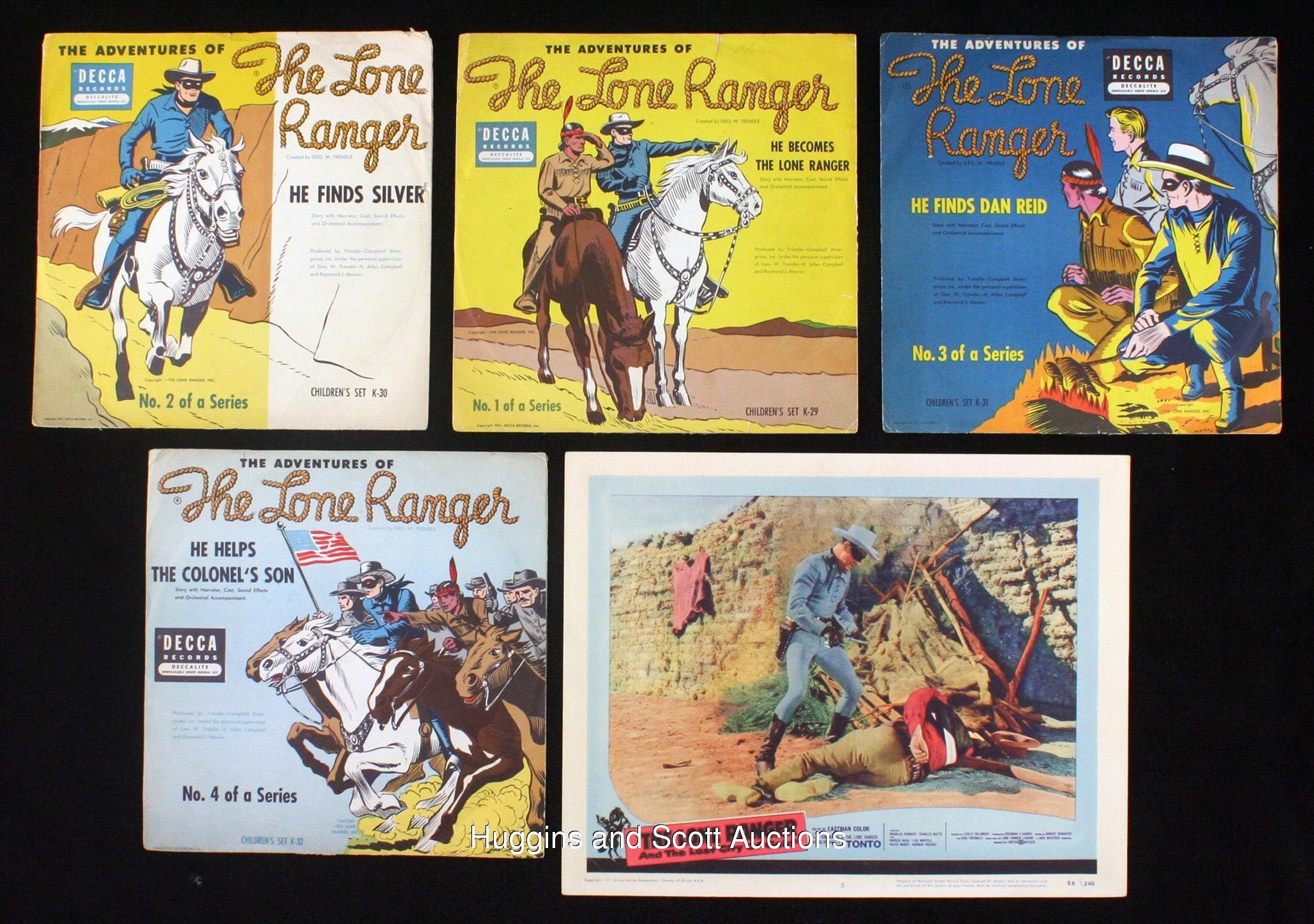 Riding the plains and ensuring law and order in the Old West, “The Lone Ranger” and his Native American companion, “Tonto” are back in the saddle with these well-kept vintage collectibles. Appealing as scarce survivors, these relics are also incredibly well preserved. Includes:1951 LP Record Set complete set of (4) 78 RPM records with titles including “He Becomes The Lone Ranger,” “He Finds Silver,” “He Finds Dan Reid” and “He Helps The Colonel’s Som.” Each comes with its original paper sleeve1957 Lobby Card a 14x11 theatre lobby display card for “The Lone Ranger And The Lost City of Gold”LP Records includes (2) 1970s 33 RPM records (with covers)The Lone Ranger Cardboard Cutout a 6-foot-tall thick cardboard cutout display with colorful depictions of The Lone Ranger and Tonto. Complete with easels on back to facilitate display.Miscellaneous includes a 1954 tin lunchbox; a 1959 cap; and a 1985 play set with mask, gun, bullets and badge (in original retail packaging)