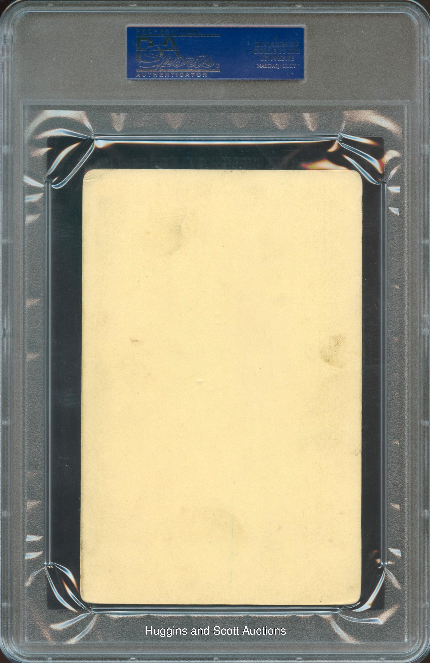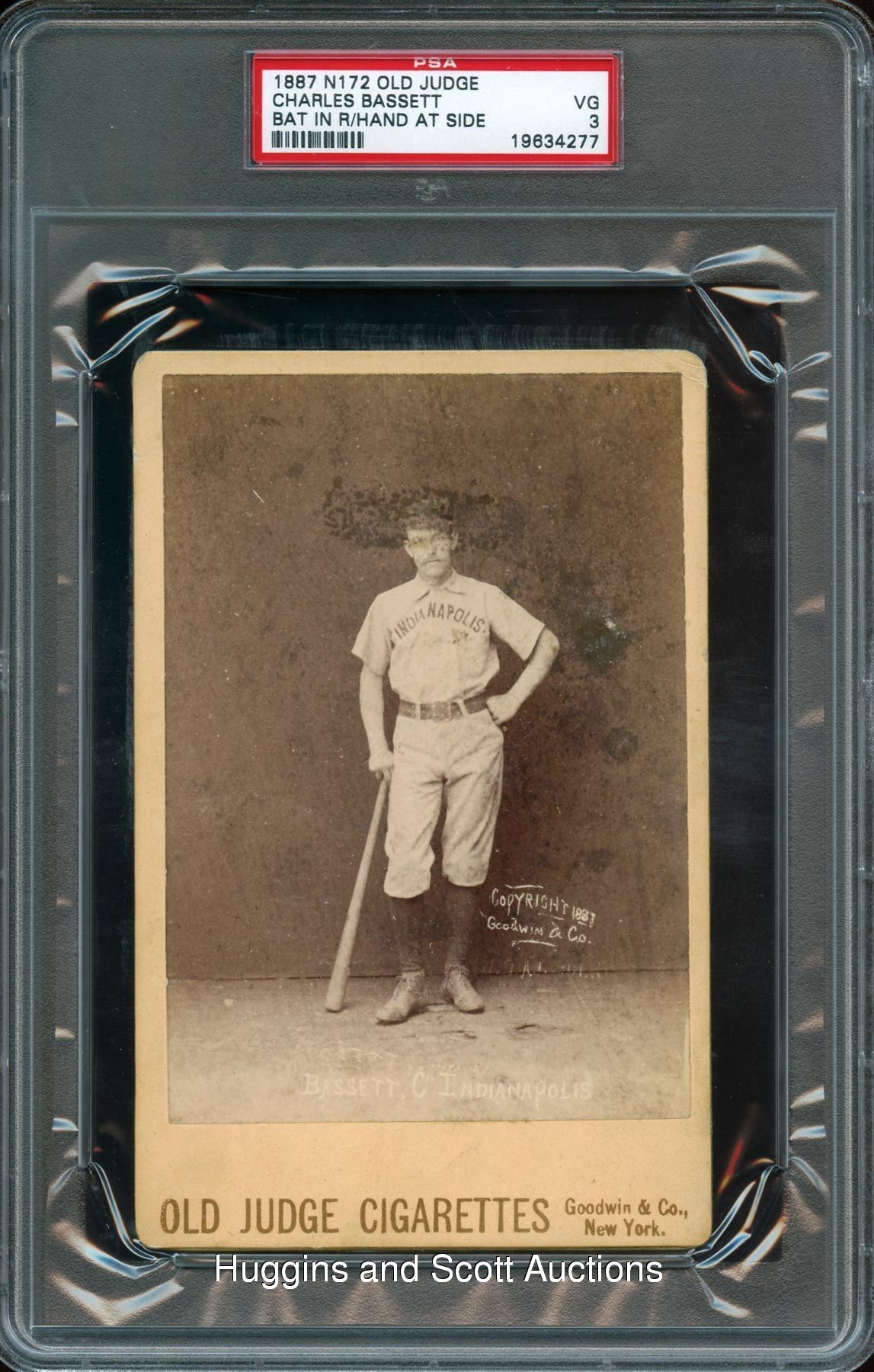 Over a nine-year career, Charles Bassett played for the Kansas City Cowboys, Louisville Colonels, New York Giants, Providence Grays and the Indianapolis Hoosiers; the team in which he is depicted on this 1888 N173 Old Judge Cabinet. Graded VG 3 by PSA, the (Bat in Right Hand, Hand at Side) pose is the only such evaluated by the third-party grading service. The sepia image is relatively clear while two of the four corners are problem-free. With exception to reverse fingerprints, the blank reverse is clean. Lovely example of this early National League participant in a pleasing state of preservation. More on our website. The flip on the PSA holder incorrectly identifies this card as coming from the 1887 N172 Old Judge series.