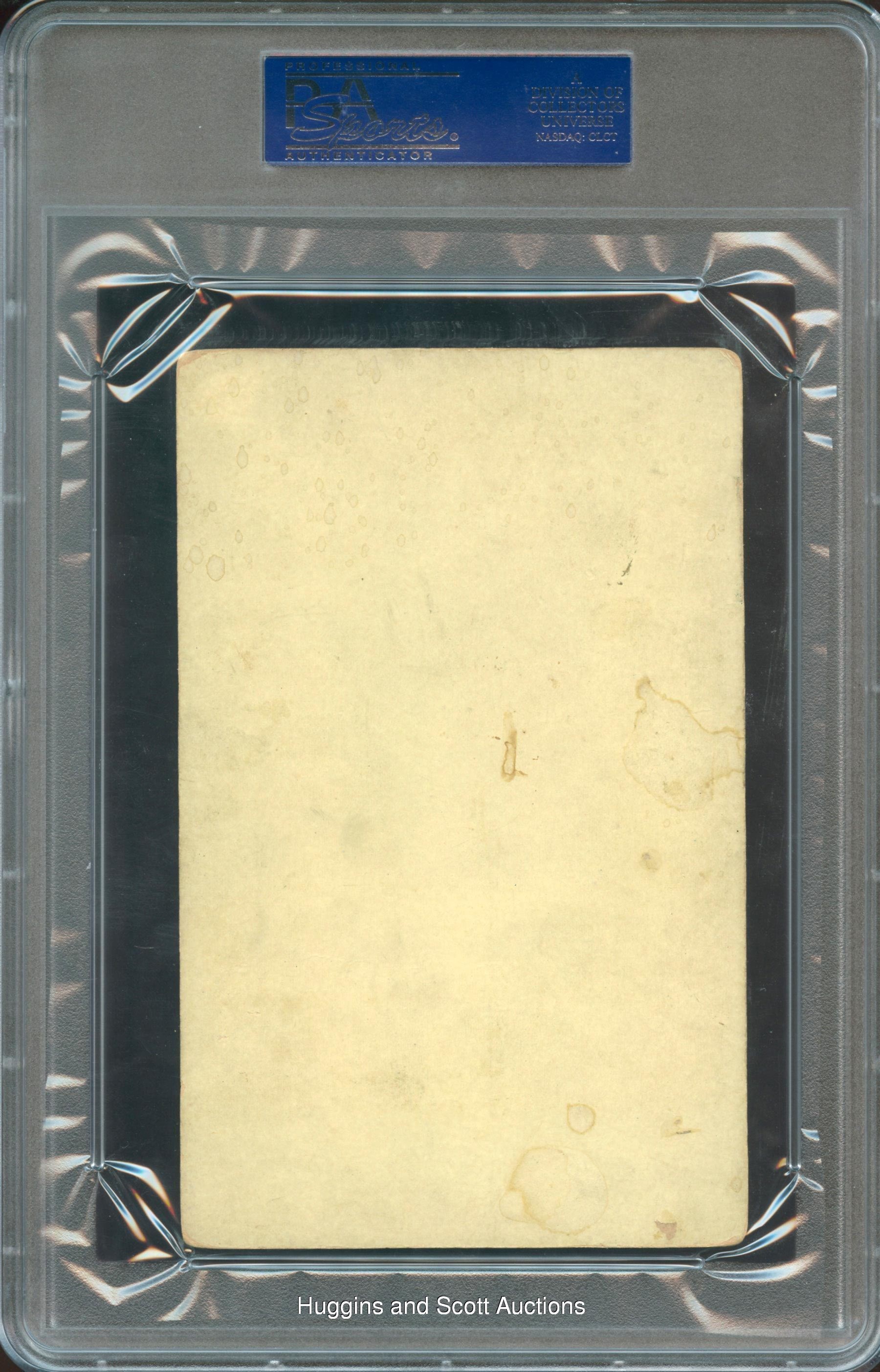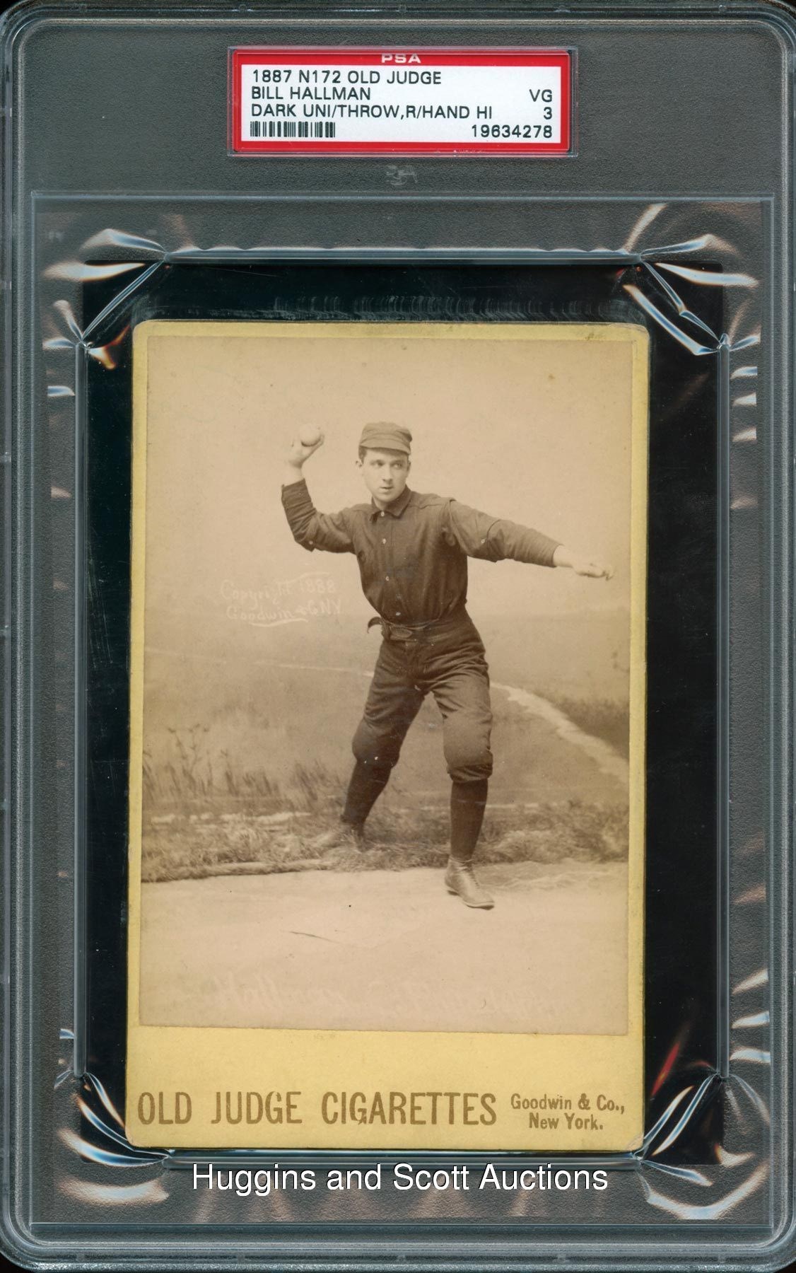 Reliable utility infielder, Bill Hallman, is depicted during the first of his fourteen major league seasons on this challenging 1888 N173 Old Judge Cabinet. Graded VG 3 by PSA, this (dark uniform, throwing right) pose is currently uncatalogued and is the only specimen judged by the service. The Philadelphia Quaker is portrayed heaving the ball against a pastoral setting. The clear image is framed by relatively crisp corners and edges. Despite incidental discoloration to the blank reverse, this 124 year-old premium still appears “none the worse for wear”. Perfect for the N specialist seeking a quality sample from this set. More on our website. The flip on the PSA holder incorrectly identifies this card as coming from the 1887 N172 Old Judge series.