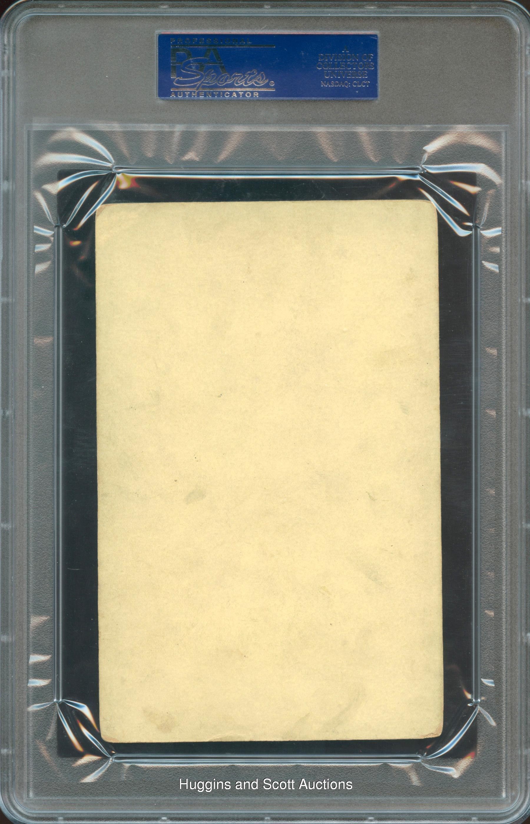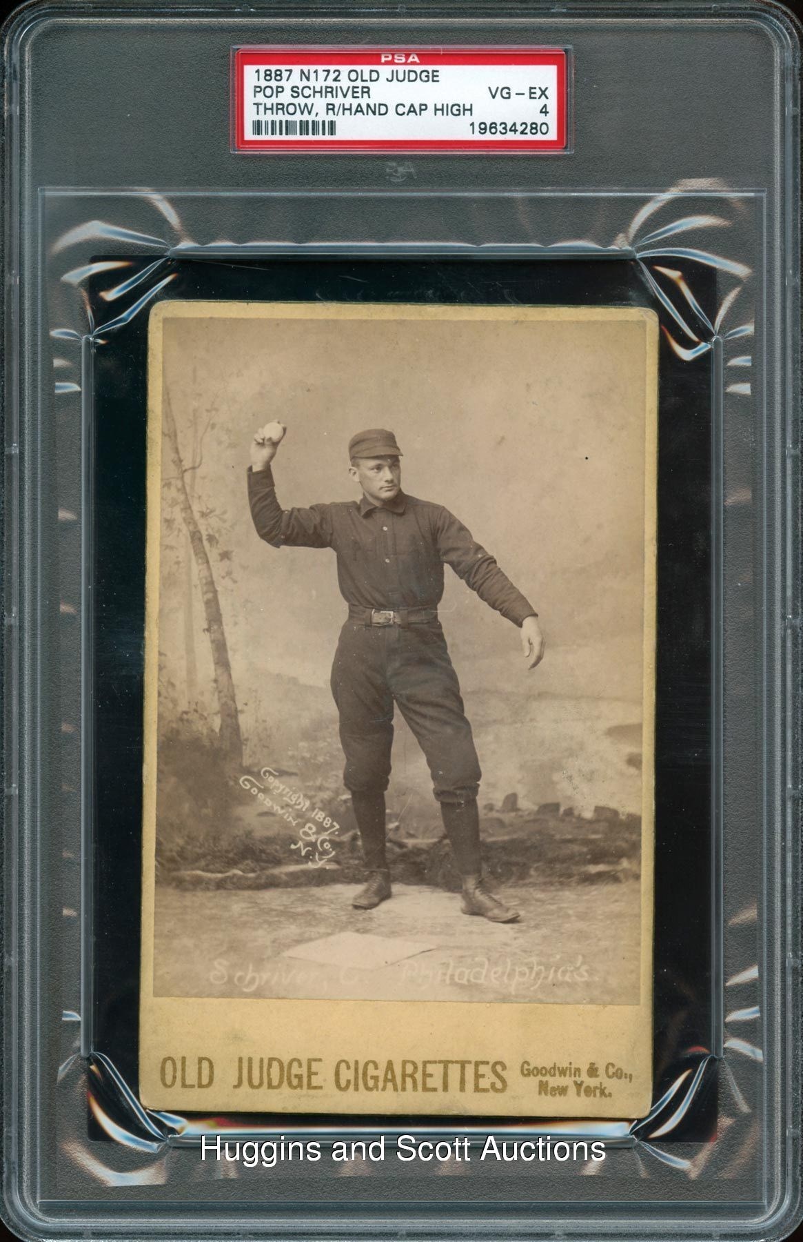 Graded VG-EX 4 by PSA. Backstop Pop Schriver sheds the “tools of ignorance” on the offered 1888 N173 Old Judge Cabinet. The (throwing right, cap high) pose is currently uncatalogued, and as such, is the only such specimen to be evaluated by PSA. The Philadelphia Quaker is portrayed heaving the ball against a forested backdrop. This cabinet is crease-free with even corner and edge wear along with a relatively clean blank back. Appealing sample which presents at the peak of the opined technical assessment. More on our website. The flip on the PSA holder incorrectly identifies this card as coming from the 1887 N172 Old Judge series.