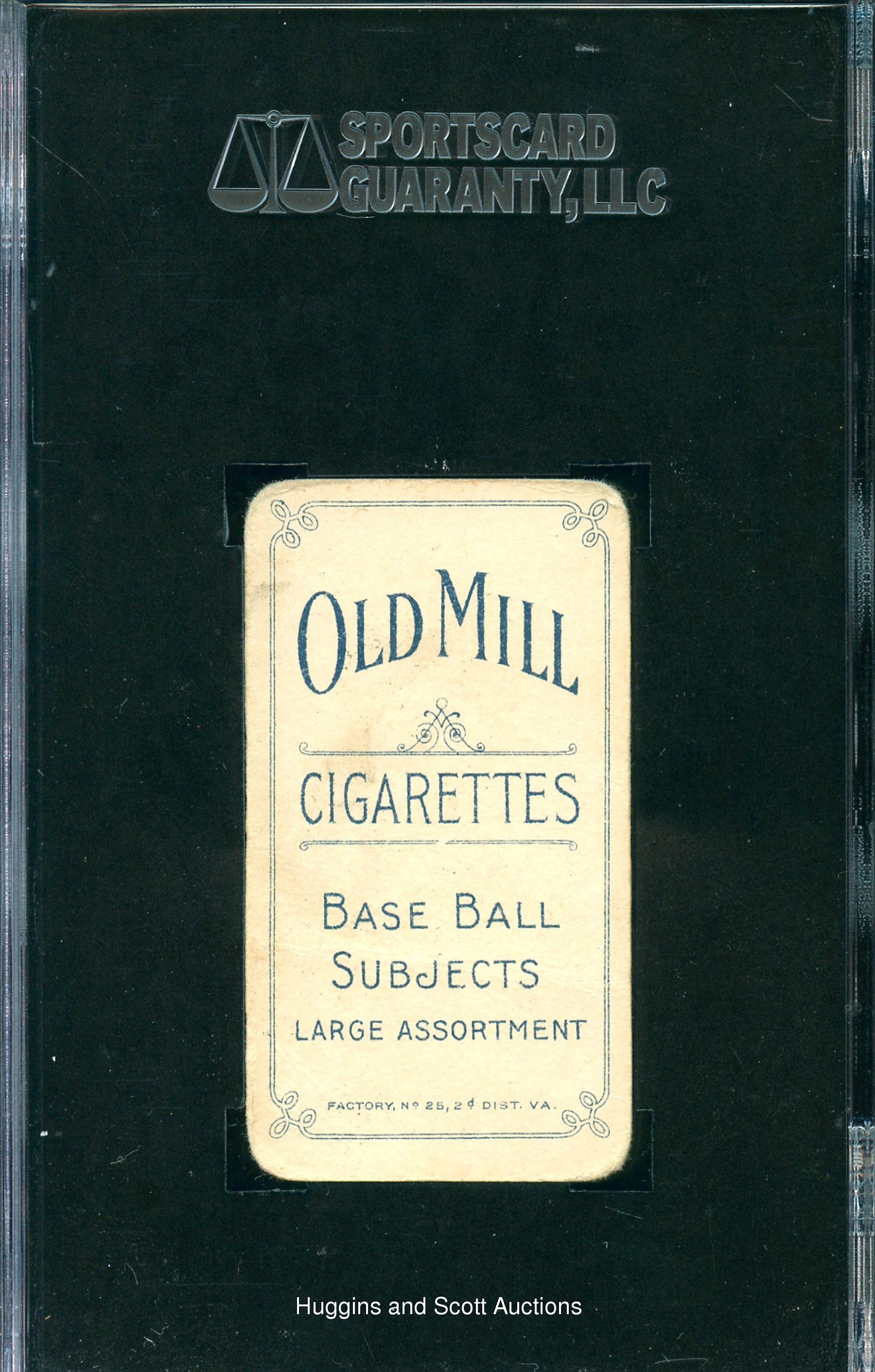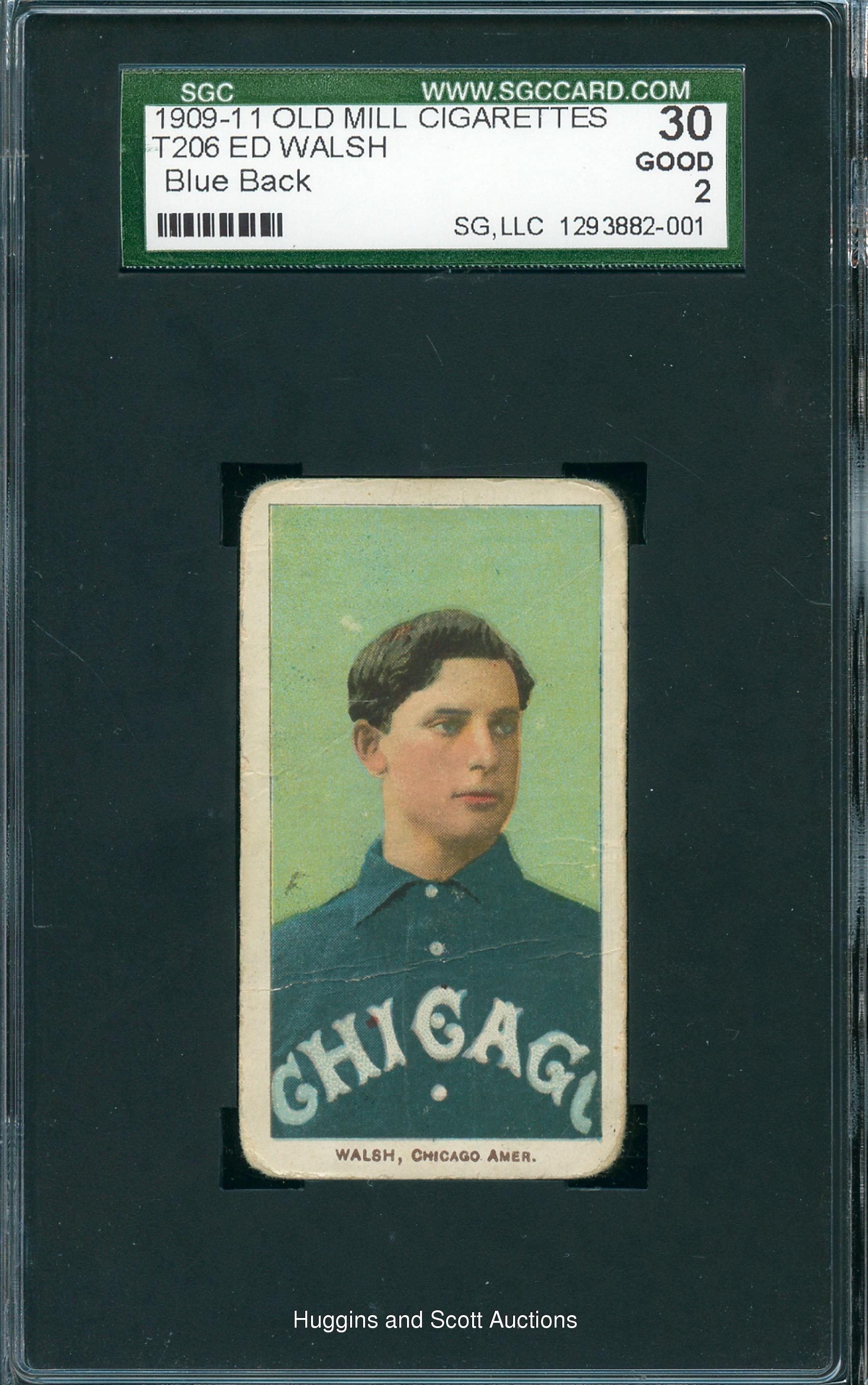 Since its inception in 1980, the annual National Sports Collectors Convention has been home to several of the most acclaimed exhibitions in hobby history. Regardless of location, the sheer spectacle of the event lends the collecting public access to some of the most iconic sports cards in the industry along with the prospect of viewing new and significant finds. Within hours of opening the 2012 event in Baltimore, rumors began to swirl of a possible new addition to the already legendary 1909-11 T206 White Borders lineup. Over the decades, “The Monster” has yielded multiple important variations for advanced collectors to pursue on their wantlists. With over 520 cards, the “Big Four”, nearly 40 different advertising backs and countless other oddities, the prospect of adding another jewel to undoubtedly the most revered pre-war set can be accurately described as “game changing”. The 1909-11 T206 Old Mill advertising back is most commonly found with black text while a handful of brown versions have also traded for considerable sums. While assumed to exist only in those two colors, the National Convention unearthing of an Old Mill Blue Back variation picturing Ed Walsh caused quite a stir in the pre-war community. Within moments of its unveiling, this new arrival became the subject of considerable discussion on authoritative internet message boards. Could the 1909-11 T206 Ed Walsh Old Mill (Blue Back) be yet another addition to this famed set? Our consignor enlisted Sportscard Guaranty, LLC, trusted third-party grading service for review. After careful consideration, the weighty verdict of the authenticator confirmed that the offered 1909-11 T206 White Borders Ed Walsh Old Mill (Blue Back) is authentic and unaltered. Graded 30 Good 2 by SGC. The possibly unique variant of Hall of Fame hurler “Big” Ed Walsh of the Chicago White Sox exhibits bright surface colors and intricate uniform detailing. Moderate, but even perimeter wear along with limited creasing consistent with the technical grade does not adversely impact the overall presentation. The all-important reverse displays pronounced typeface and is absent of any significant wear.