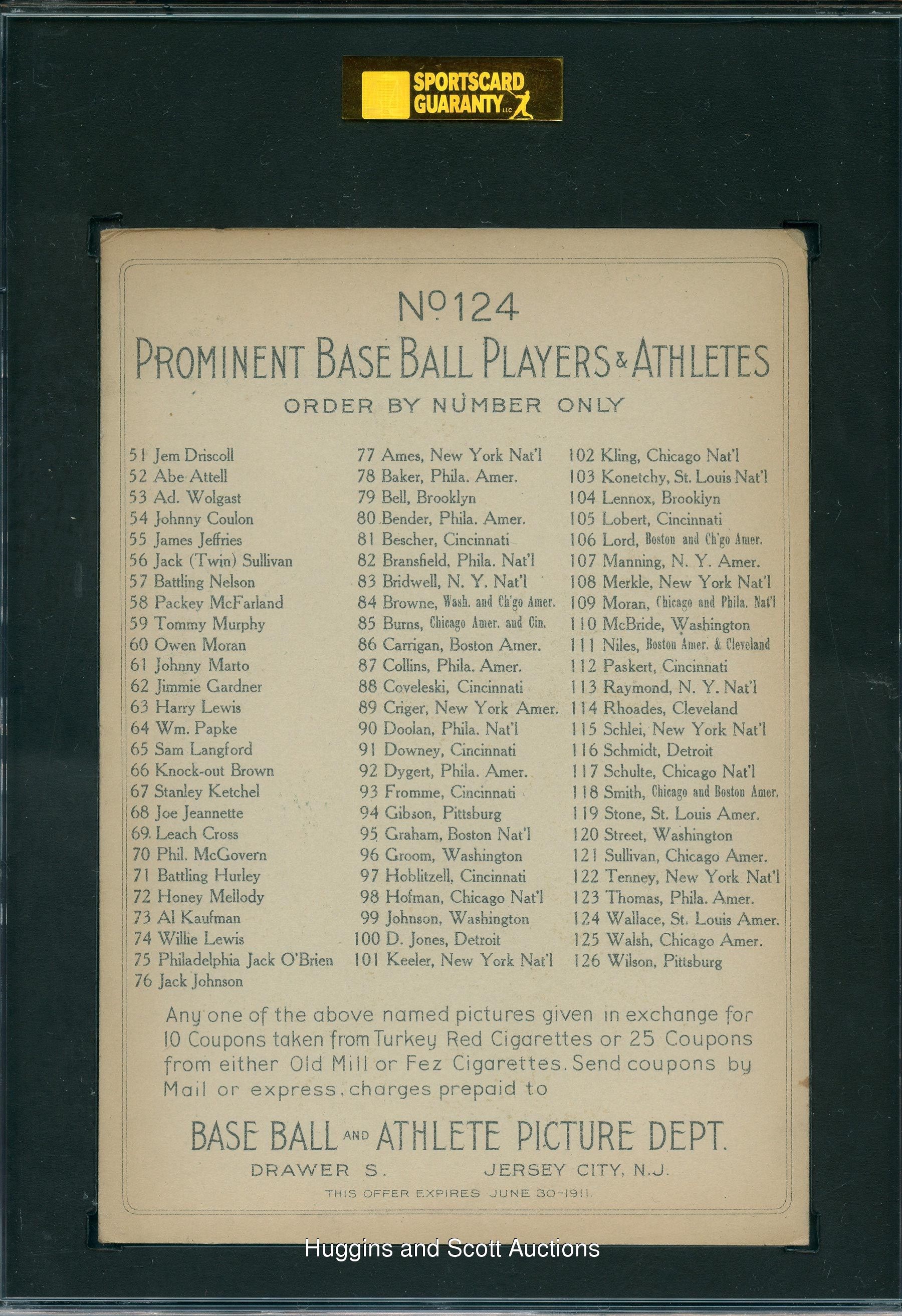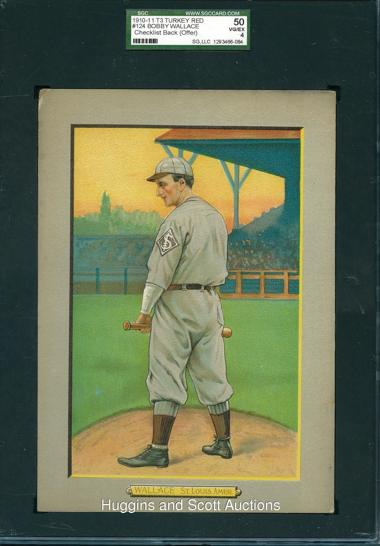 Graded 50 VG-EX 4 by SGC. Although he never played in a Fall Classic, Bobby Wallace emerges victorious on this lovely 1910-11 T3 Turkey Red Cabinets premium with a Checklist back. The 1953 Hall of Famer is at the ready on this crease-free keepsake hallmarked by a captivating obverse color scheme. The reverse is bright and accented by pronounced black type. One of only three at the grading tier with none better.