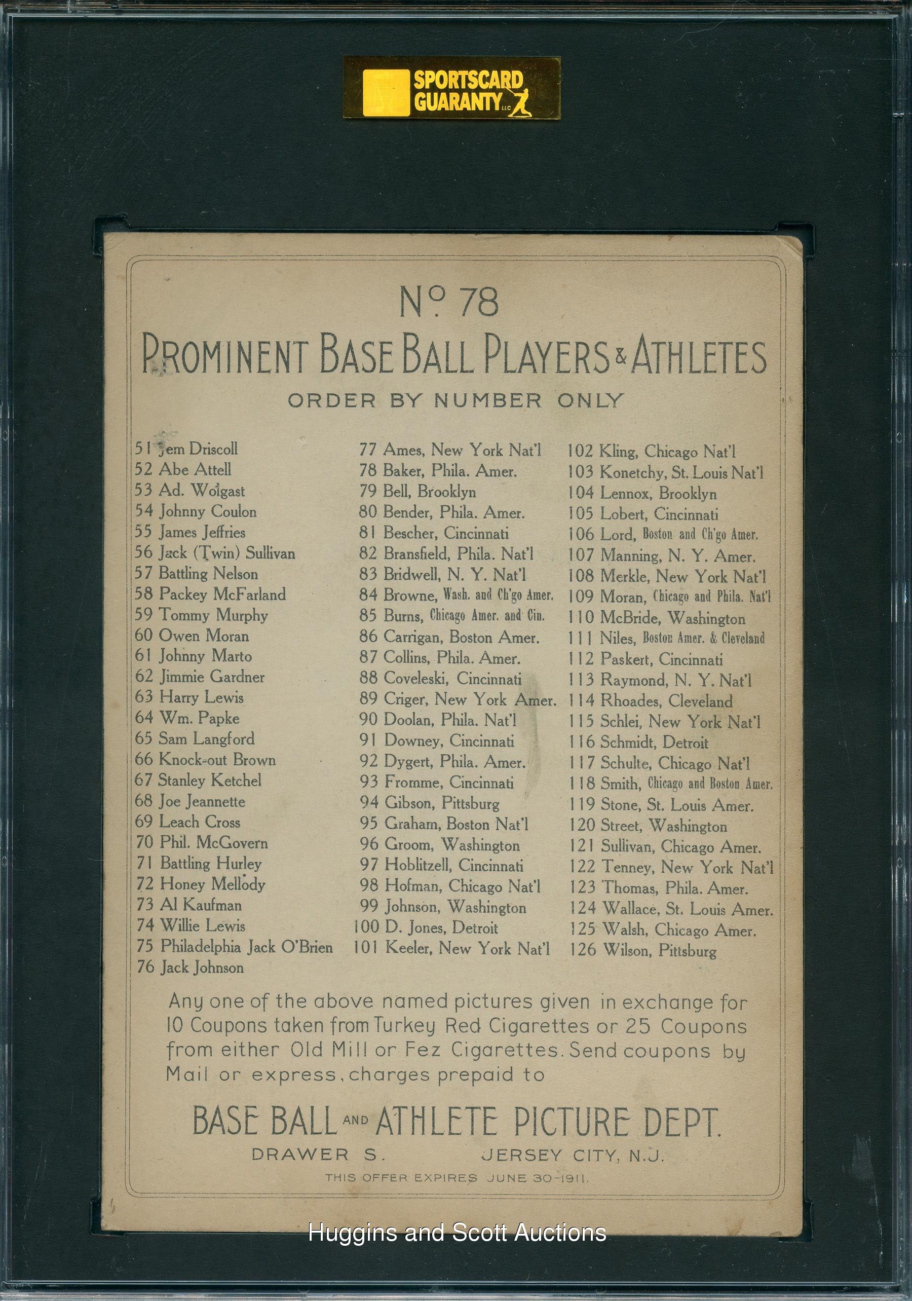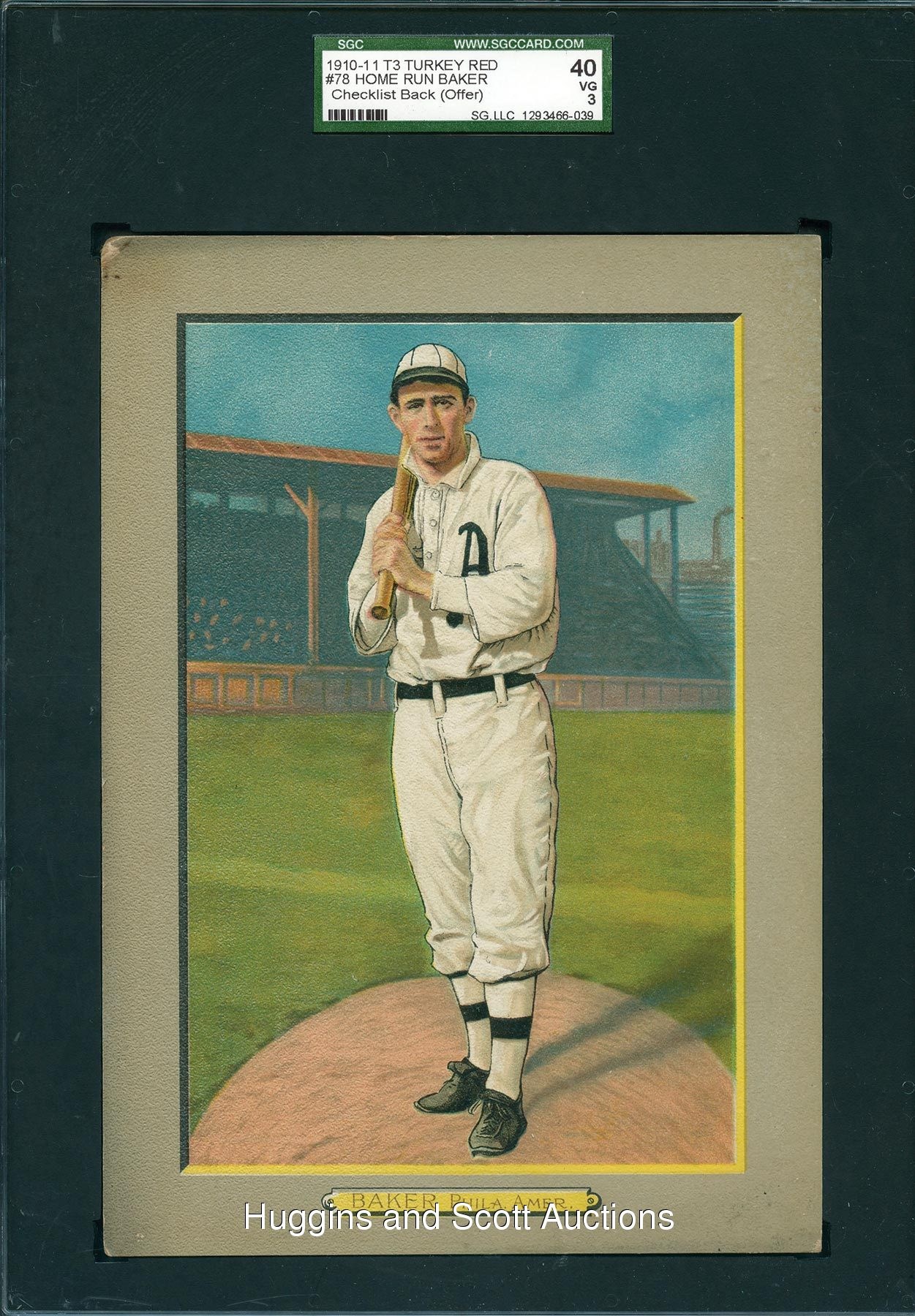 Graded 40 VG 3 by SGC. Circle the bases with Frank (Home Run) Baker on this 1910-11 T3 Turkey Red Cabinets #78 premium with a Checklist back. The colorful full body illustration of the Trappe, Maryland native is crease-free with moderate, but even corner wear. The reverse is relatively bright with unobstructed black type. One of two at the grading level of the Hall of Famer with only two better.