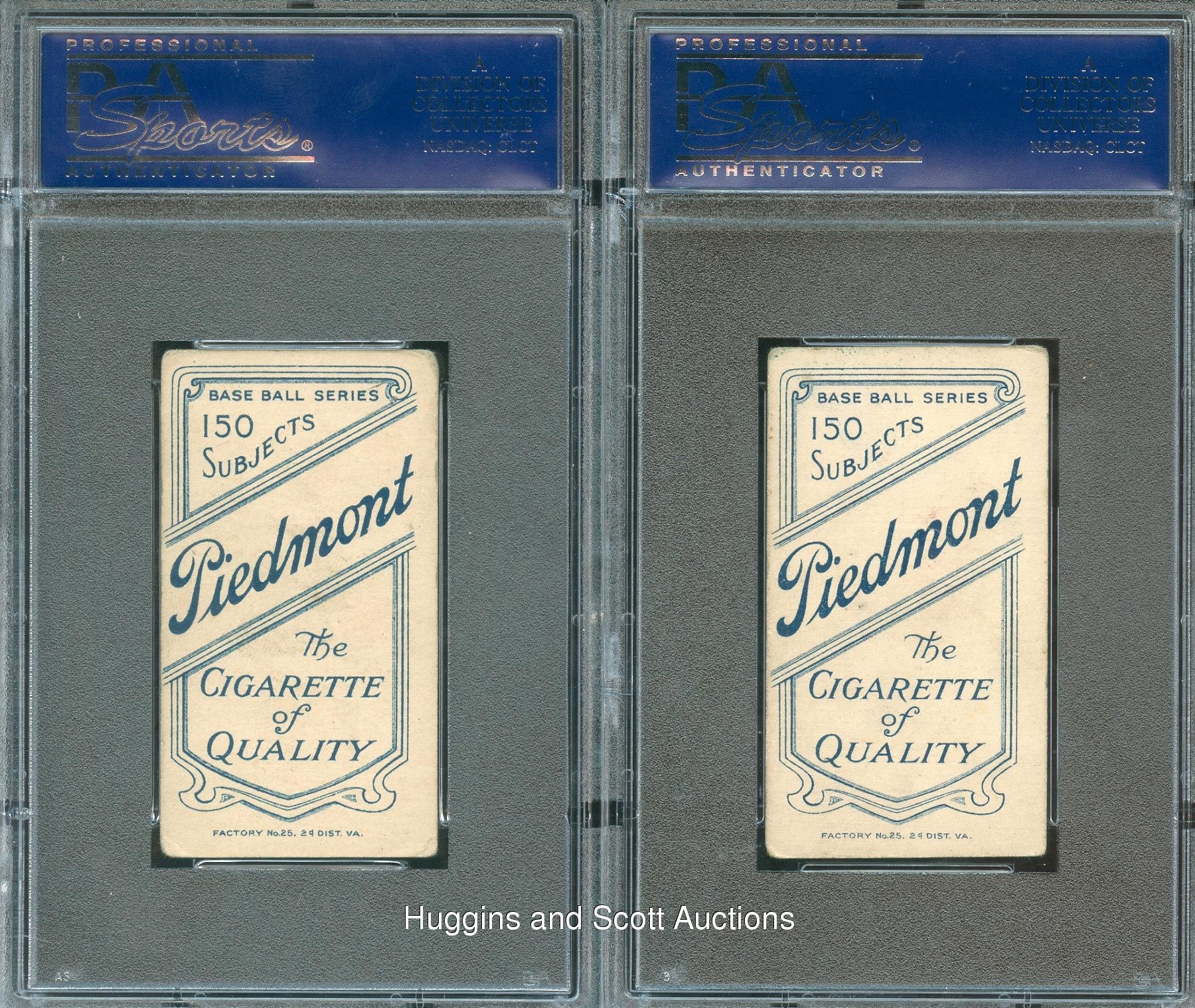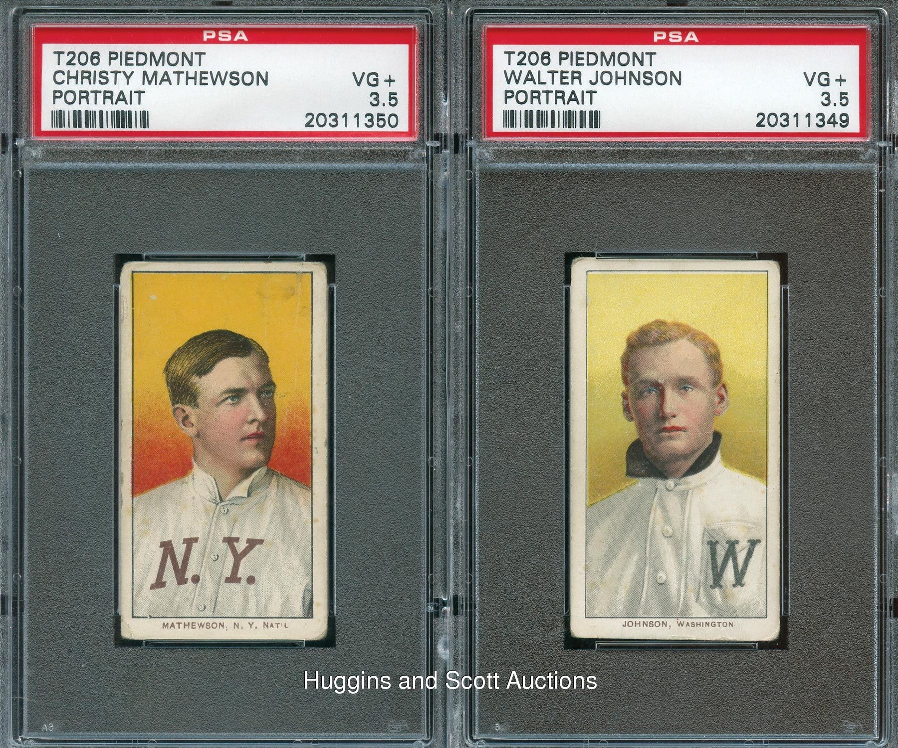 Each graded VG+ 3.5 by PSA. Formidable pairing of "Class of 1936" moundsmen featuring 1909-11 T206 White Border portraits of Walter Johnson and Christy Mathewson. Each century-old treasure is crease-free with clear imagery and crisp Piedmont 150 Subjects advertising backs.